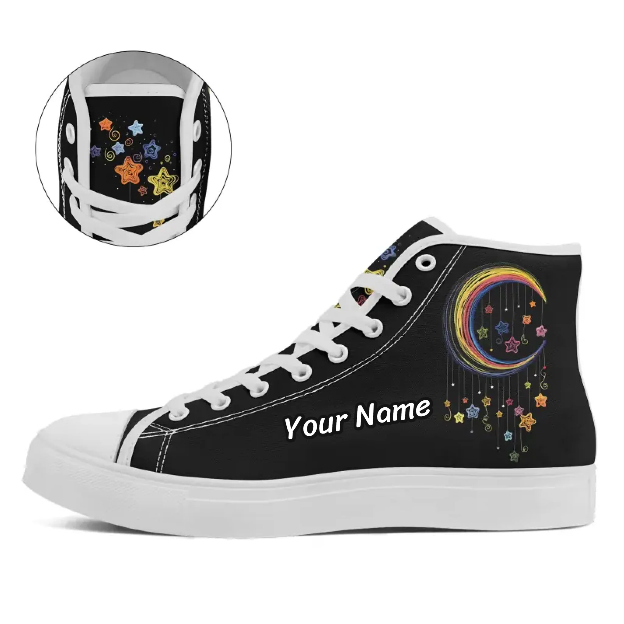 Dreamy Moon & Dangling Stars High-Tops, Artistic Rainbow Night Sky Festival Shoes FN024-25009066