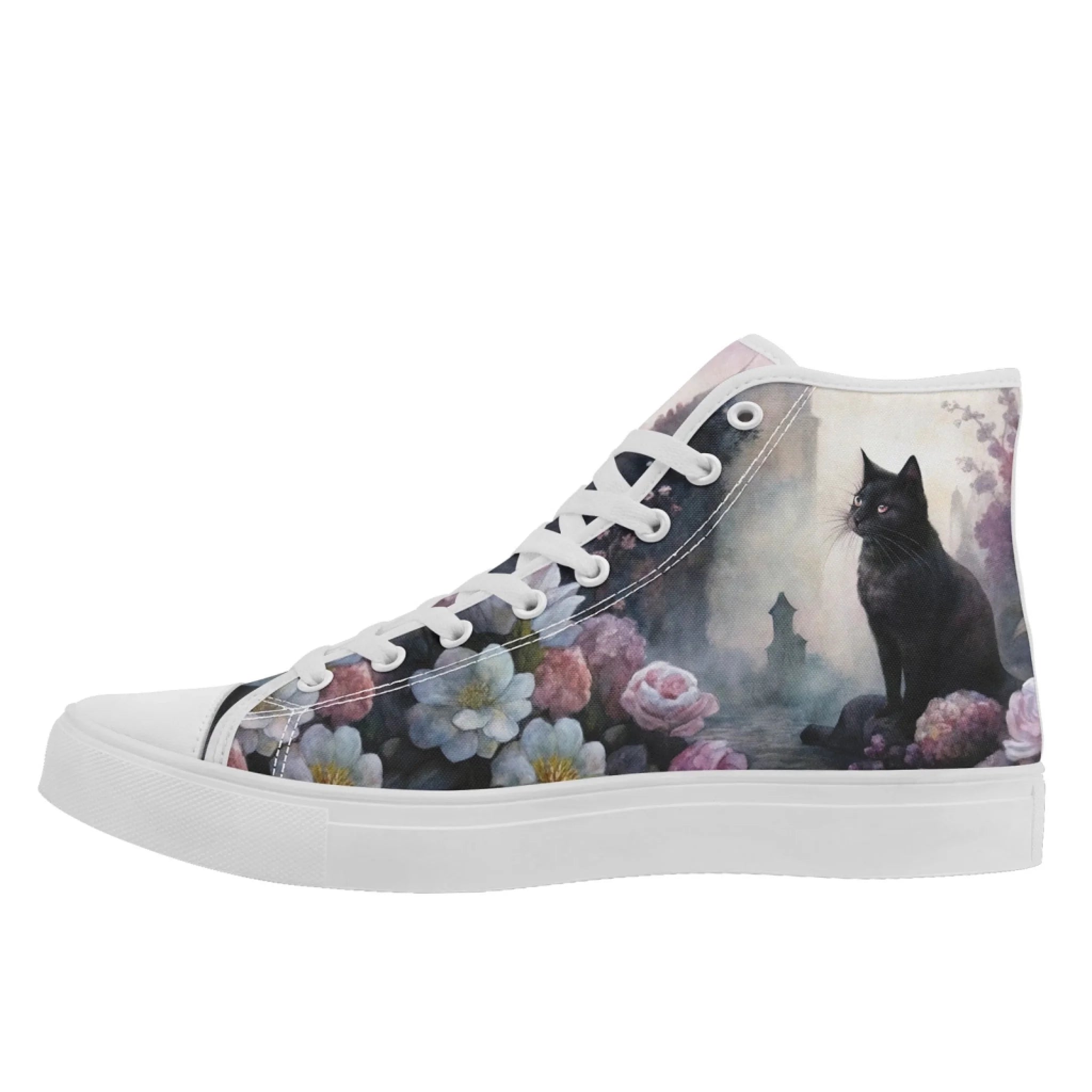 Gothic Black Cat in a Moonlit Garden High-Top Sneakers, Romantic Whimsigoth Floral Shoes FN024-25025147