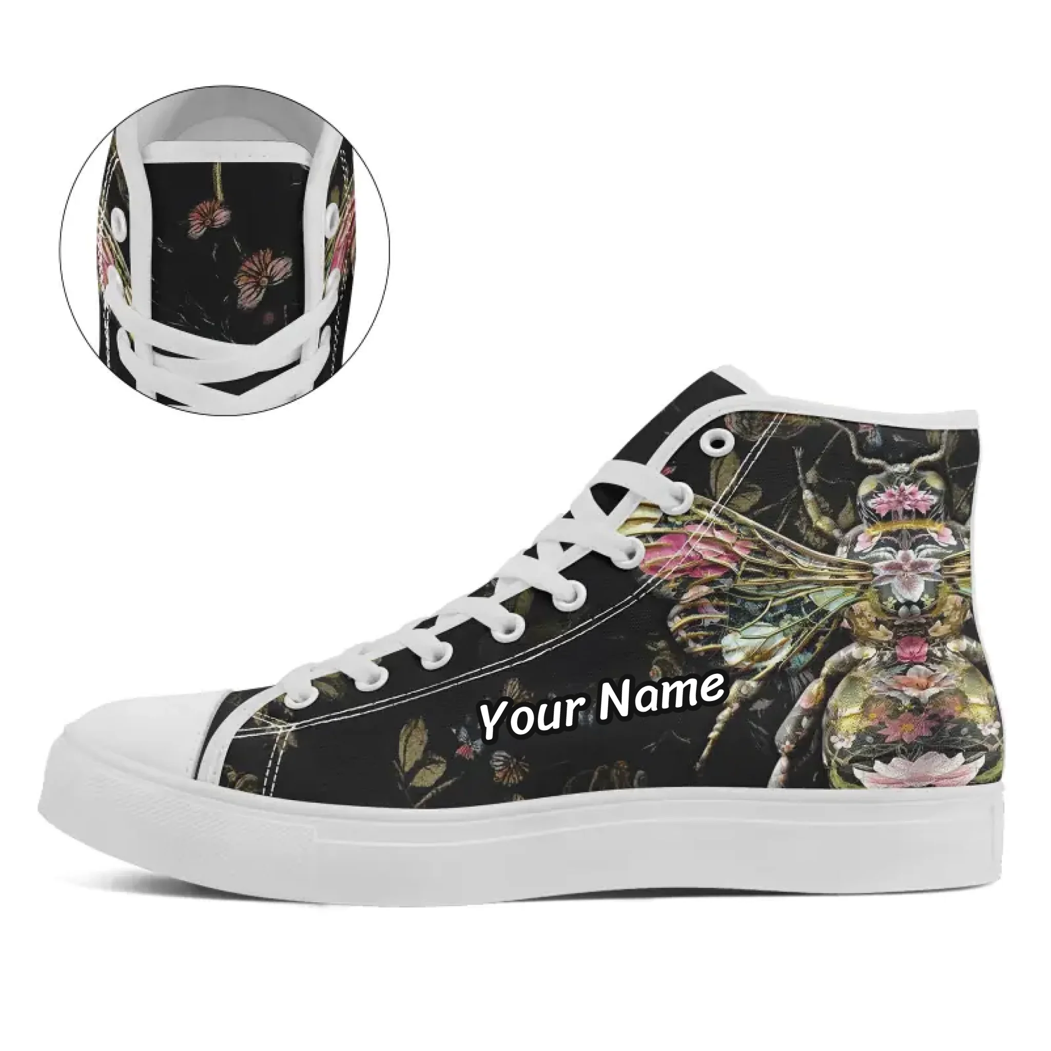 Surreal Floral Bee High-Top Sneakers, Dark Botanical Collage Art Print Canvas Shoes FN024-25020198