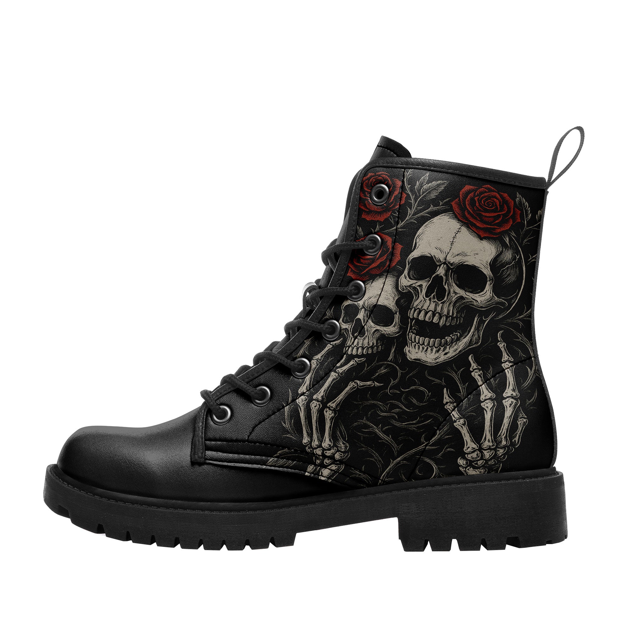 Gothic Skull & Red Rose Combat Boots - Skeleton Hand Tattoo Art Shoes BOOTS-25025054-4