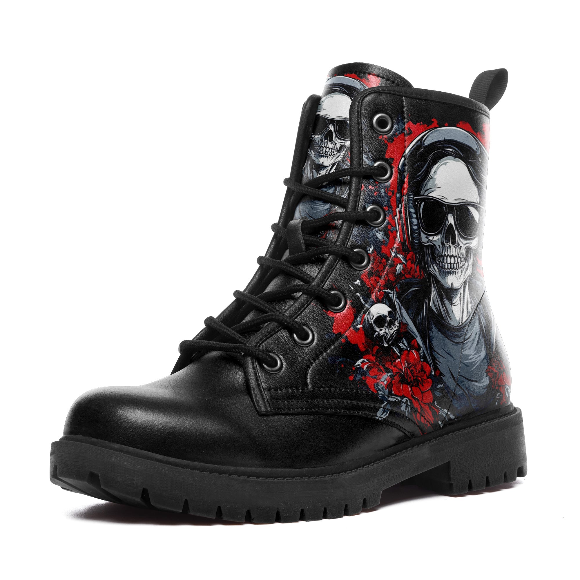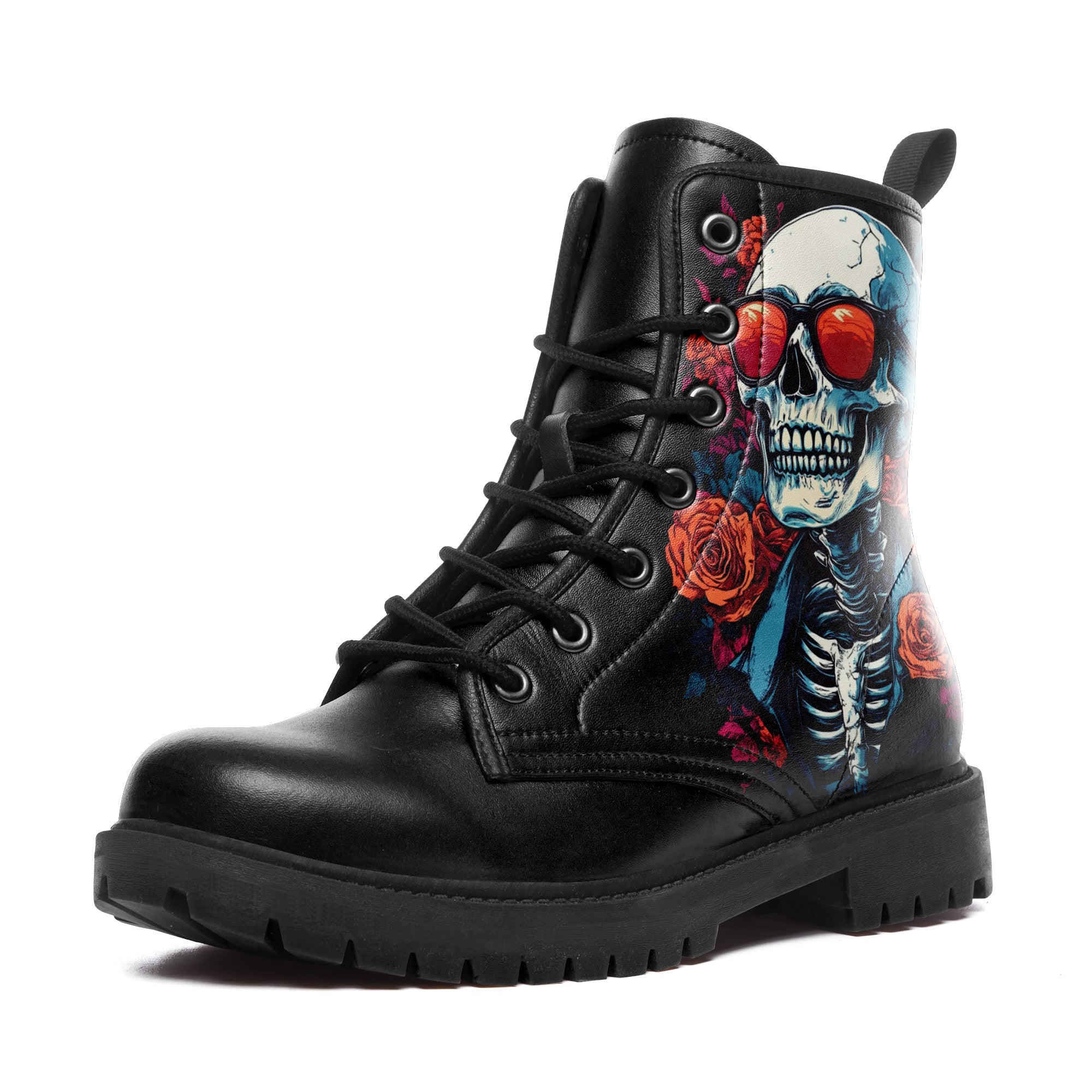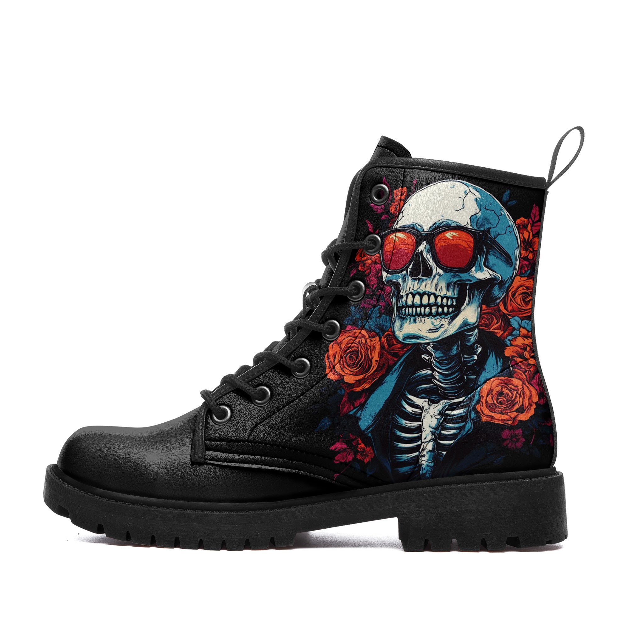 Cool Skeleton Wearing Red Sunglasses Combat Boots - Rocker Floral Shoes BOOTS-24027008