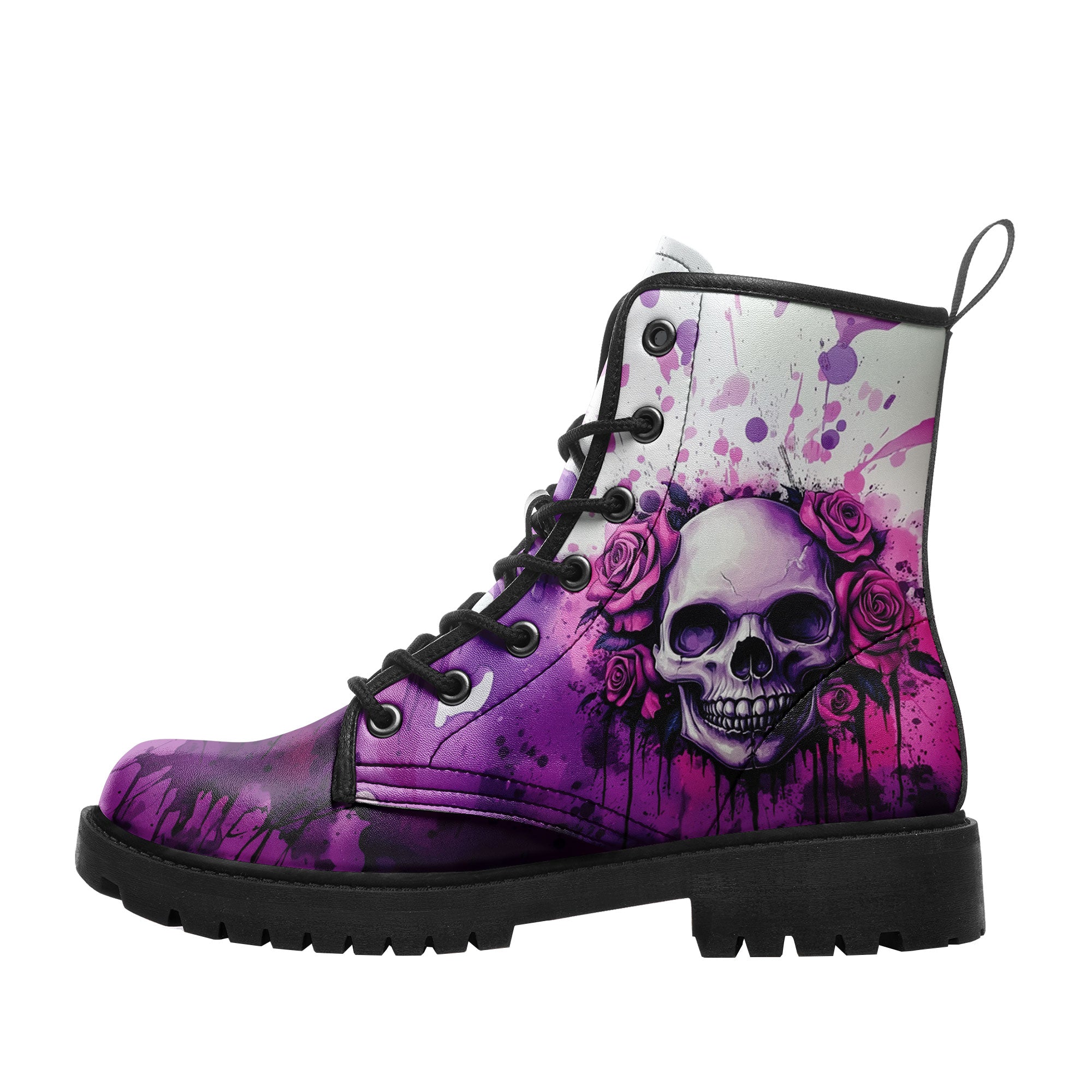 Purple Watercolor Skull & Roses Combat Boots - Artistic Splatter Shoes 058-6-25009073-10