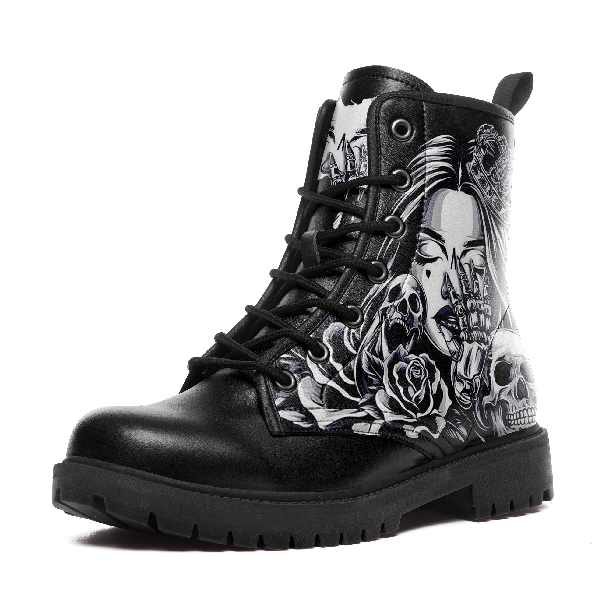 Skeleton Queen with Floral Crown Combat Boots - Monochrome Gothic Art Shoes BOOTS-240270014