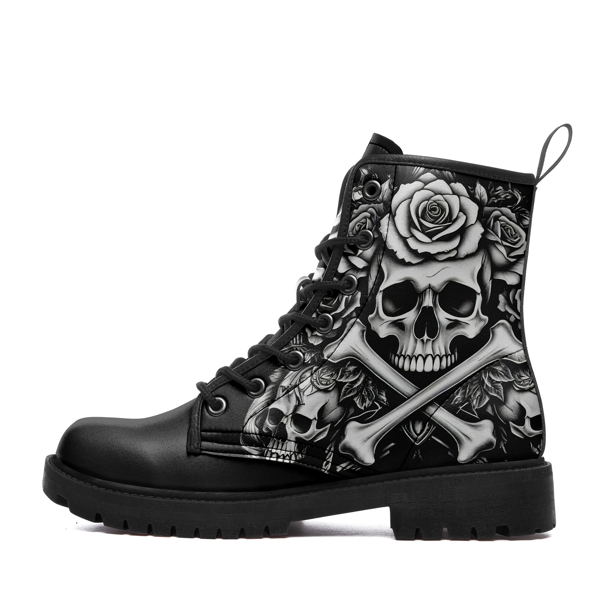 Gothic Skull & Crossbones Rose Combat Boots - Monochrome Tattoo Art Shoes BOOTS-25027041-2