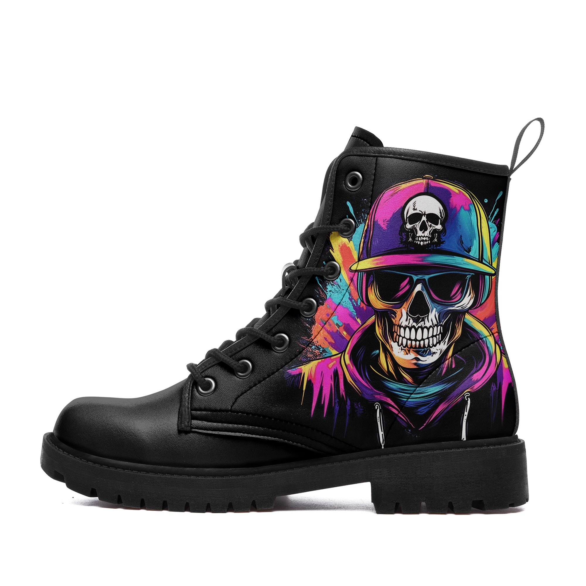 Graffiti Skull with Cap & Sunglasses Combat Boots - Urban Paint Splatter Shoes BOOTS-24027009
