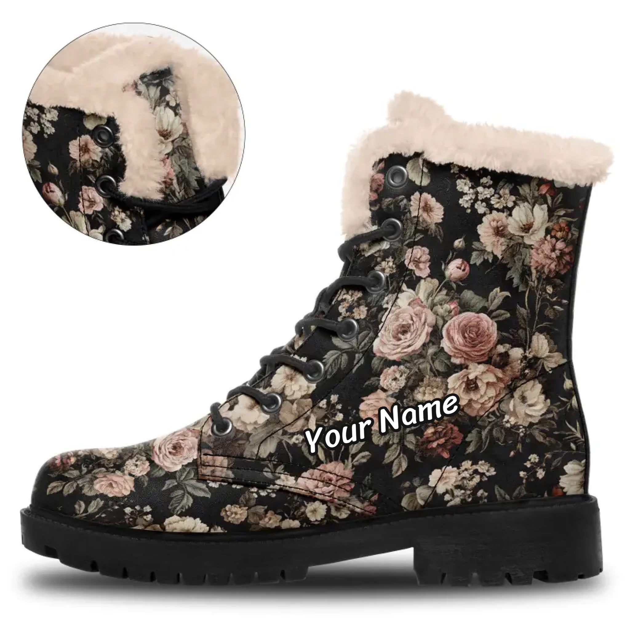 Vintage Floral Fleece Lined Winter Boots, Dark Botanical Romantic Goth Winter Shoes 058-1-25009069