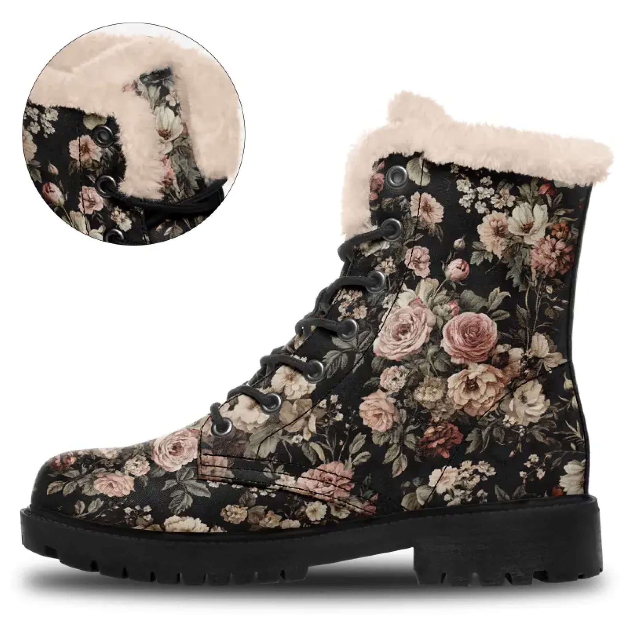 Vintage Floral Fleece Lined Combat Boots, Dark Botanical Romantic Goth Winter Shoes 058-1-25009069