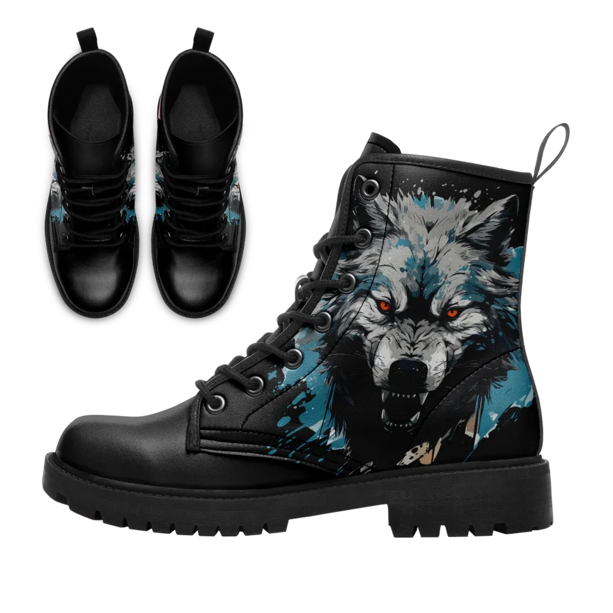Fierce Alpha Wolf Combat Boots, Red-Eyed Snarling Wolf Print Biker Style Boots BOOTS-25025121