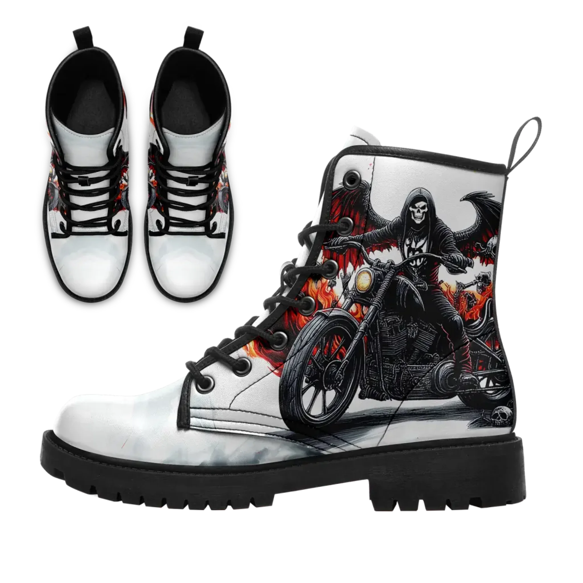 White Combat Boots with Red Hooded Skeleton - Urban Reaper Streetwear Shoes BOOTS-24027007