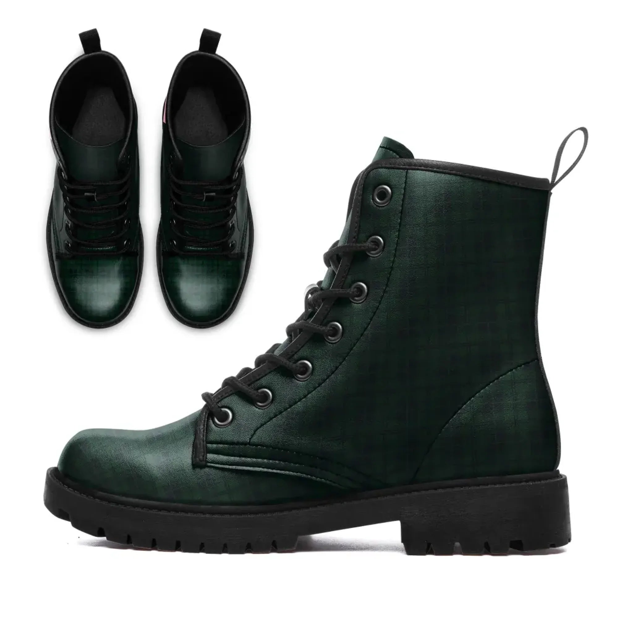 Dark Forest Green Plaid Combat Boots, Gothic Punk Tartan Style Vegan Leather Boots 058-6-25020195