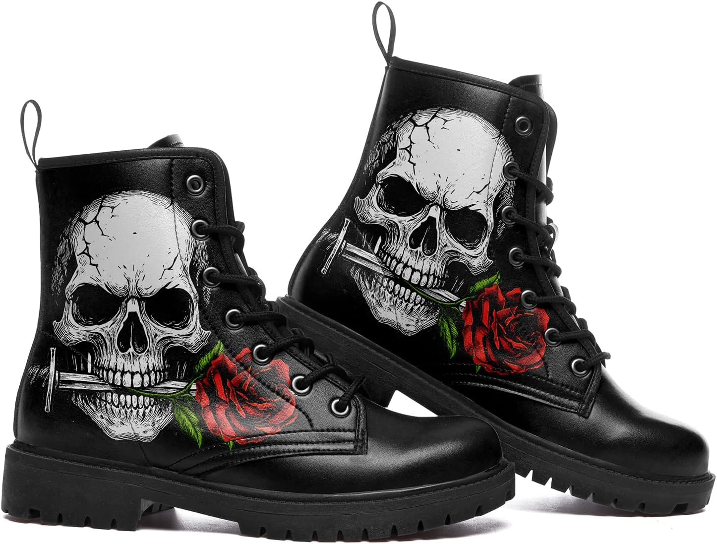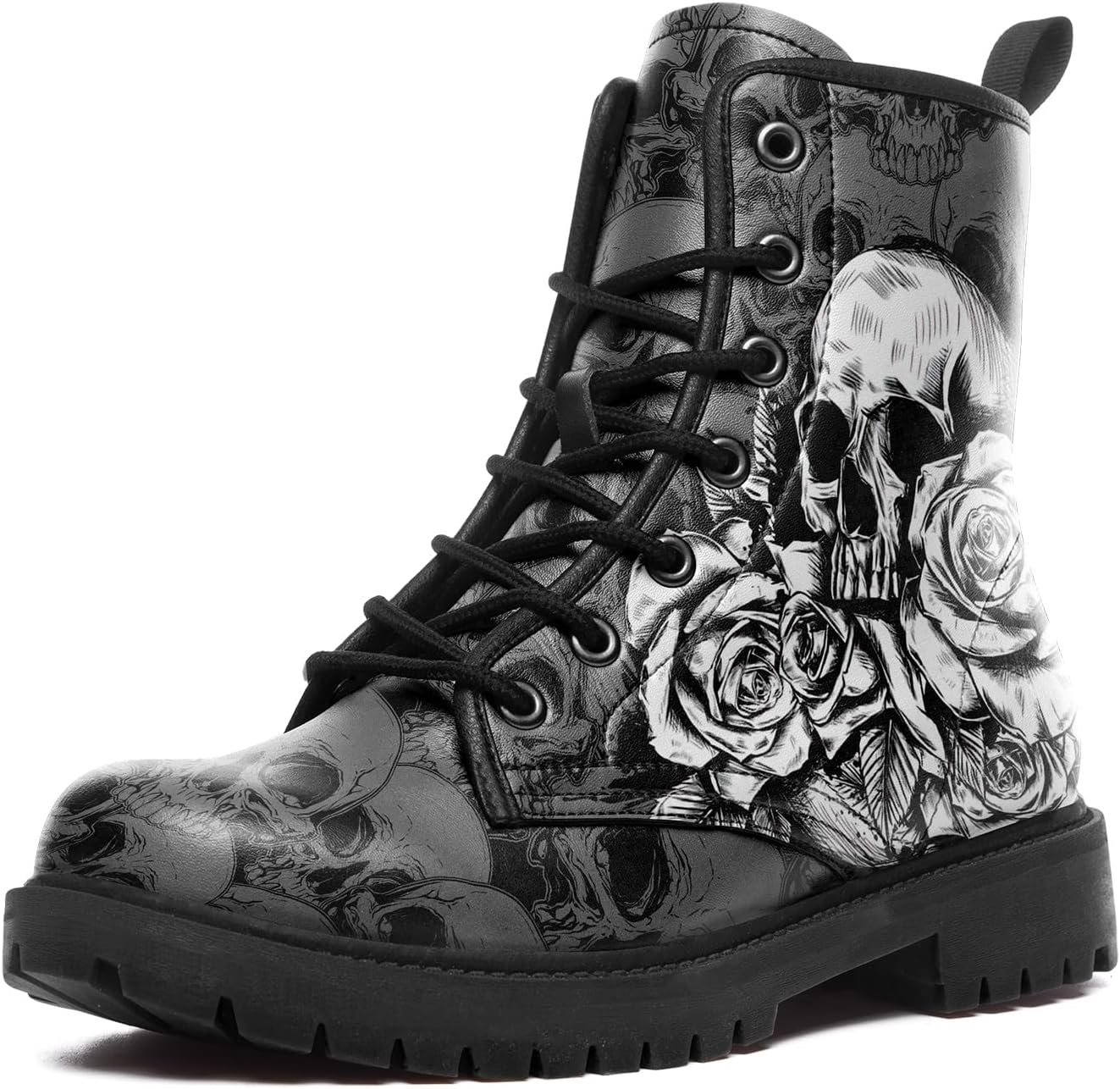 Skull Combat Boots for Men & Women Slip-Resistant Gothic Punk Style Cool Chunky Black Boots Vegan Leather Work Ankle Booties