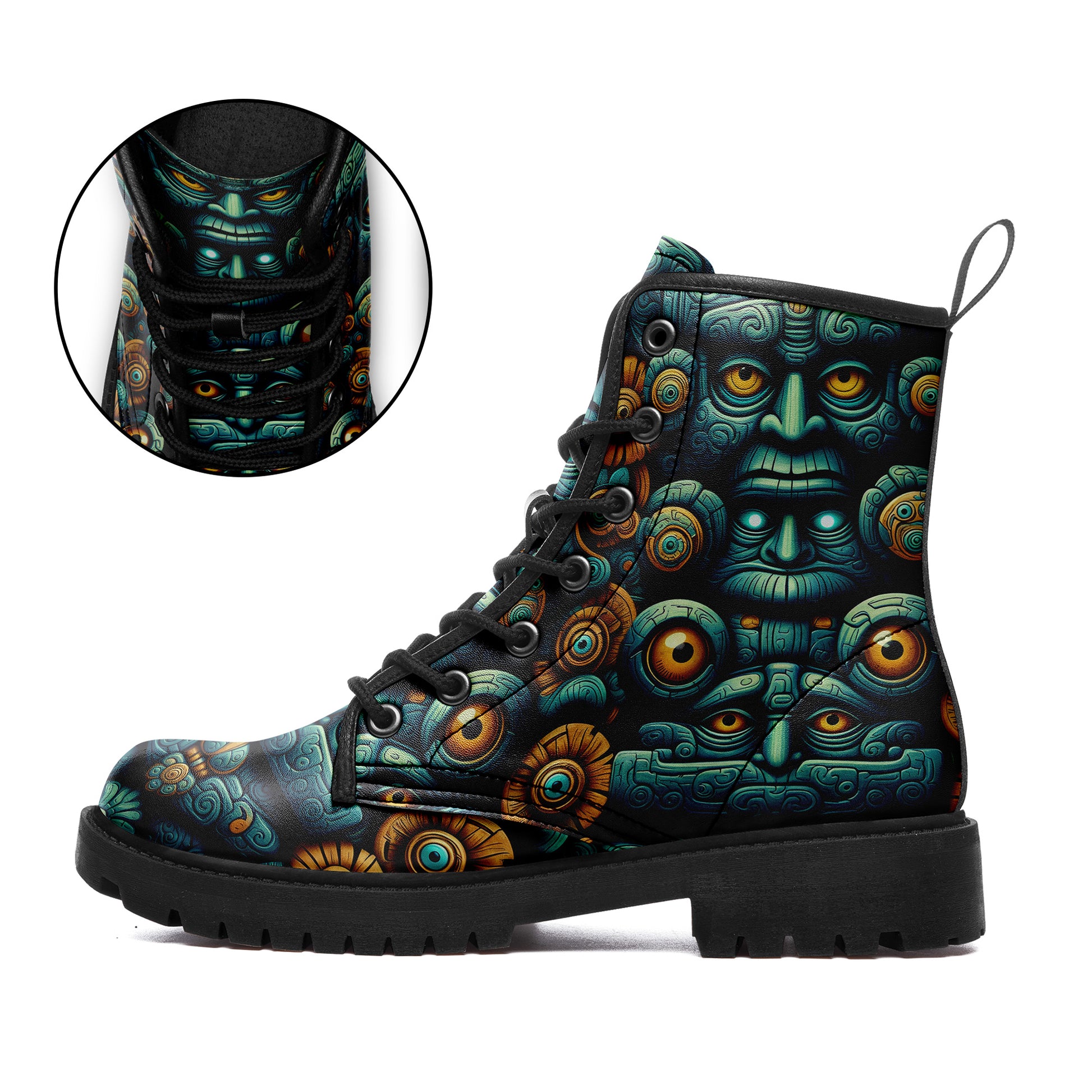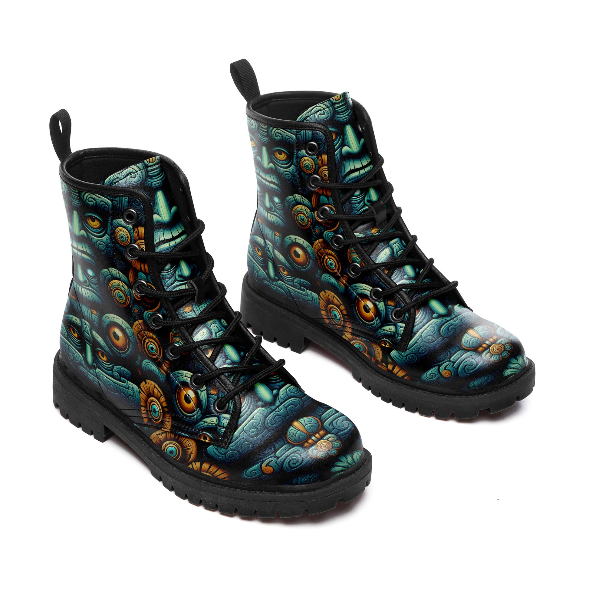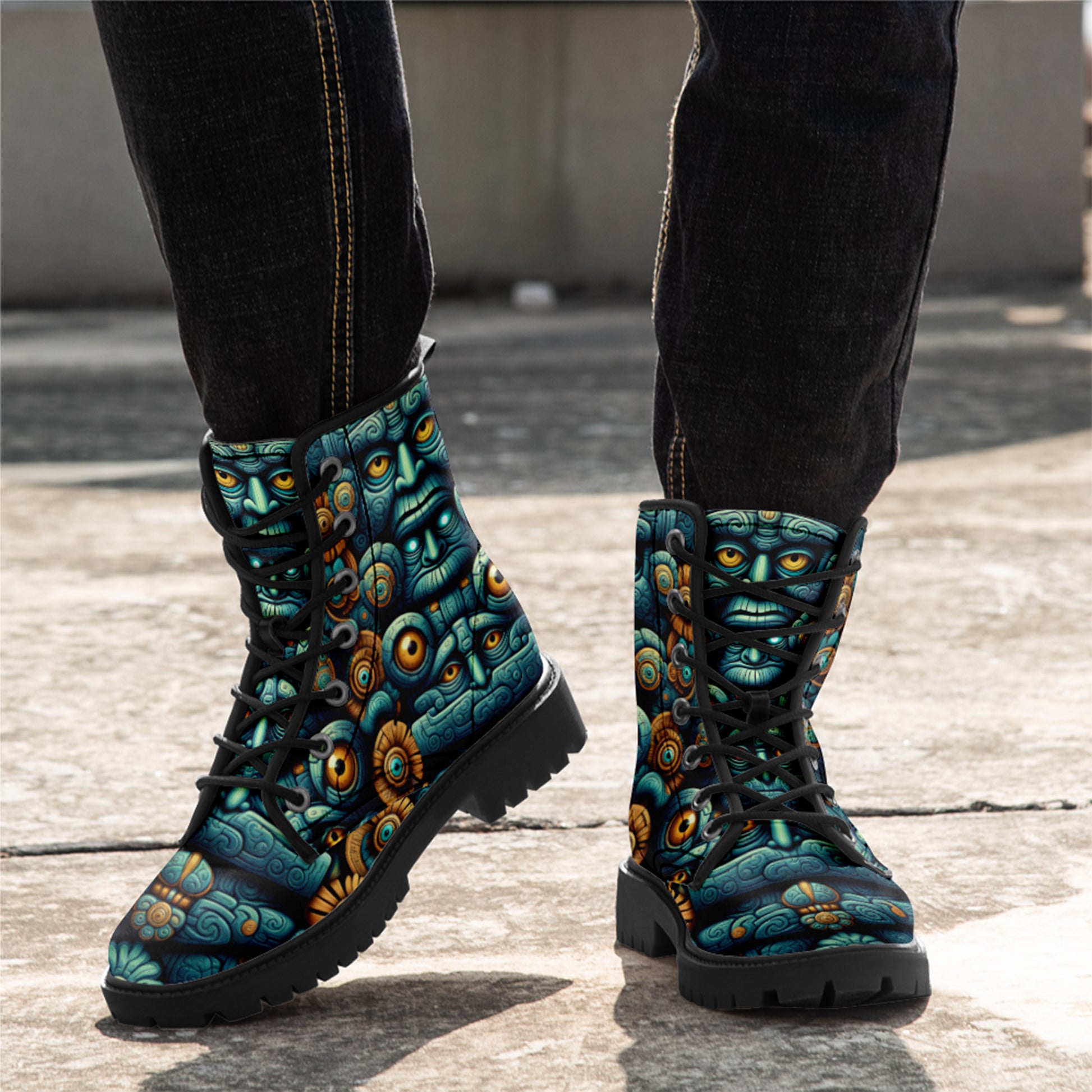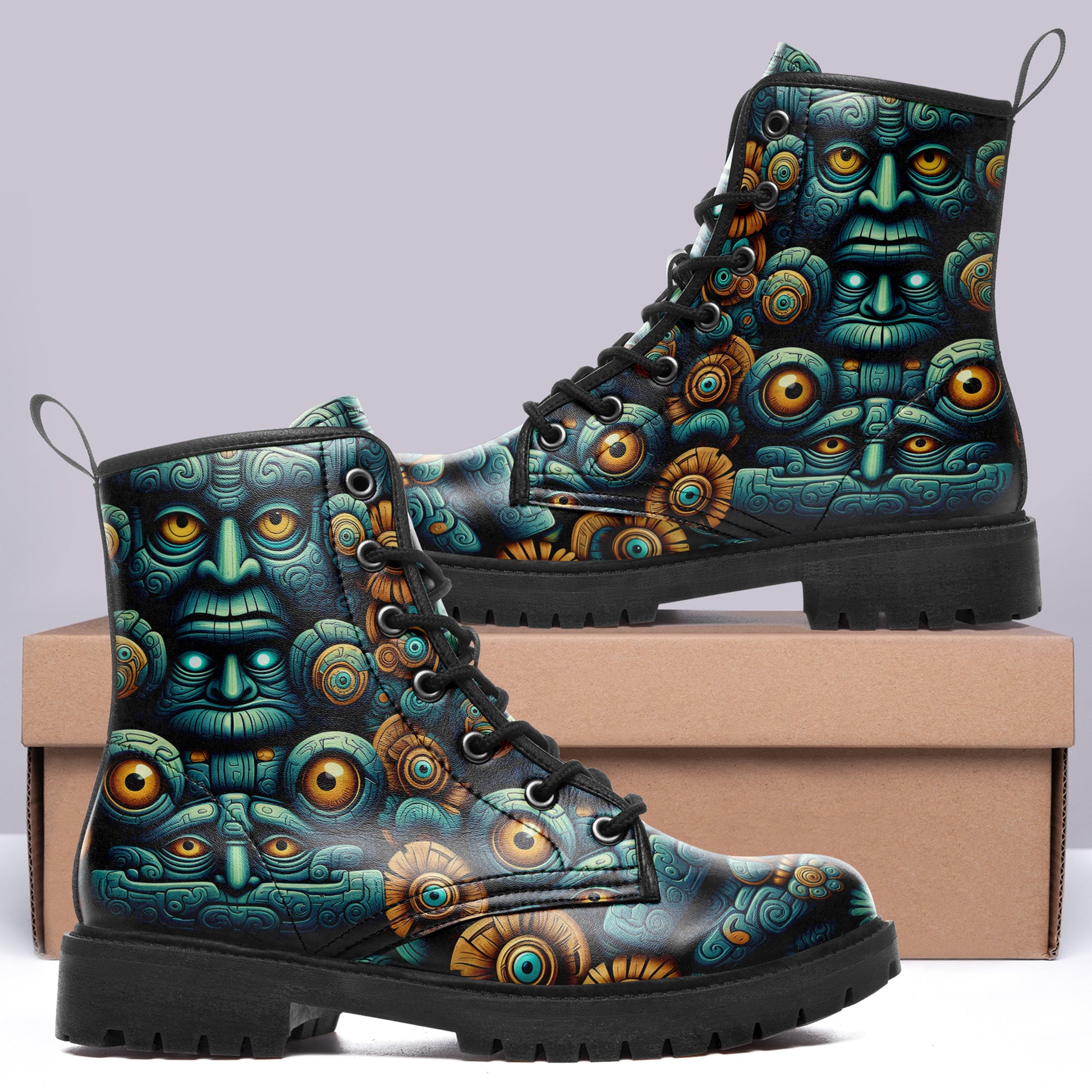 Unearth a legend with every step. These incredible combat boots feature an intricate, all-over print inspired by the **stone carvings of ancient Mesoamerican civilizations**.