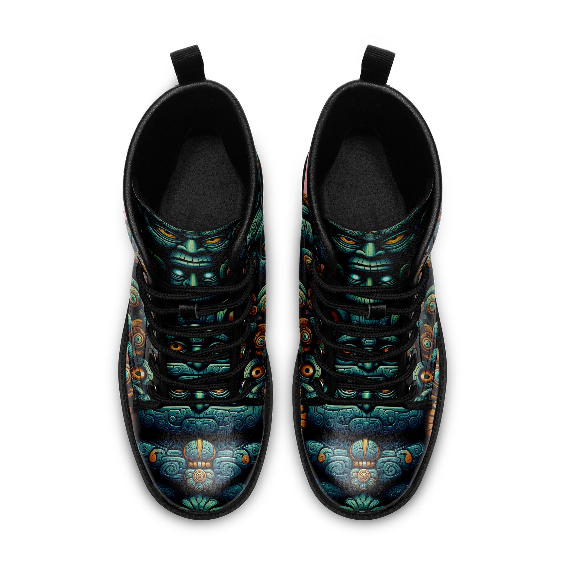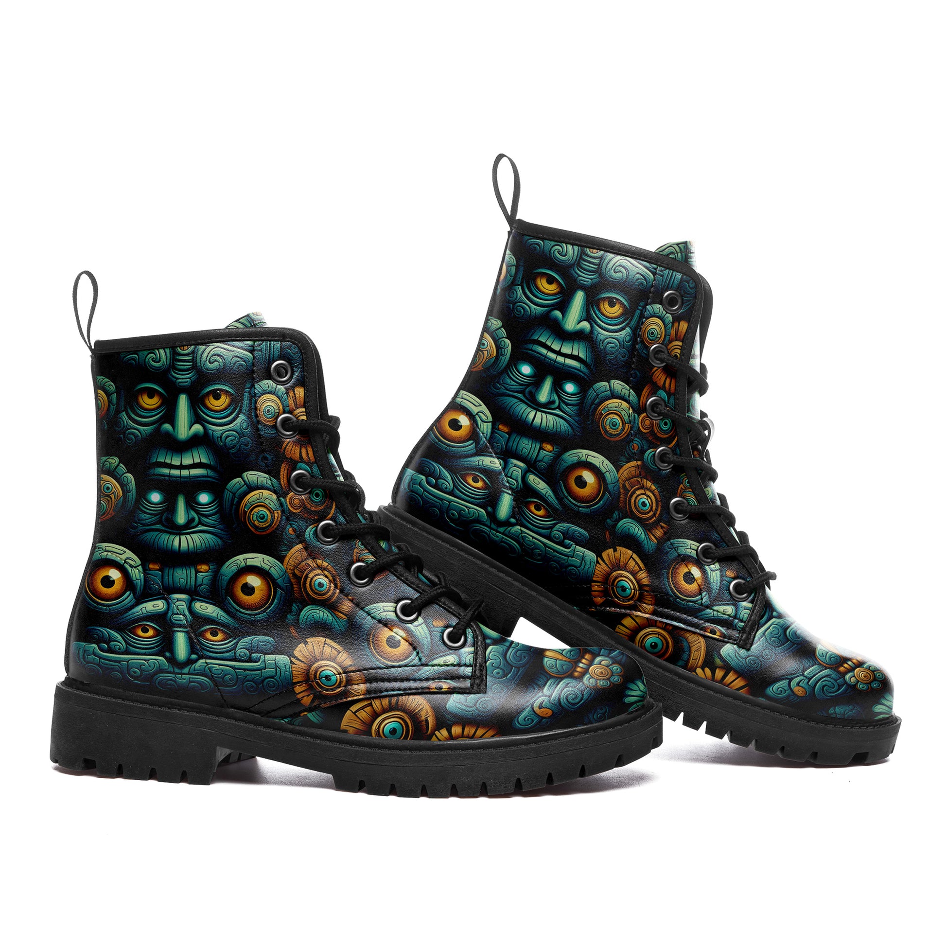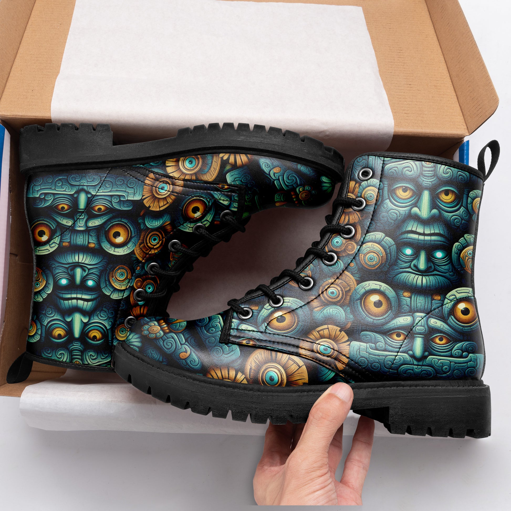 Unearth a legend with every step. These incredible combat boots feature an intricate, all-over print inspired by the **stone carvings of ancient Mesoamerican civilizations**.