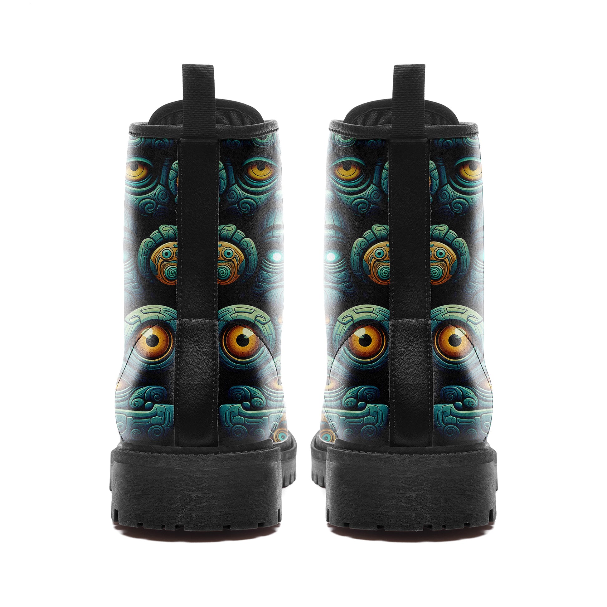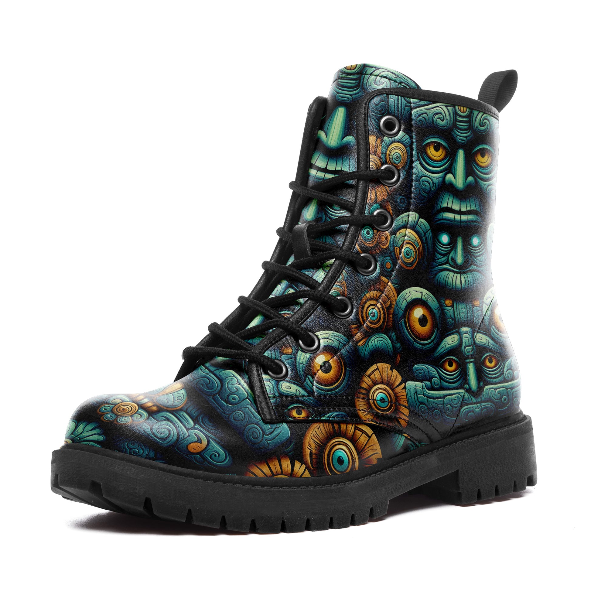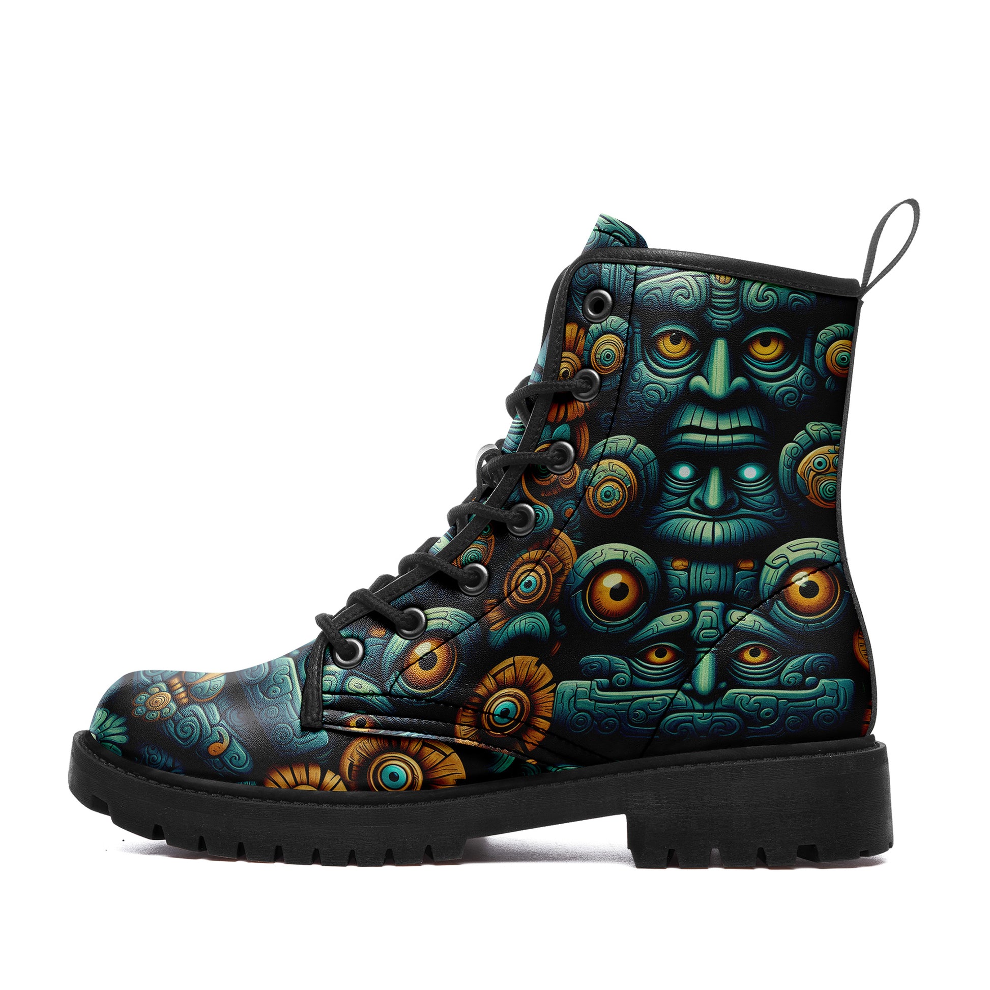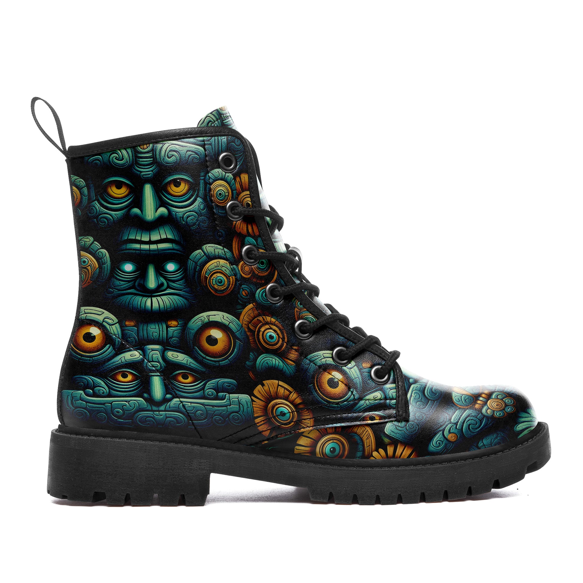 Unearth a legend with every step. These incredible combat boots feature an intricate, all-over print inspired by the **stone carvings of ancient Mesoamerican civilizations**.