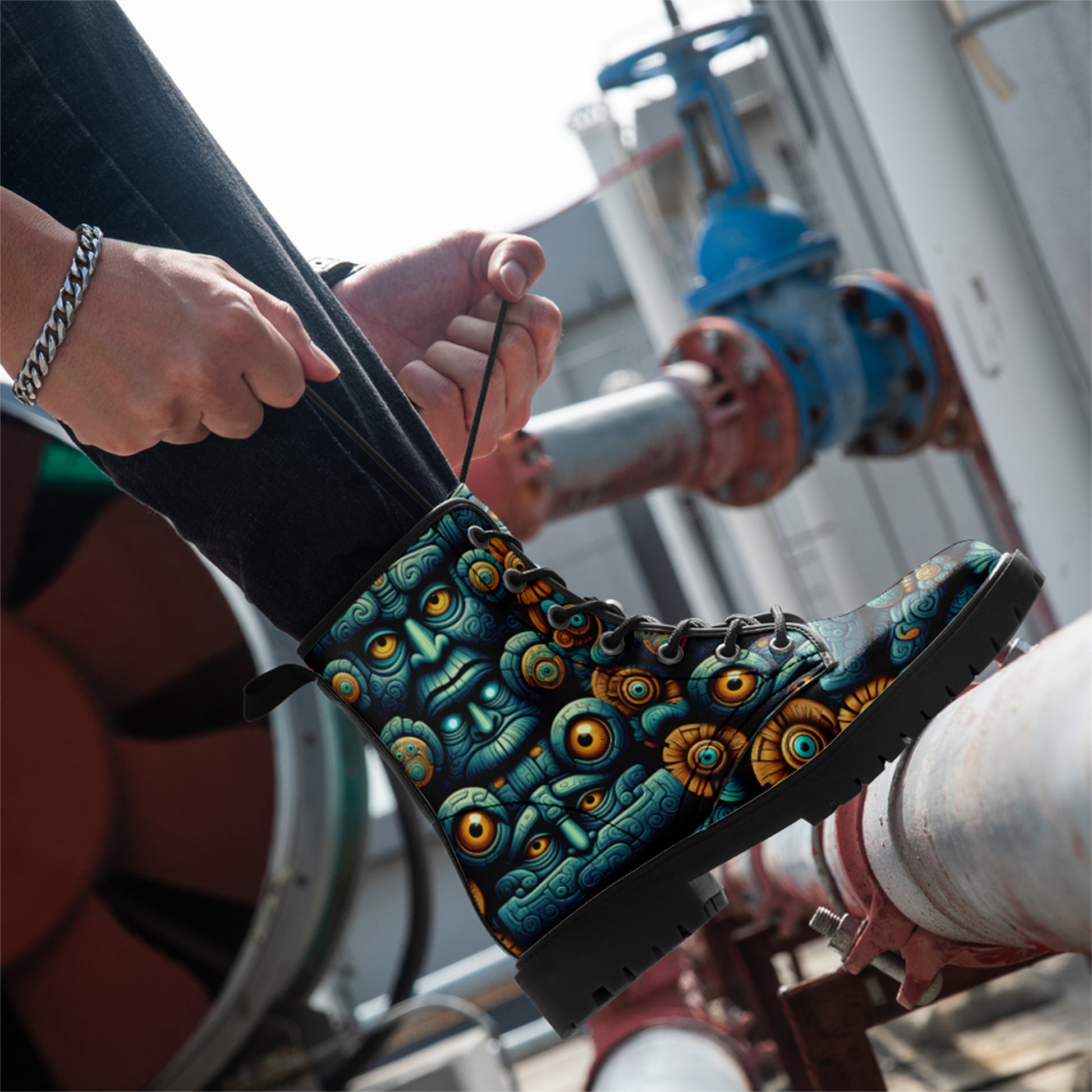 Ancient Mayan Stone Mask Combat Boots - Turquoise Aztec Pattern Shoes BOOTS-25027041-6