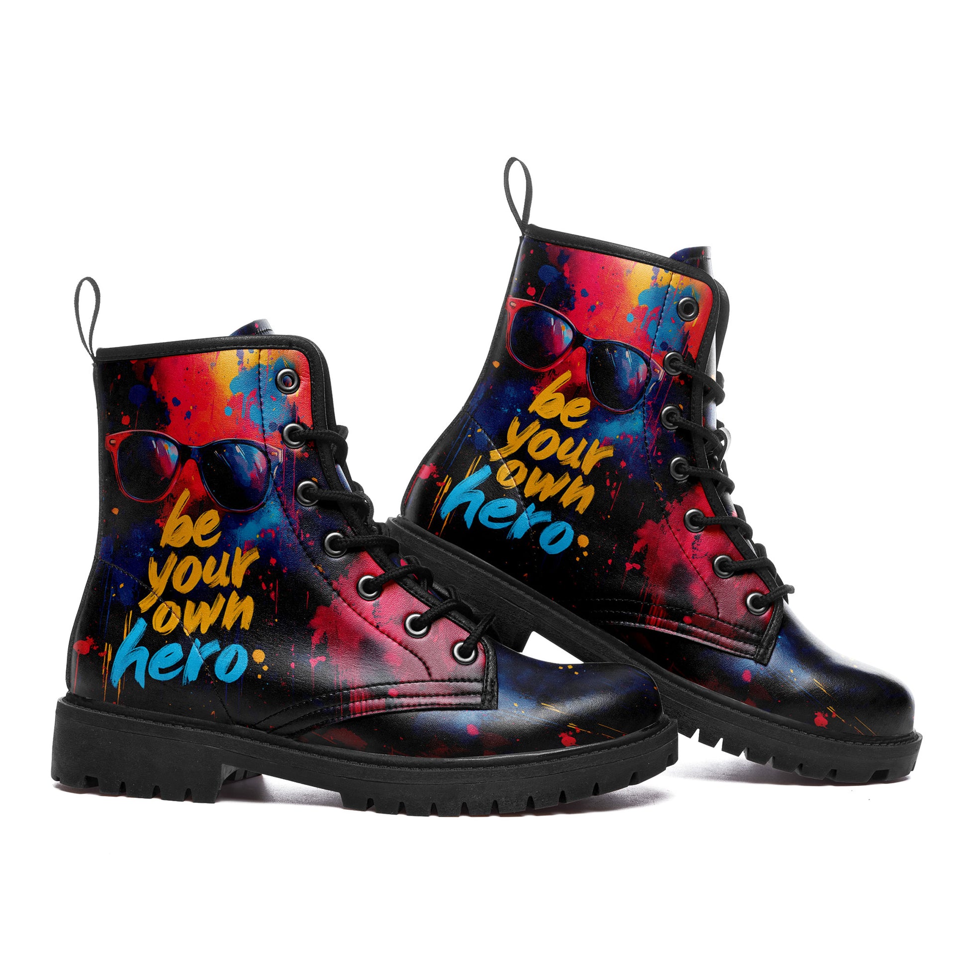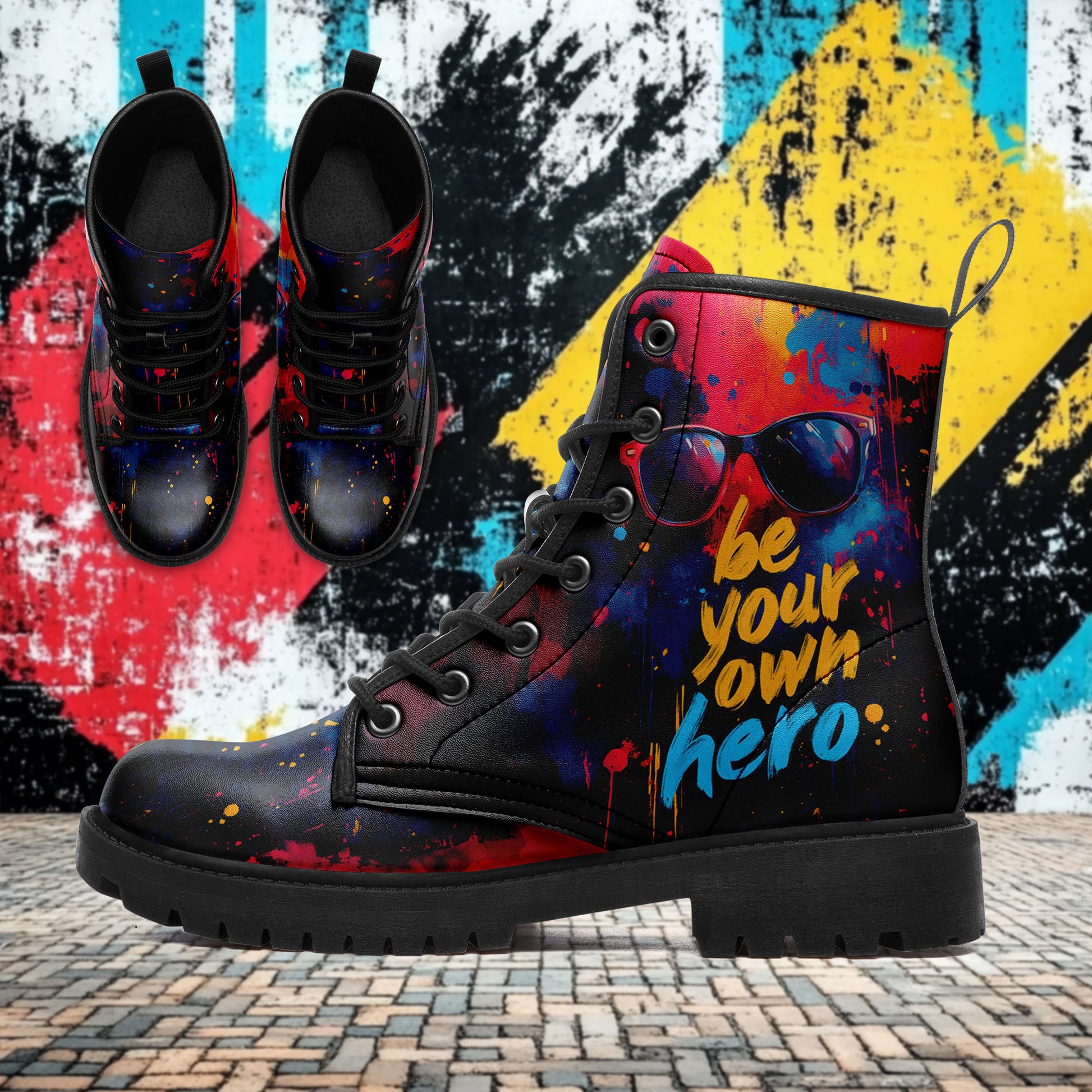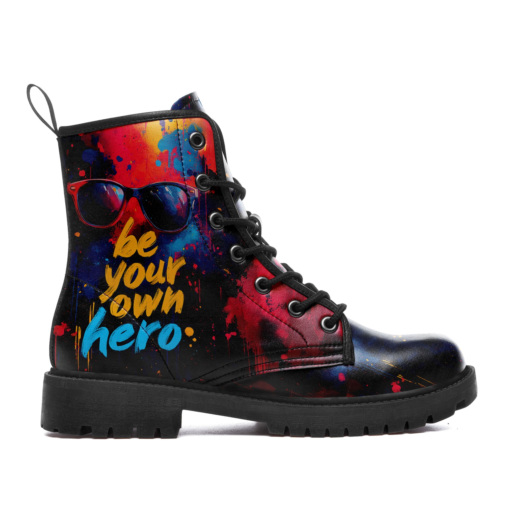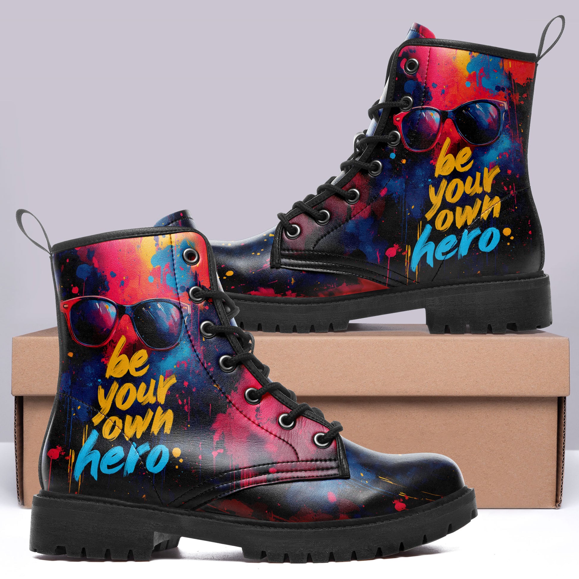 Don't wait for someone to save you. Save yourself. These combat boots are a vibrant declaration of independence, featuring the powerful mantra **"be your own hero"** painted across a chaotic canvas of color.
