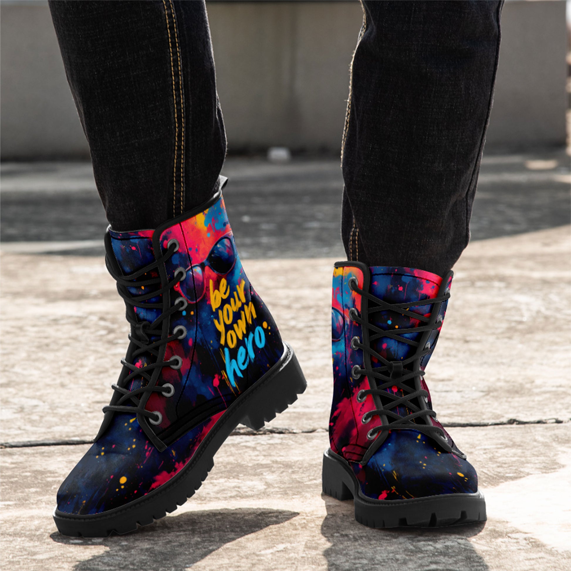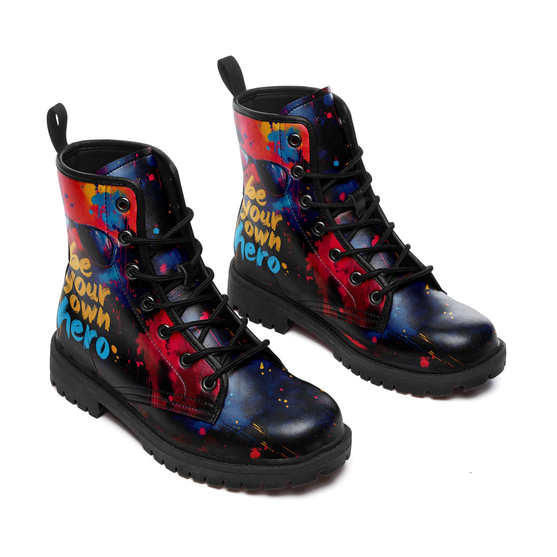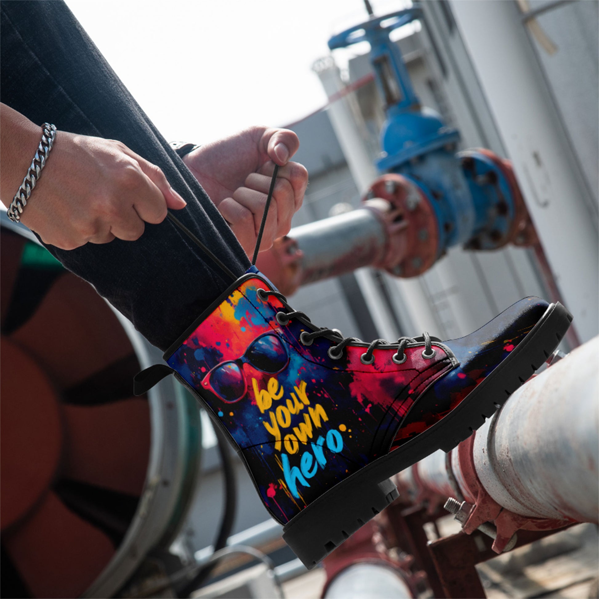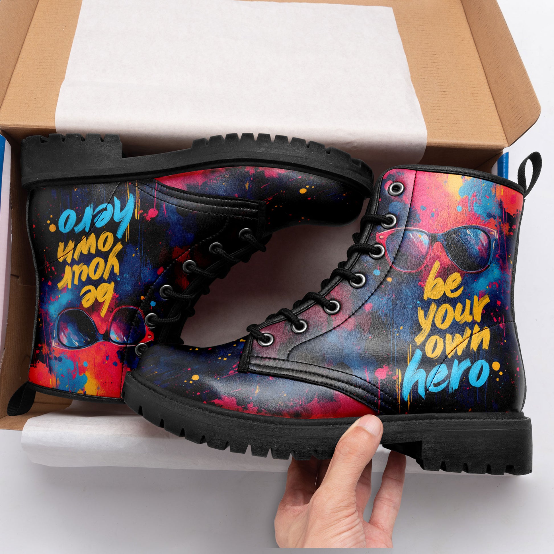 Don't wait for someone to save you. Save yourself. These combat boots are a vibrant declaration of independence, featuring the powerful mantra **"be your own hero"** painted across a chaotic canvas of color.