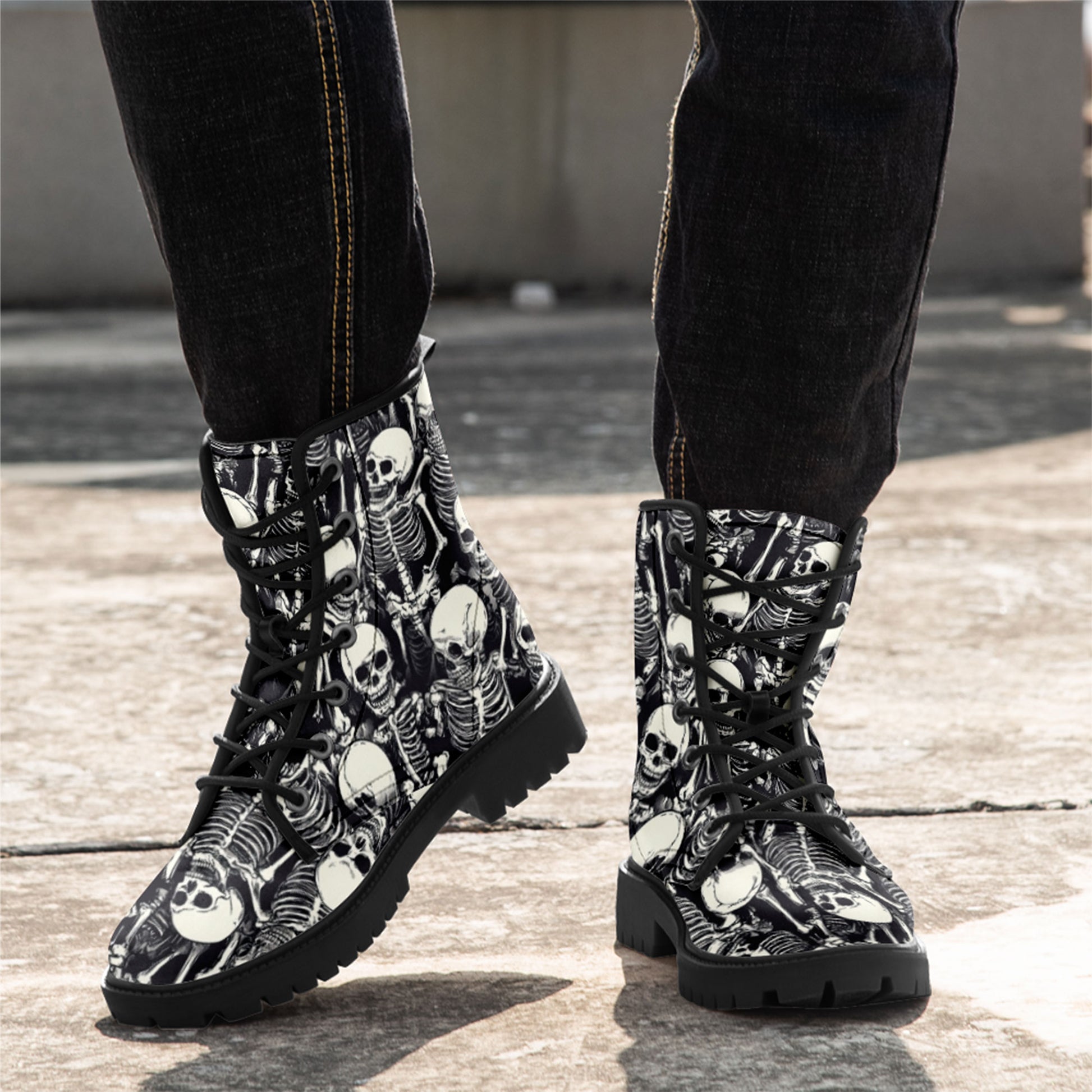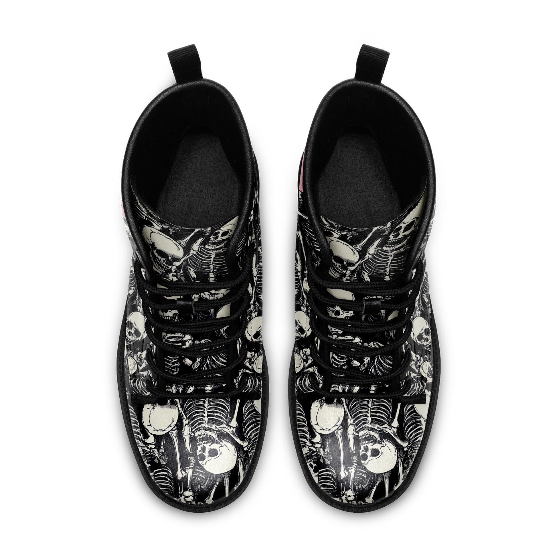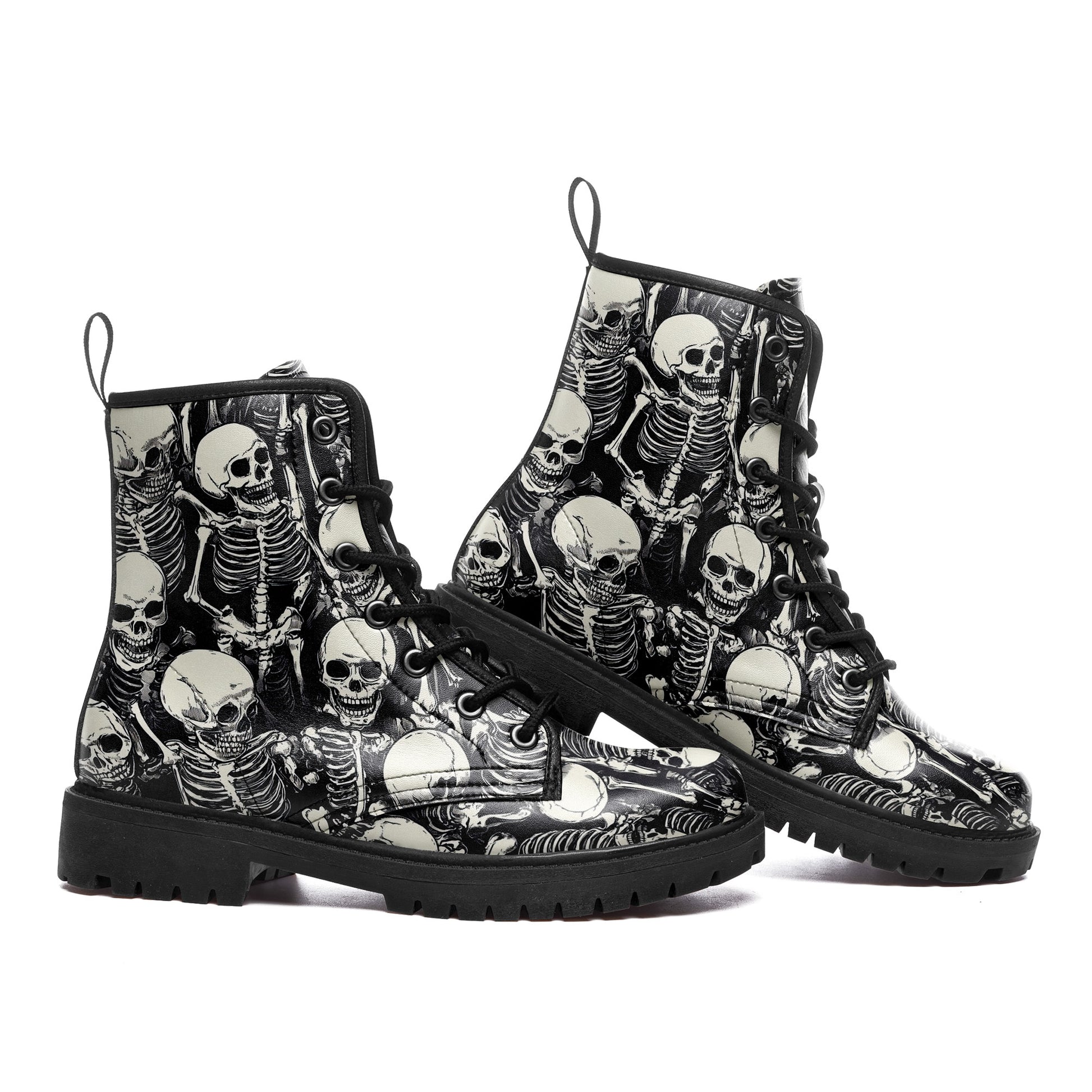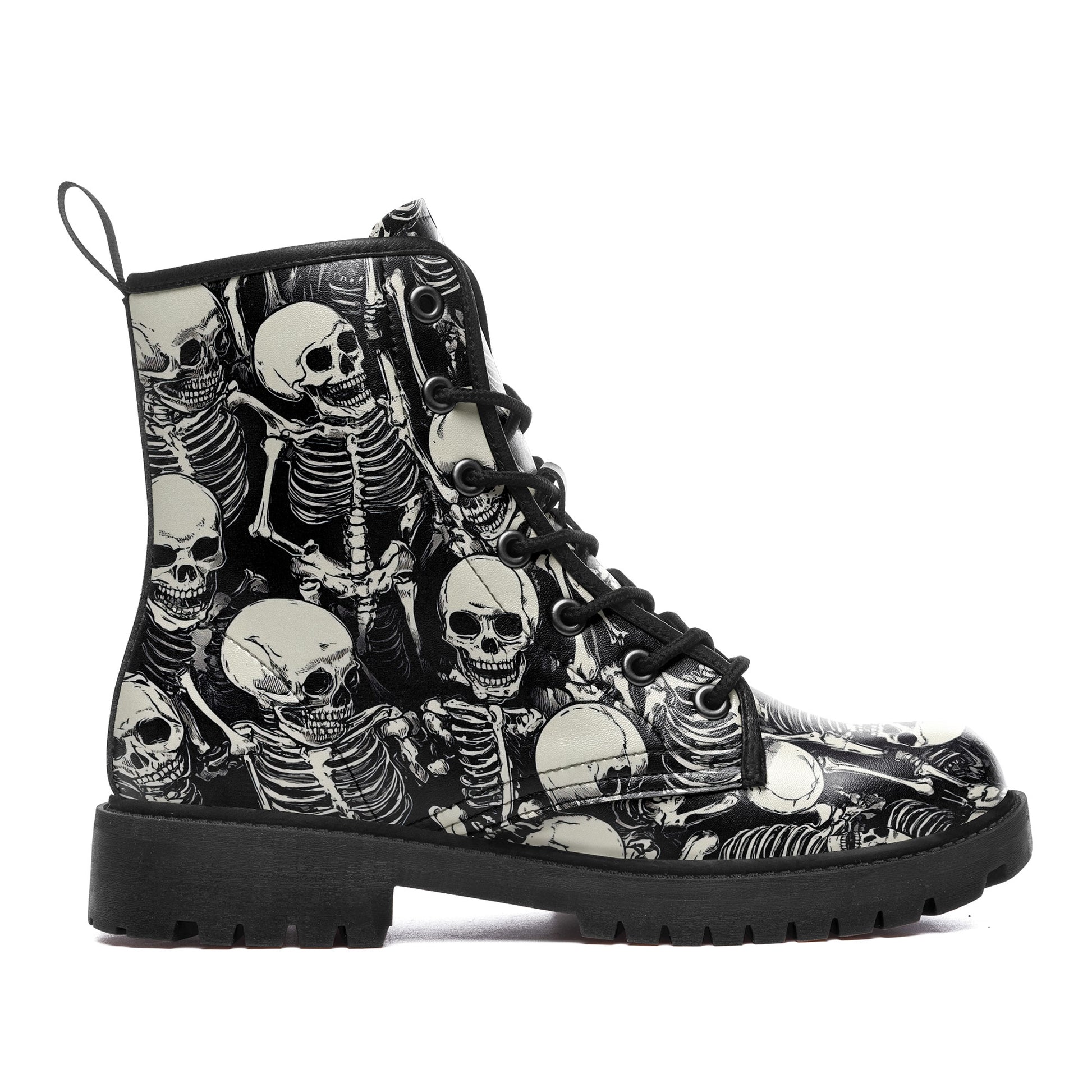 Black & White Skeleton Pile Combat Boots - All-Over Skull Pattern Footwear BOOTS-25025054-3