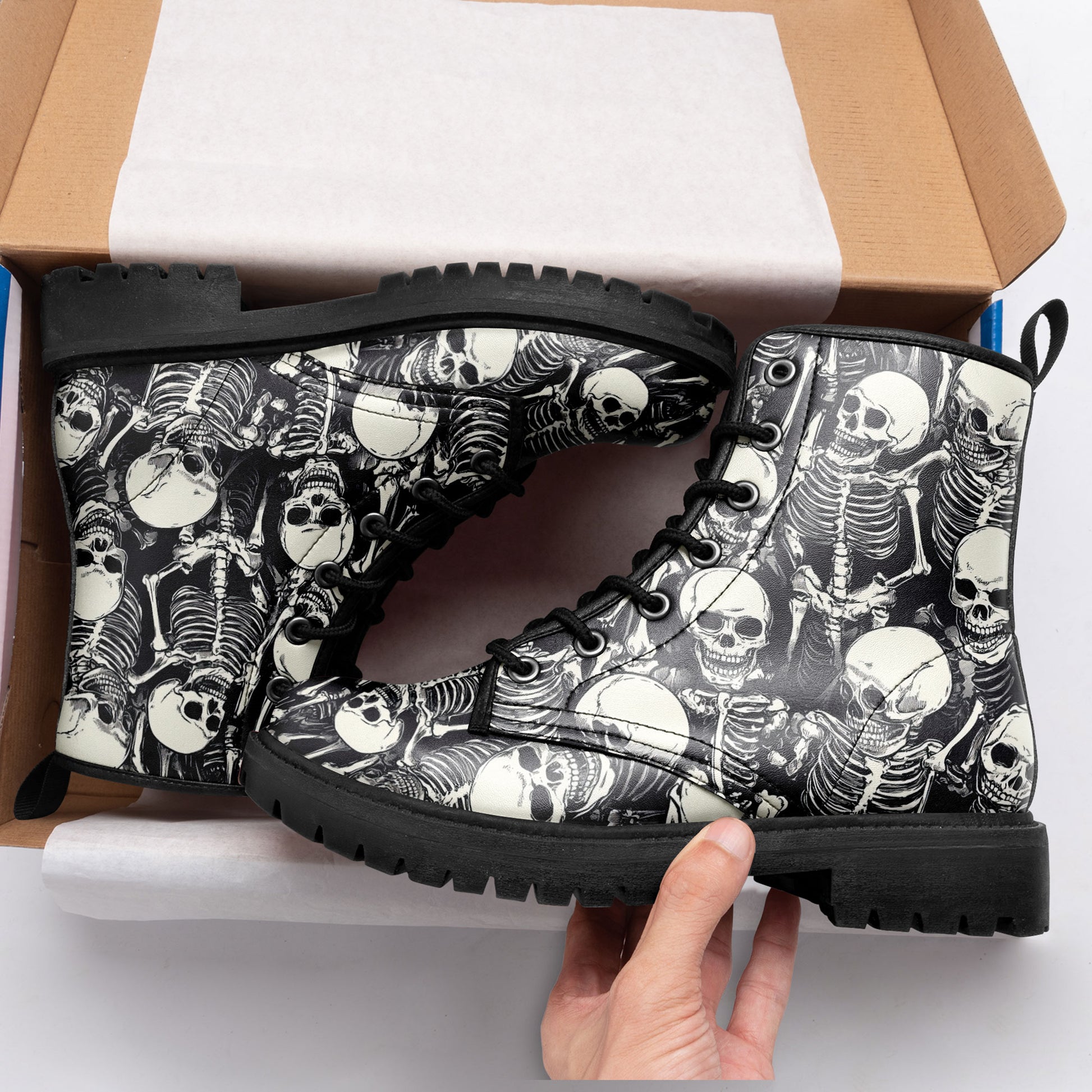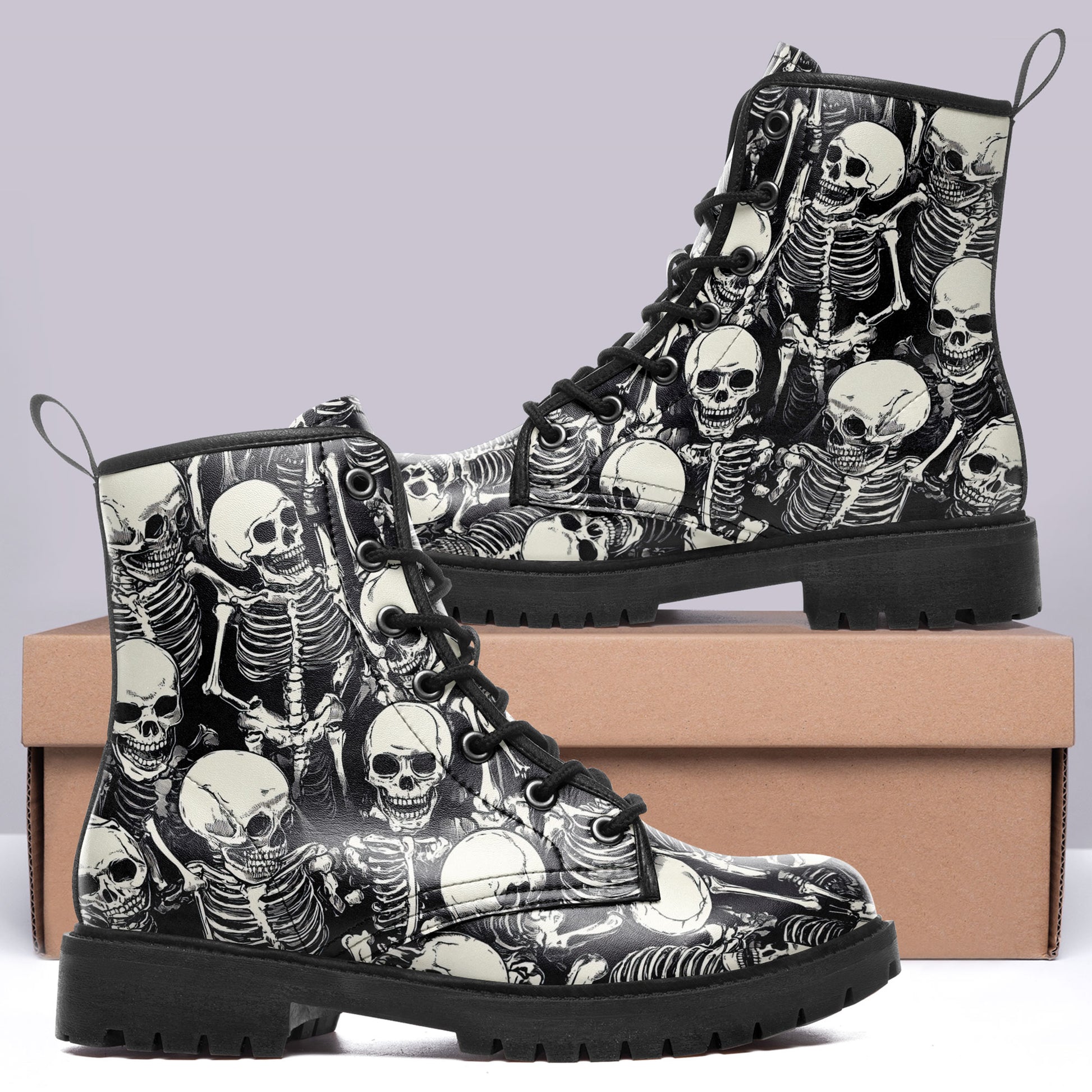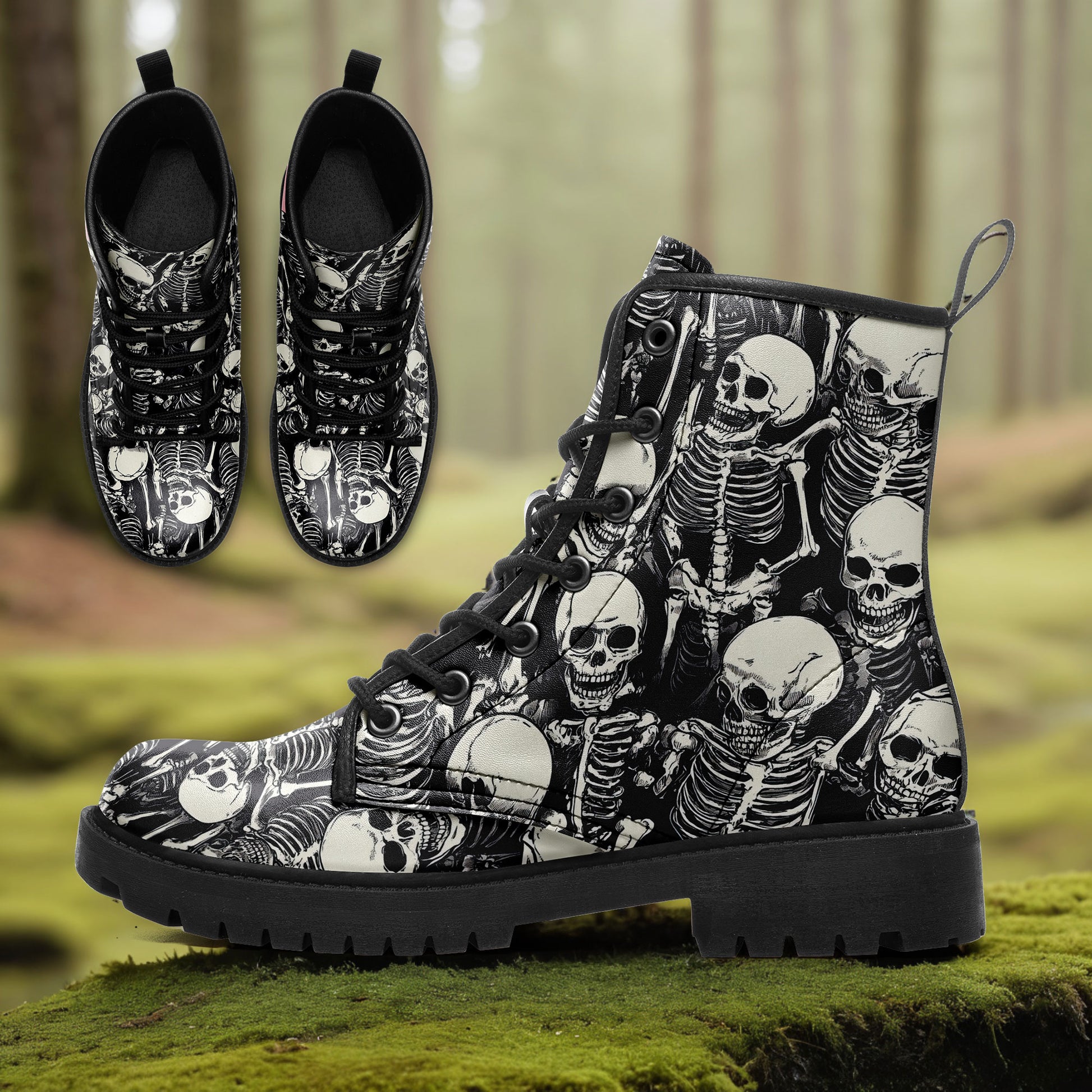 Step straight into the ossuary. These boots aren't just printed; they are buried in detail. Featuring a chaotic, high-density **all-over print of tangled skeletons and skulls**, this design captures the chilling beauty of ancient catacombs.