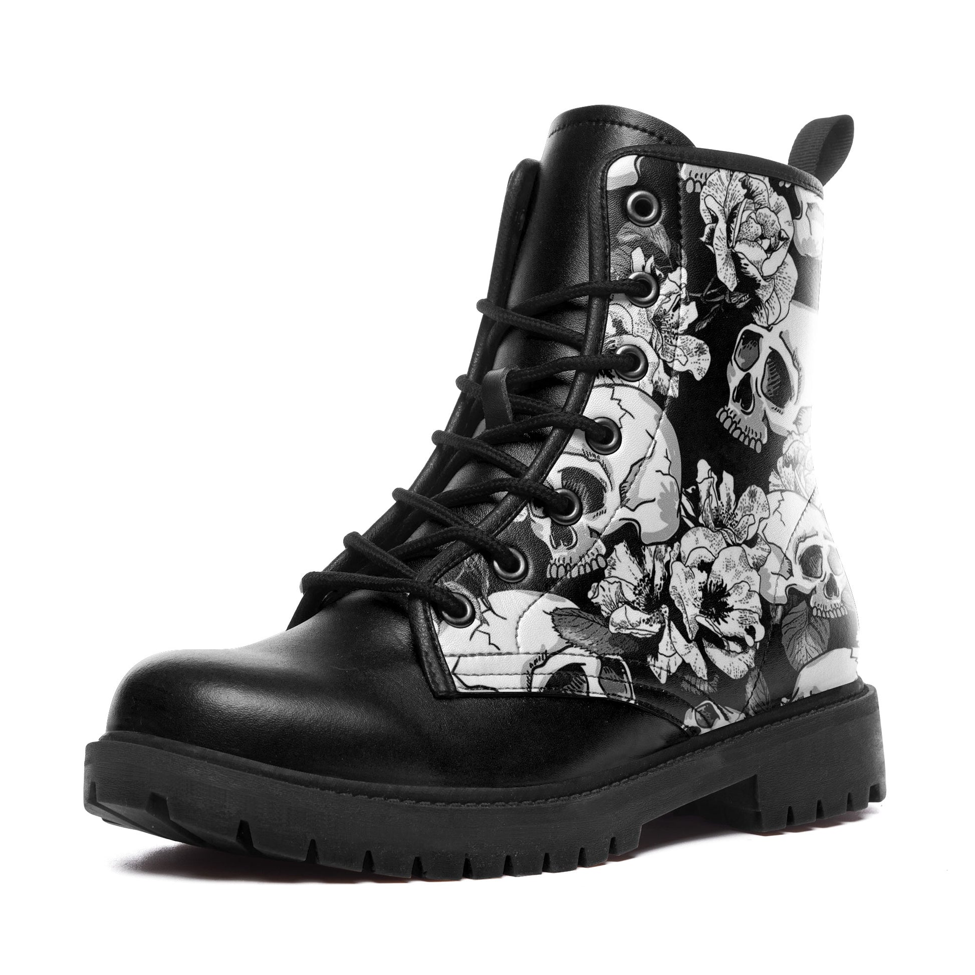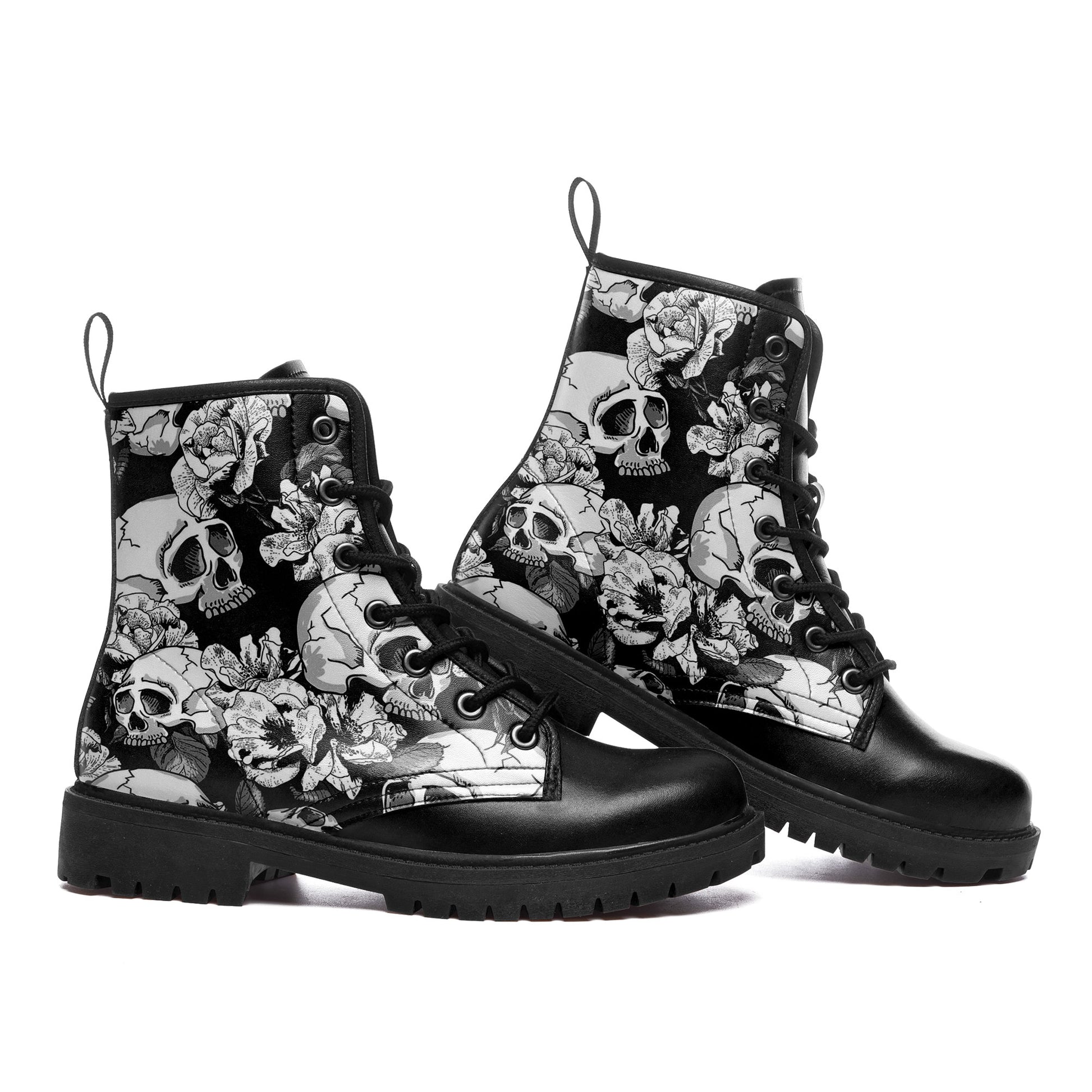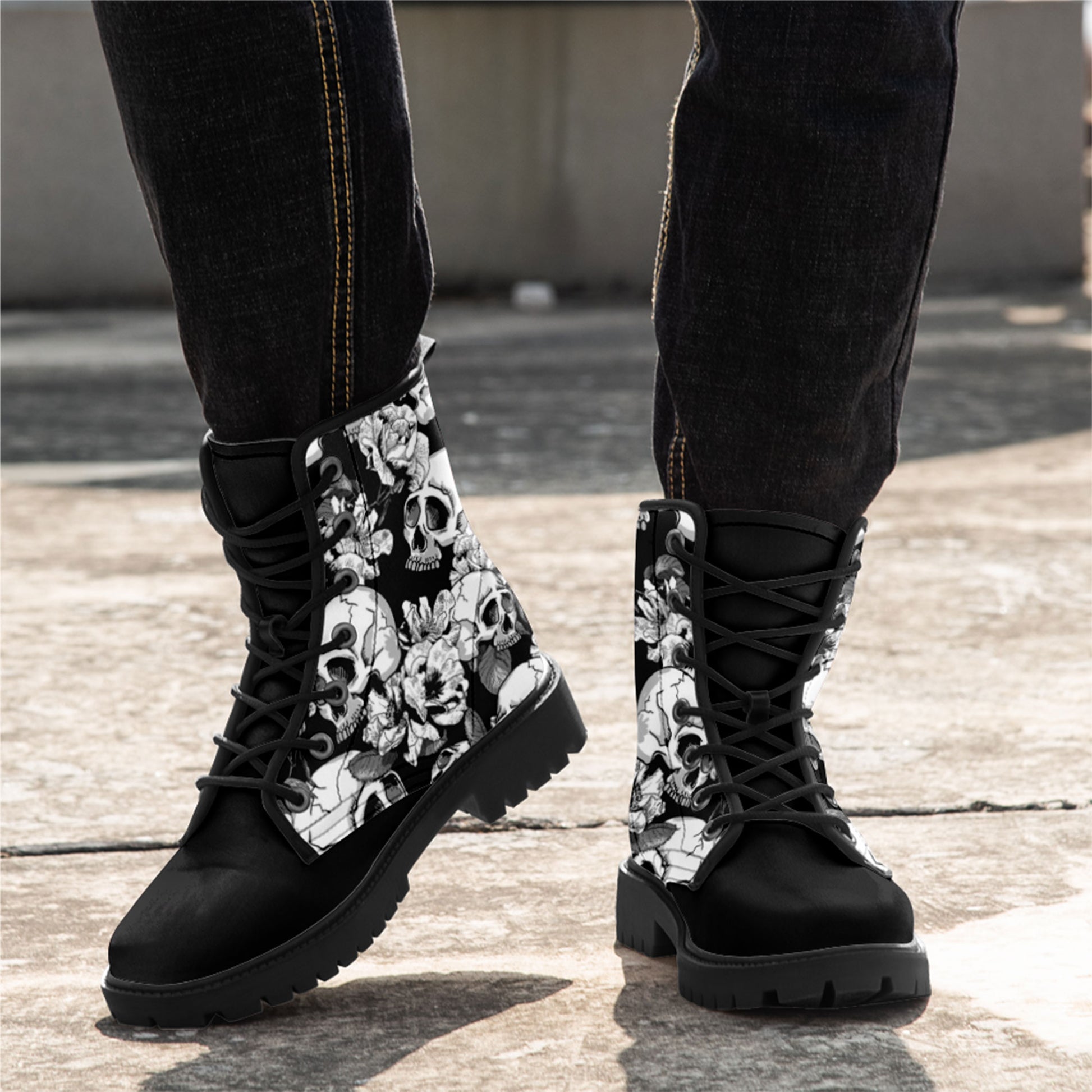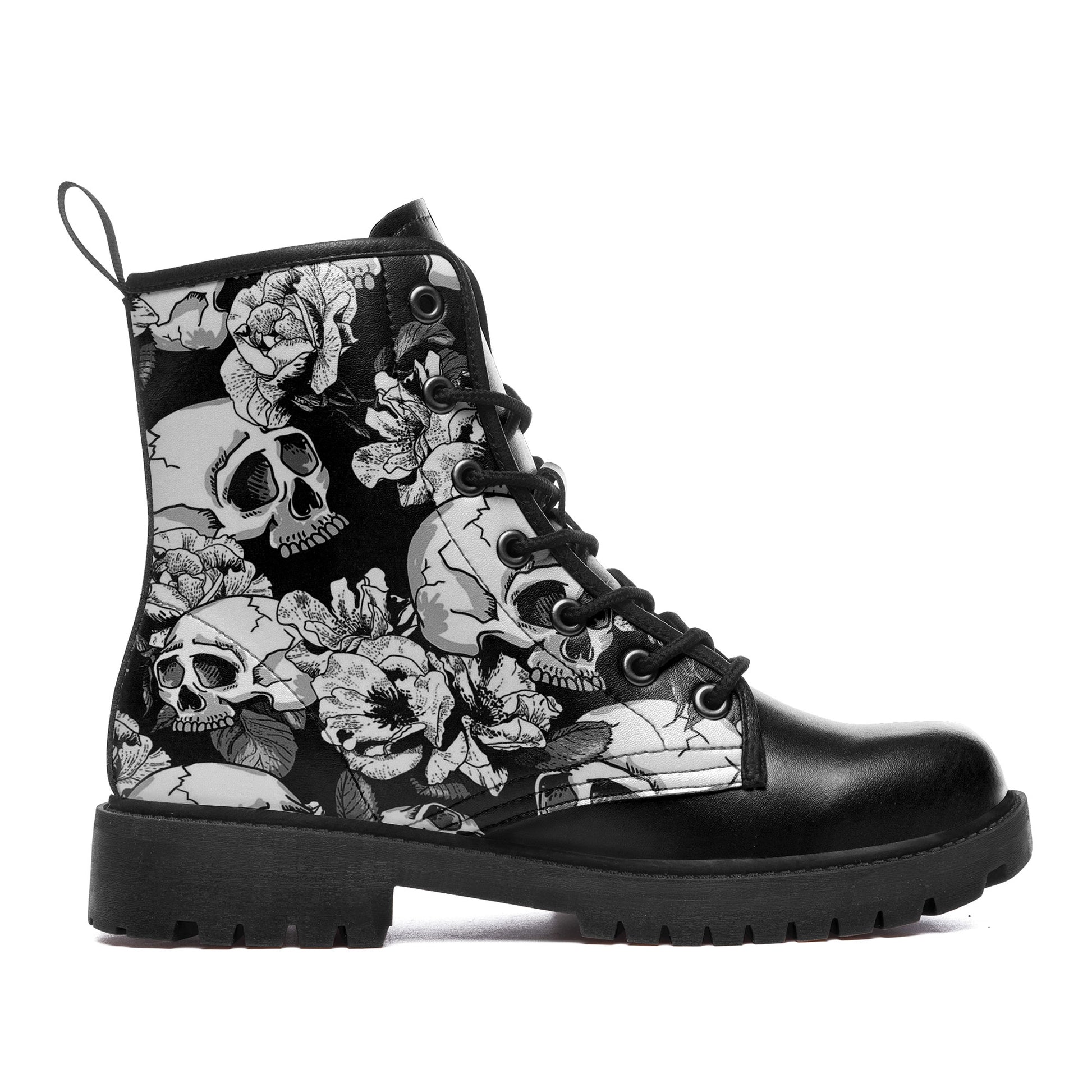 Darkness blooms in black and white. These combat boots feature an intricate, all-over print that weaves together **realistic skulls** and **detailed roses** in stunning greyscale.