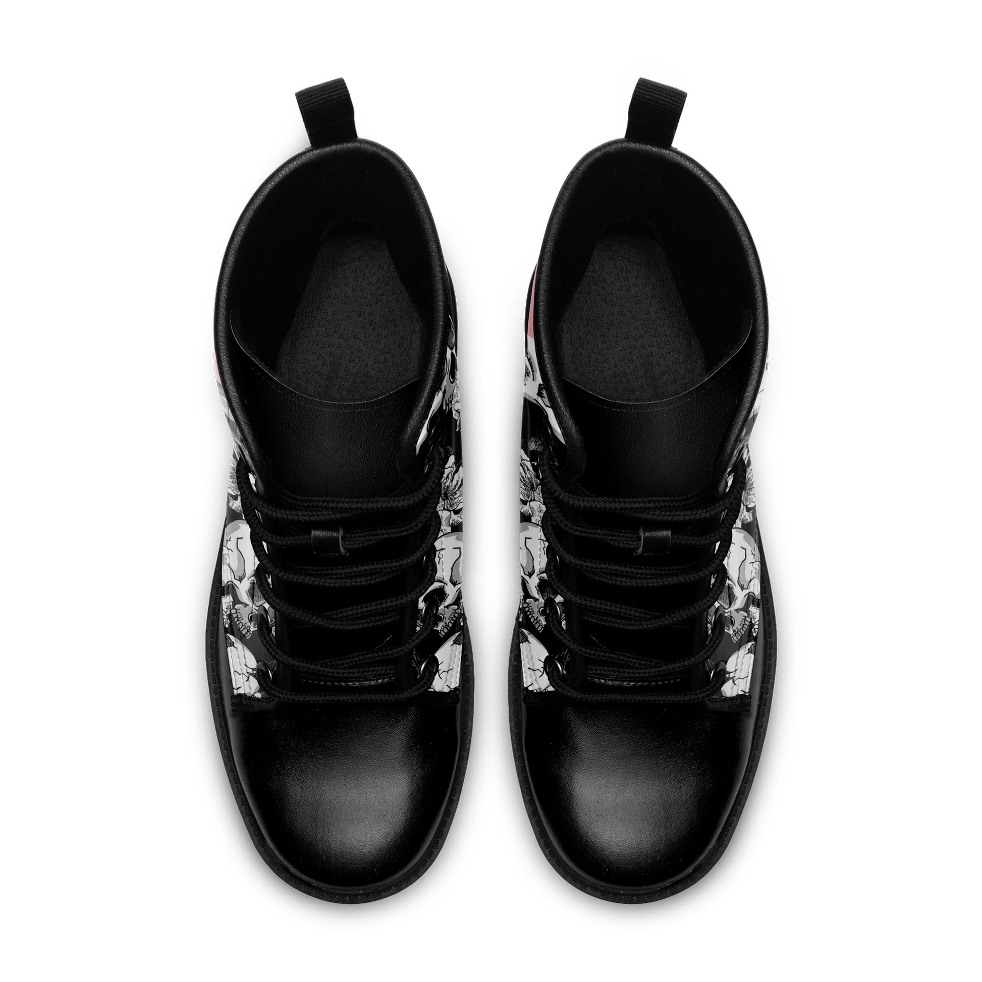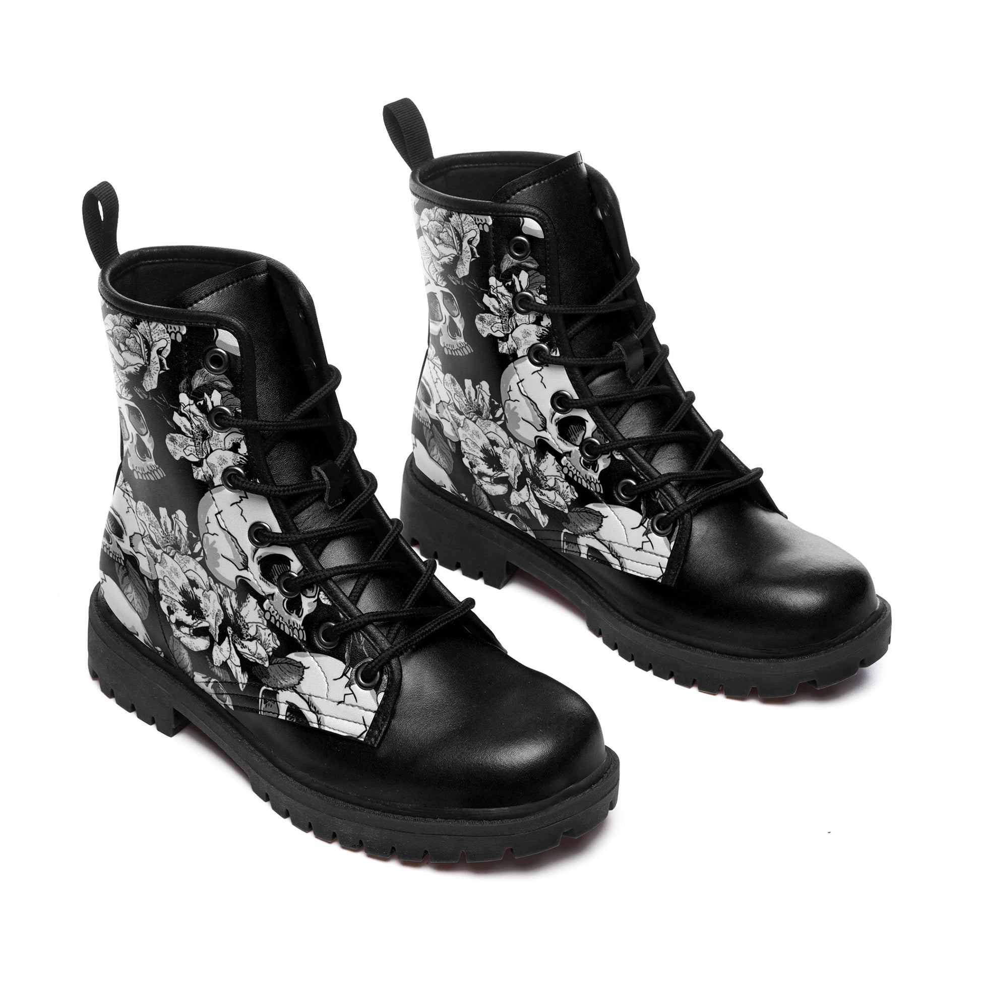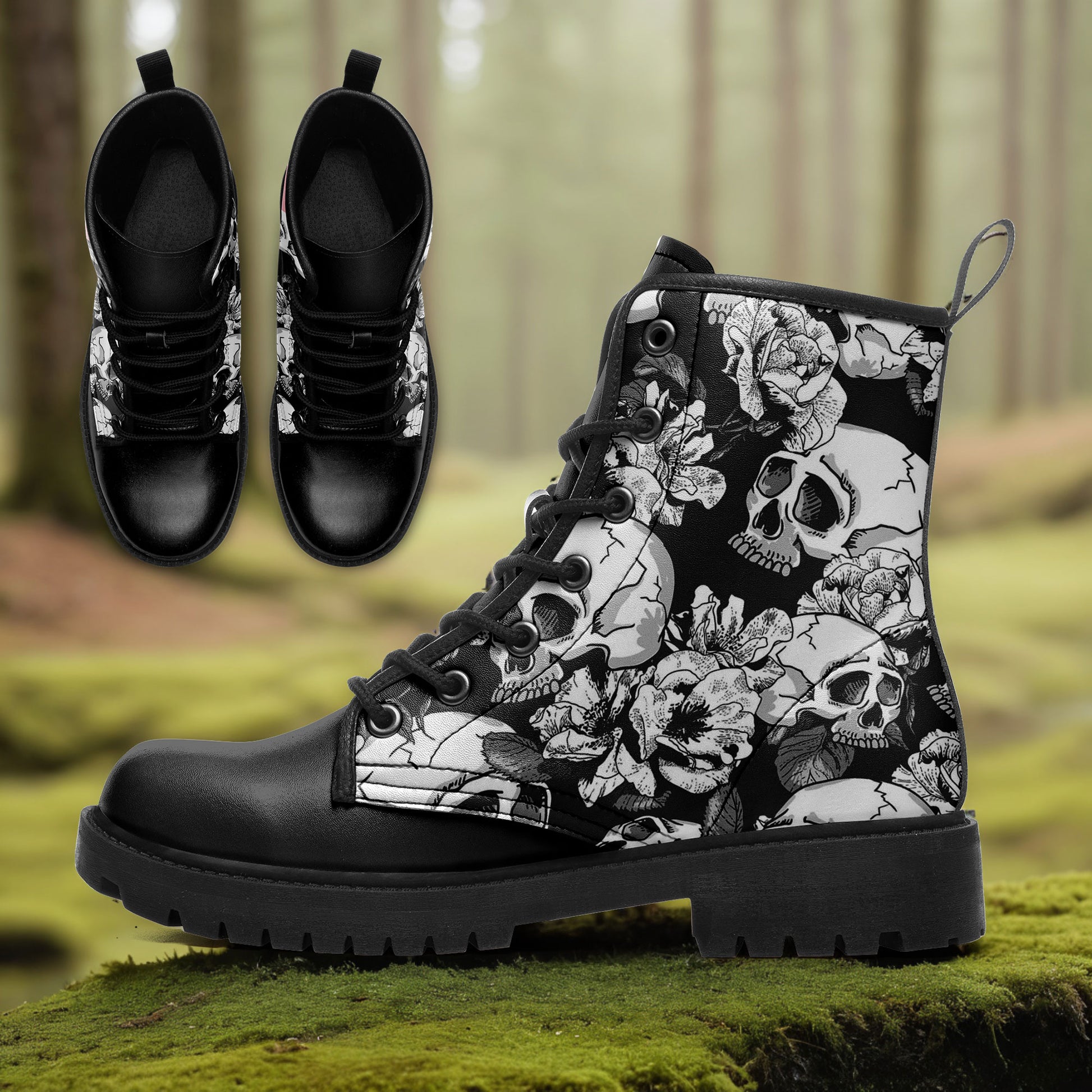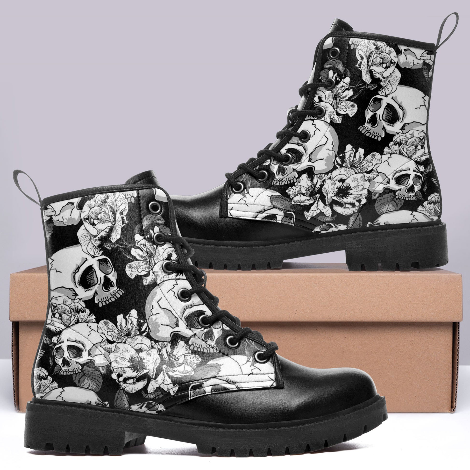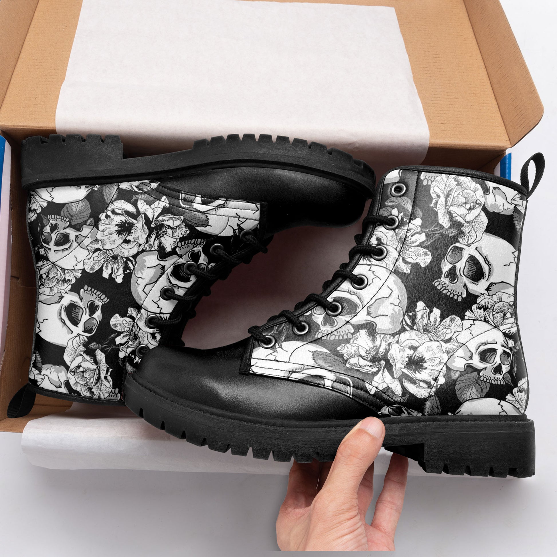 Darkness blooms in black and white. These combat boots feature an intricate, all-over print that weaves together **realistic skulls** and **detailed roses** in stunning greyscale.