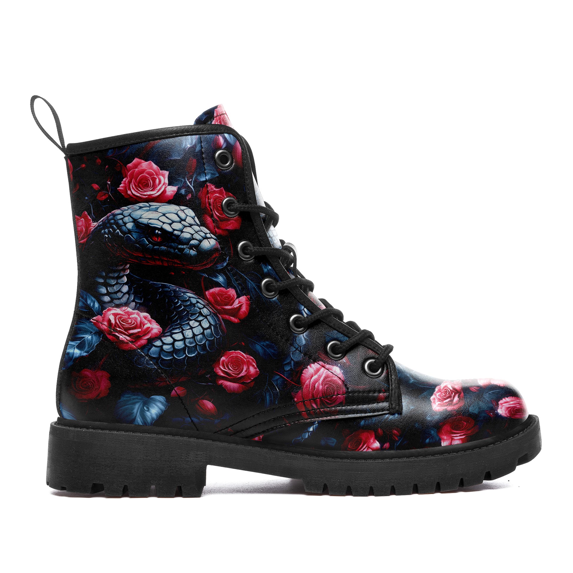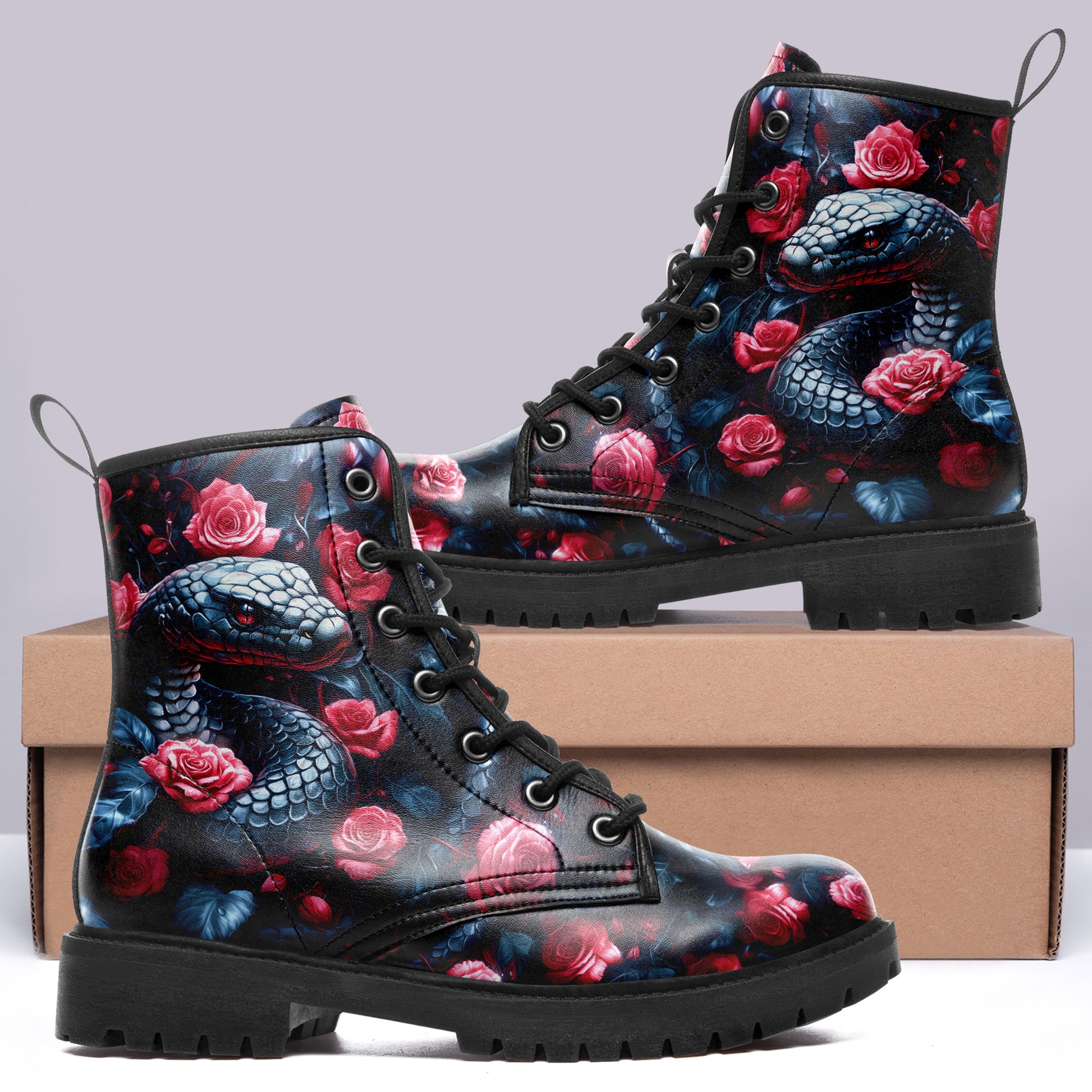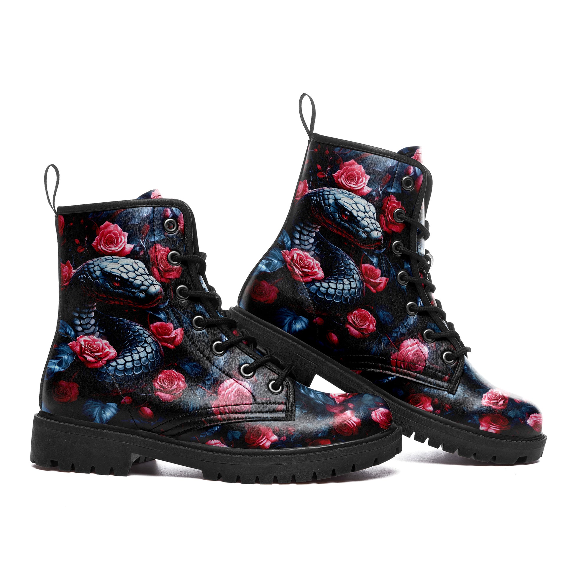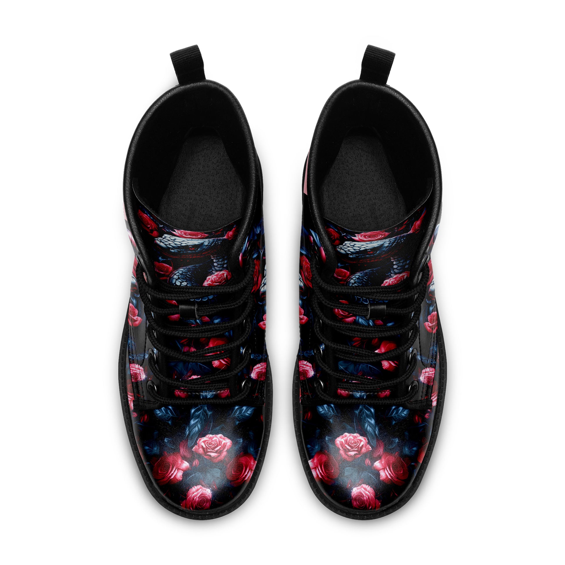 Beauty with a bite. These exquisite combat boots capture the allure of the untamed. A mesmerizing **blue viper** weaves its way through a bed of lush **pink and red roses**, creating a design that is as dangerous as it is beautiful.