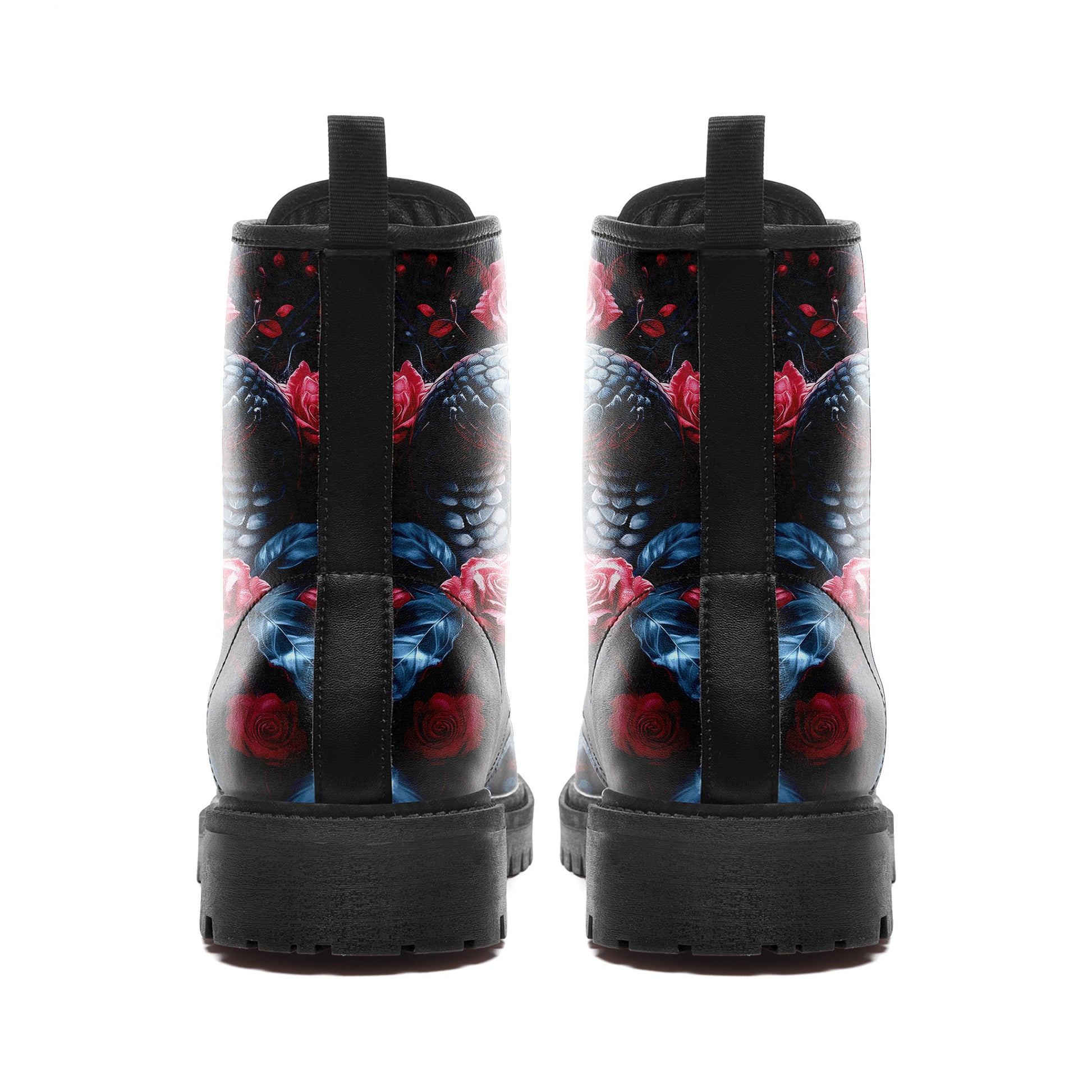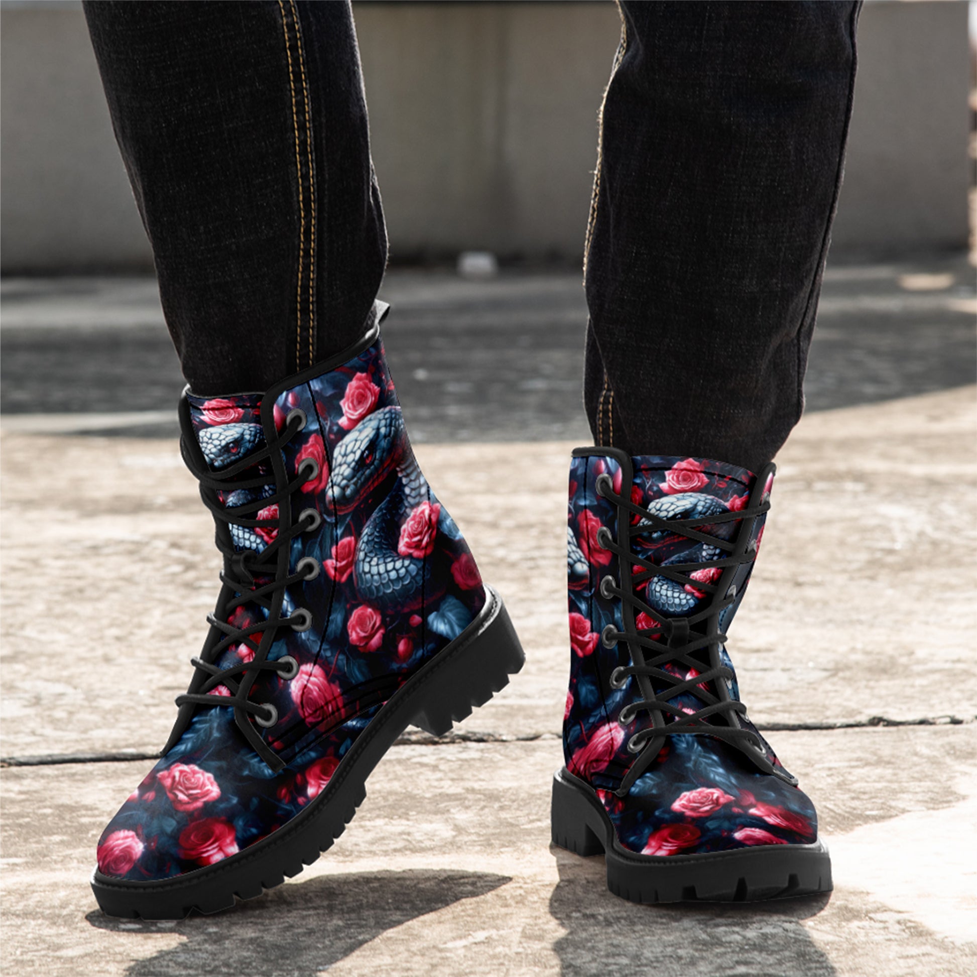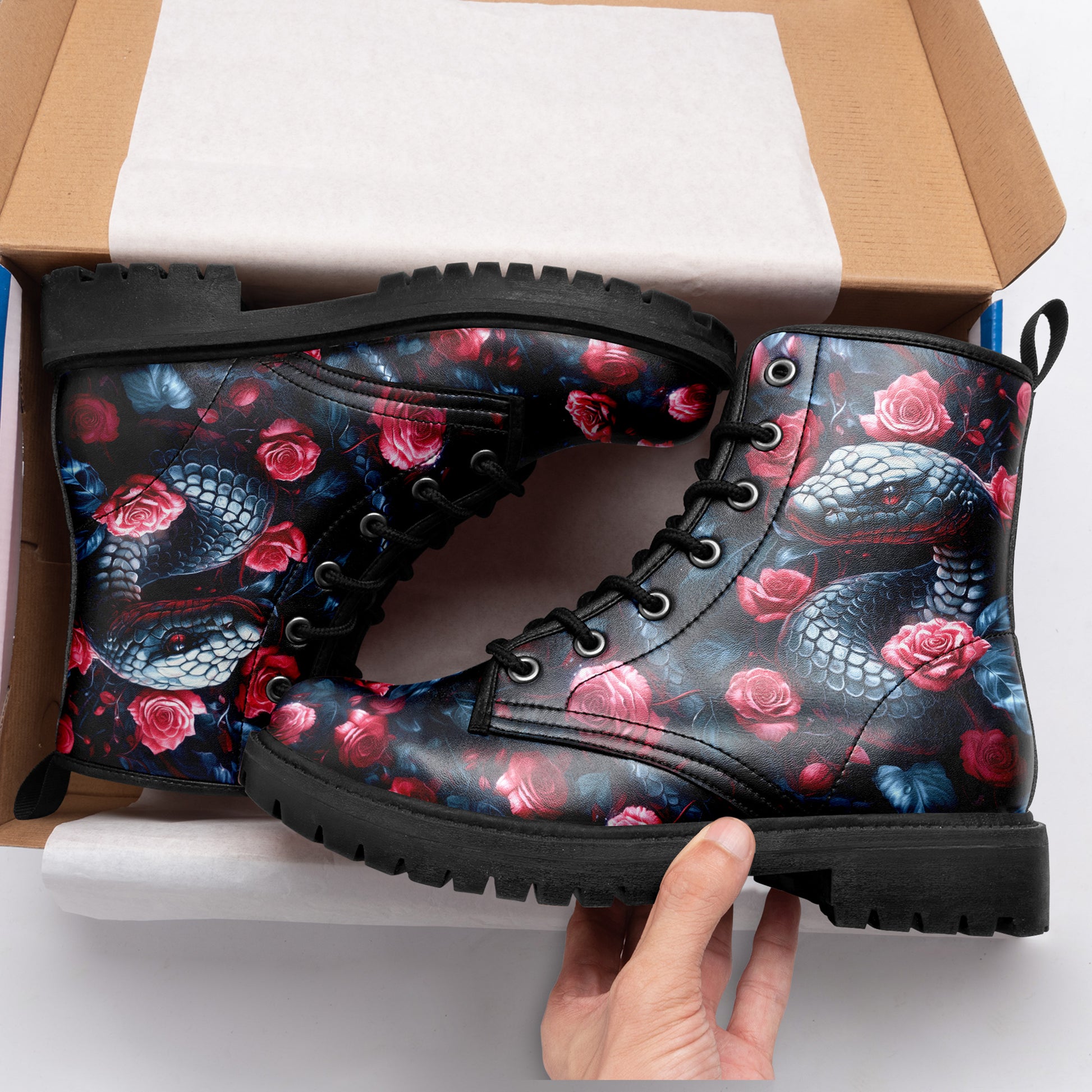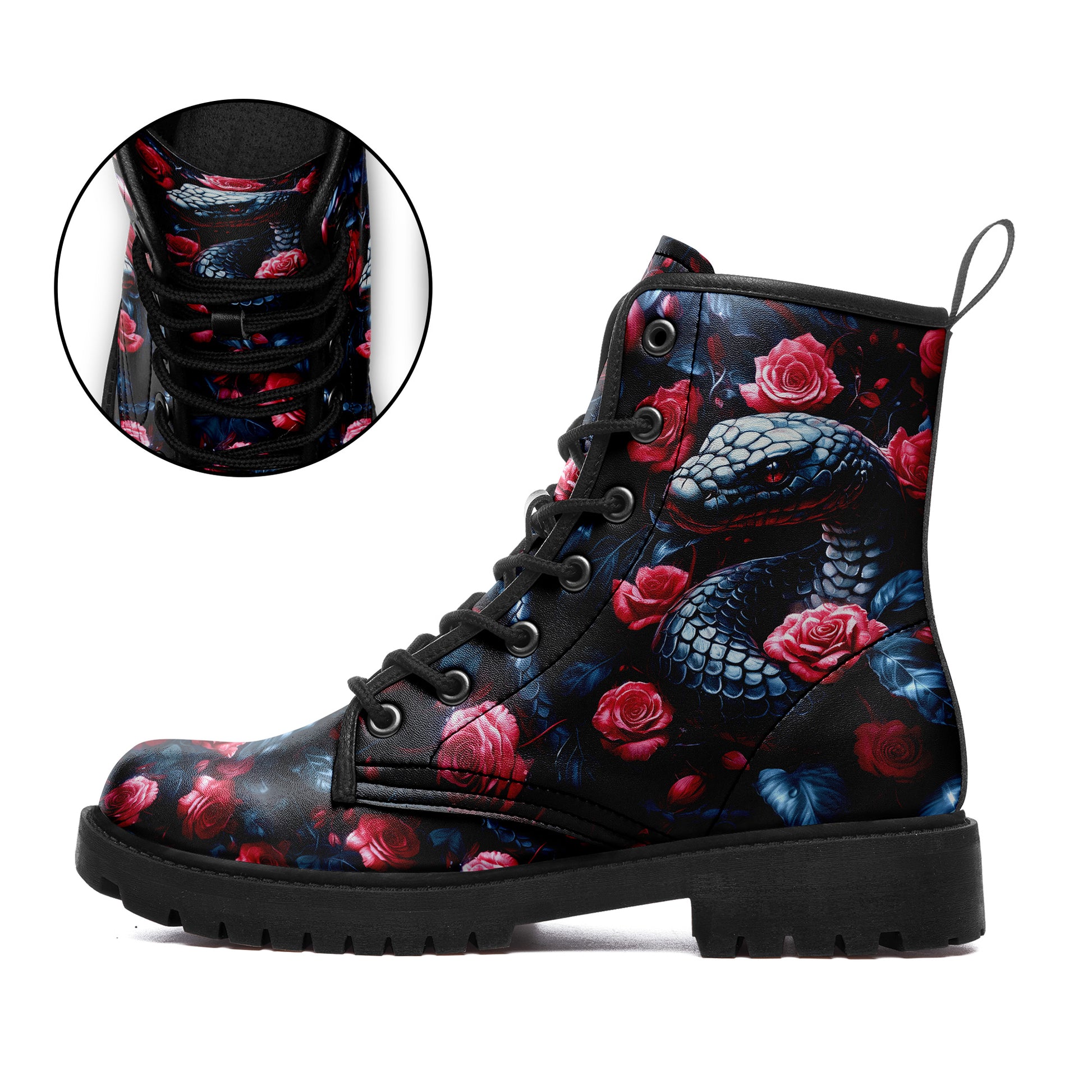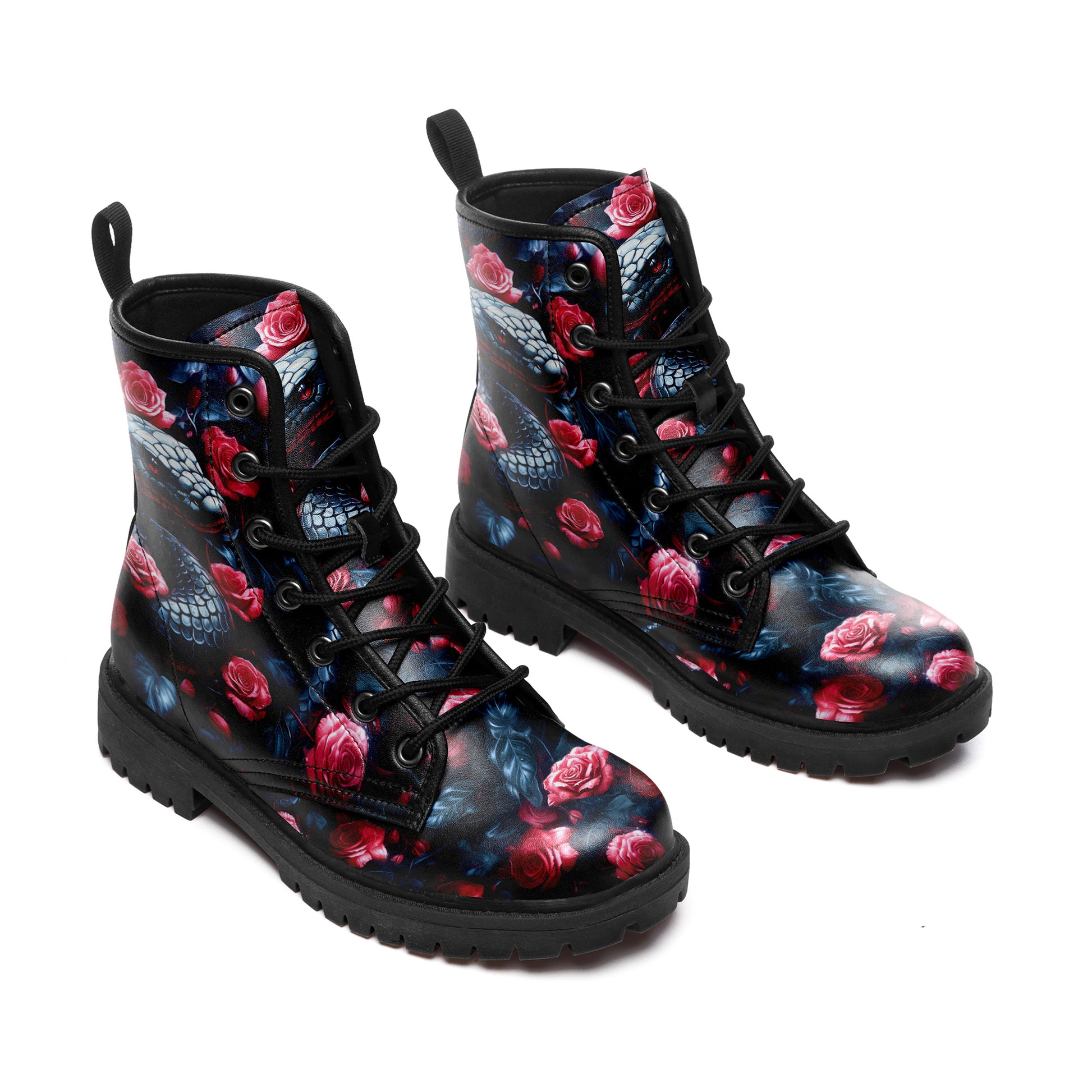 Beauty with a bite. These exquisite combat boots capture the allure of the untamed. A mesmerizing **blue viper** weaves its way through a bed of lush **pink and red roses**, creating a design that is as dangerous as it is beautiful.