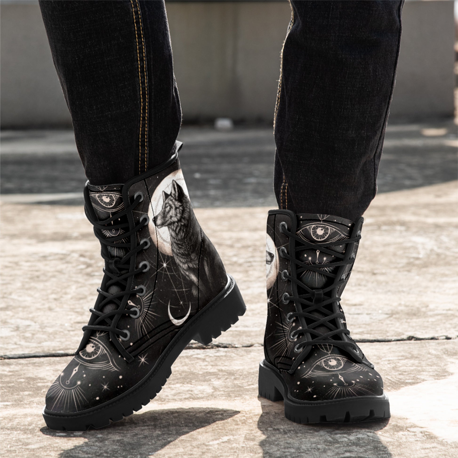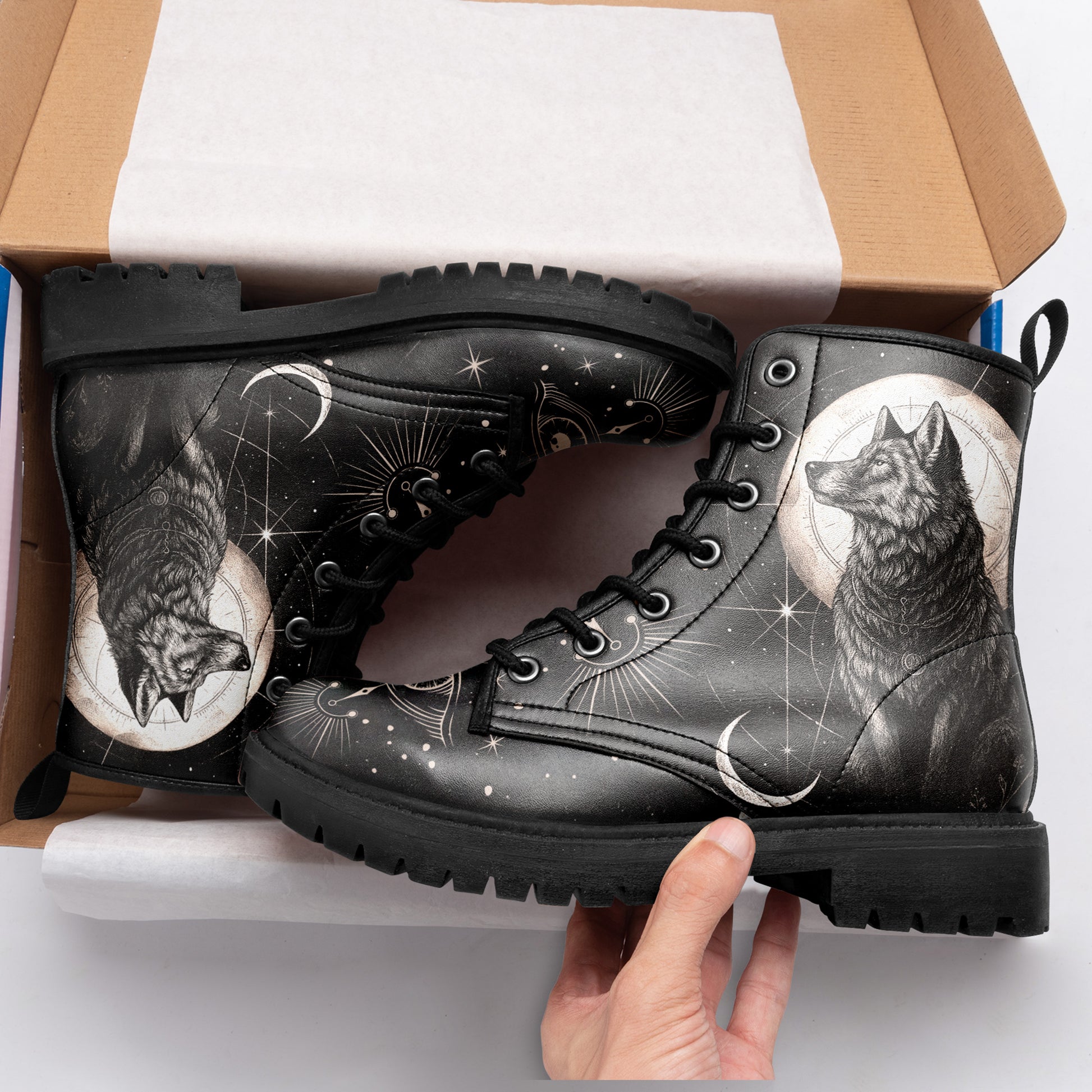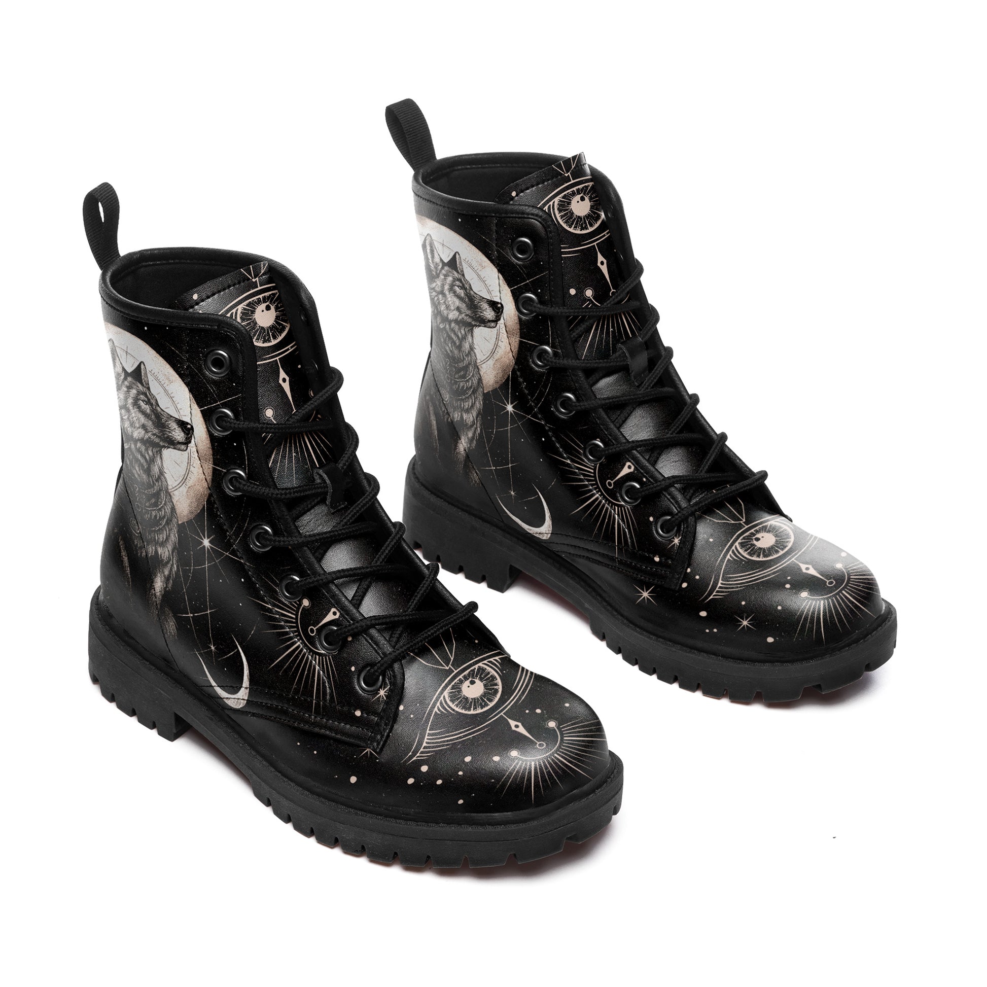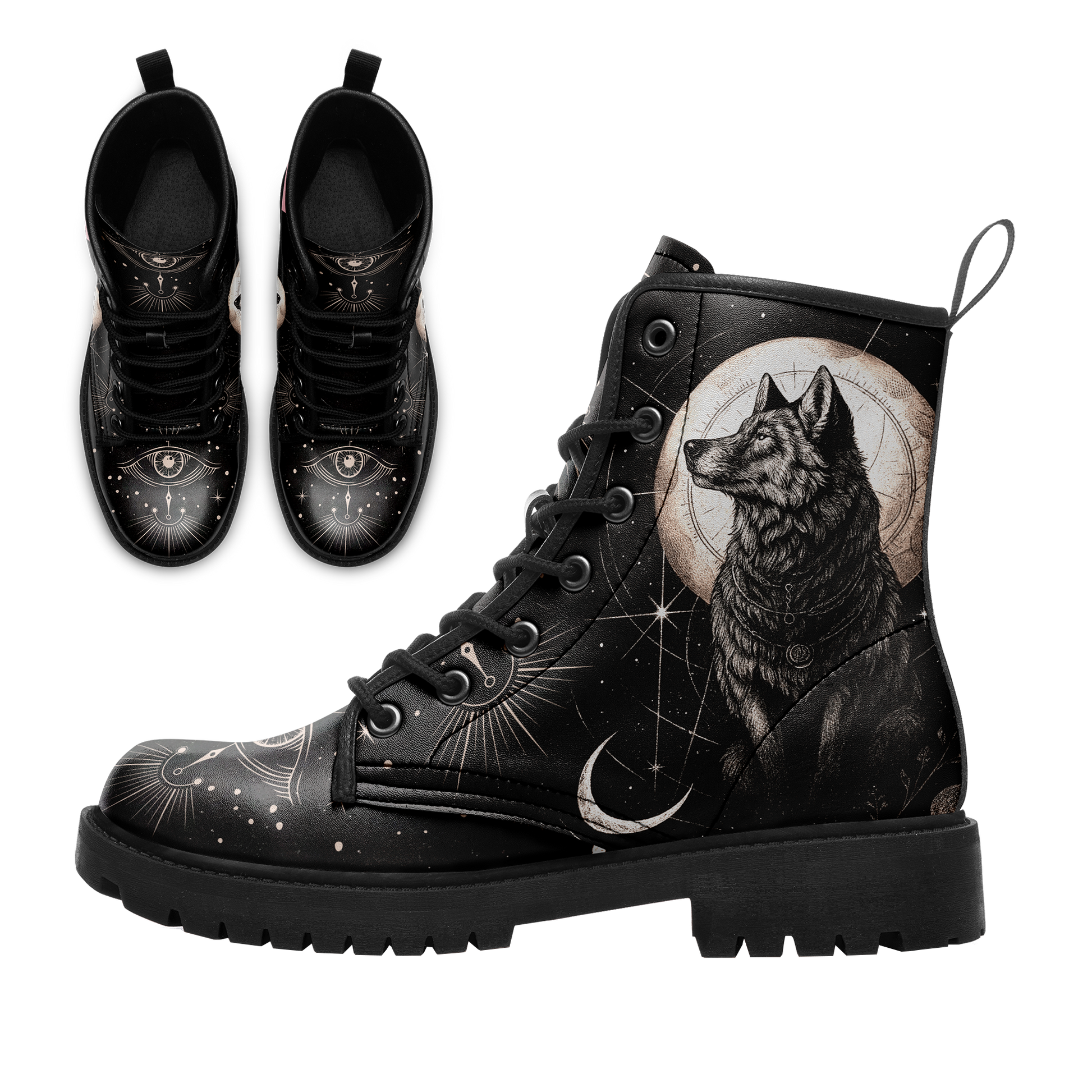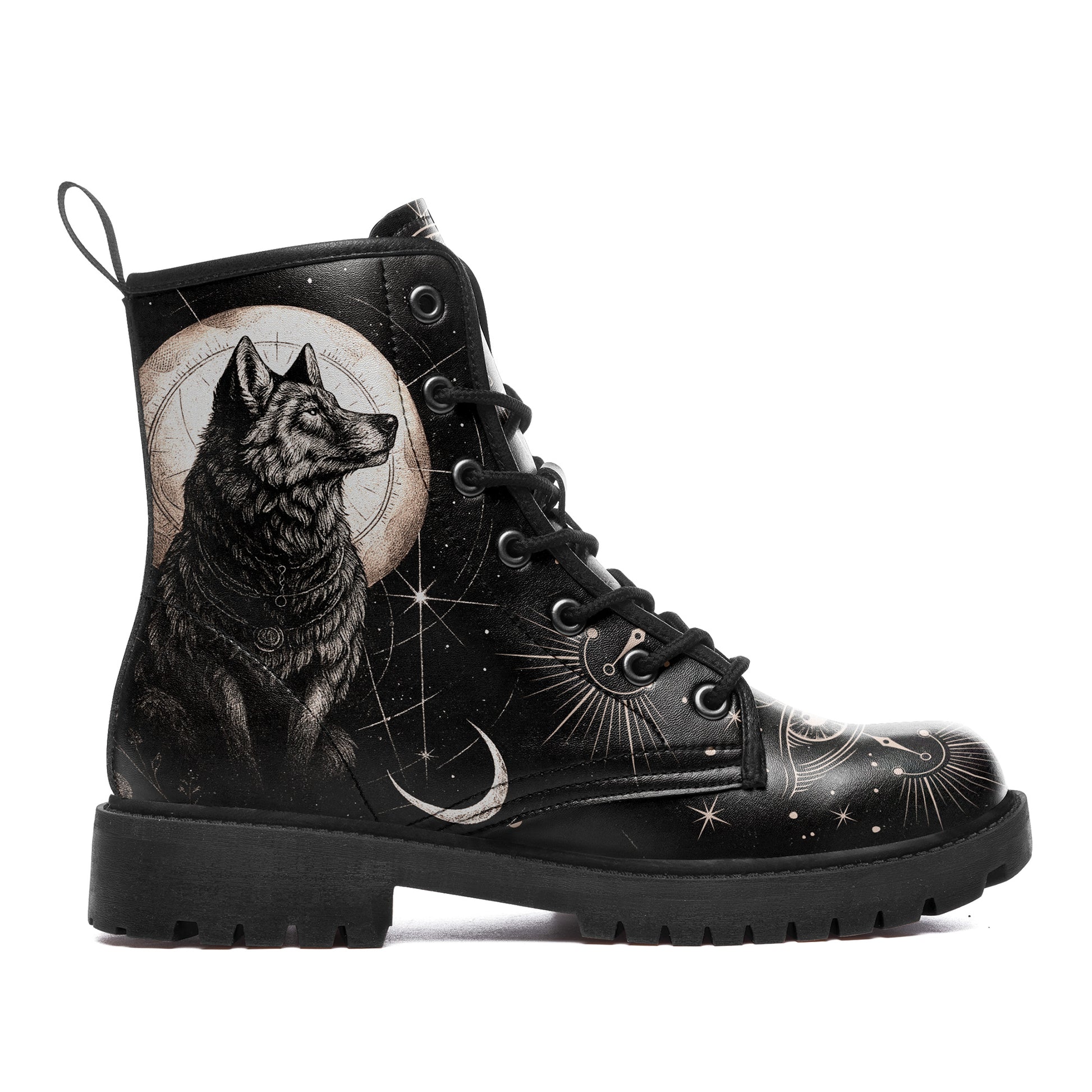 Walk with the spirit of the wild. These combat boots are a tribute to intuition, freedom, and the night. The design features a **noble wolf profile** set against a backdrop of sacred geometry and moon phases.