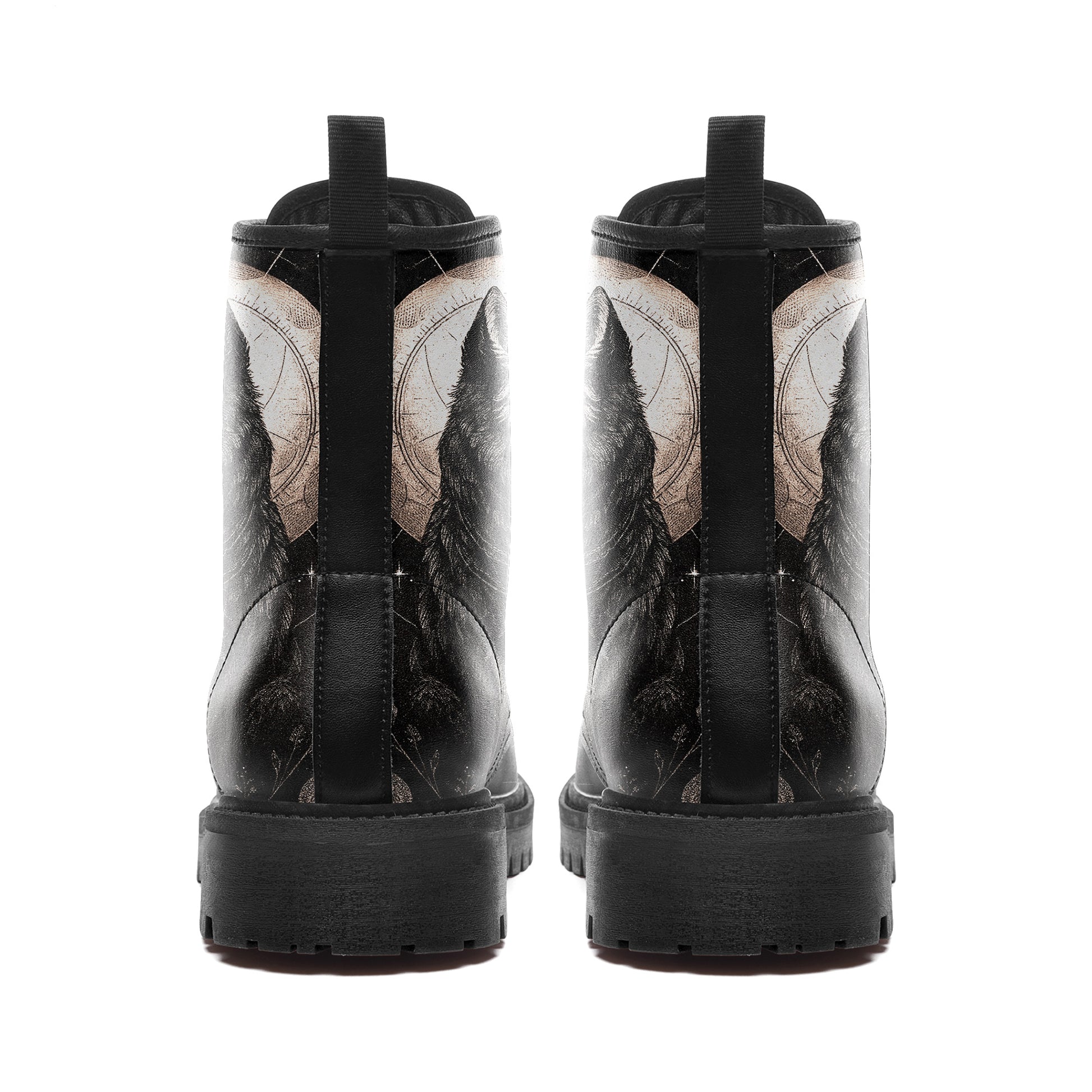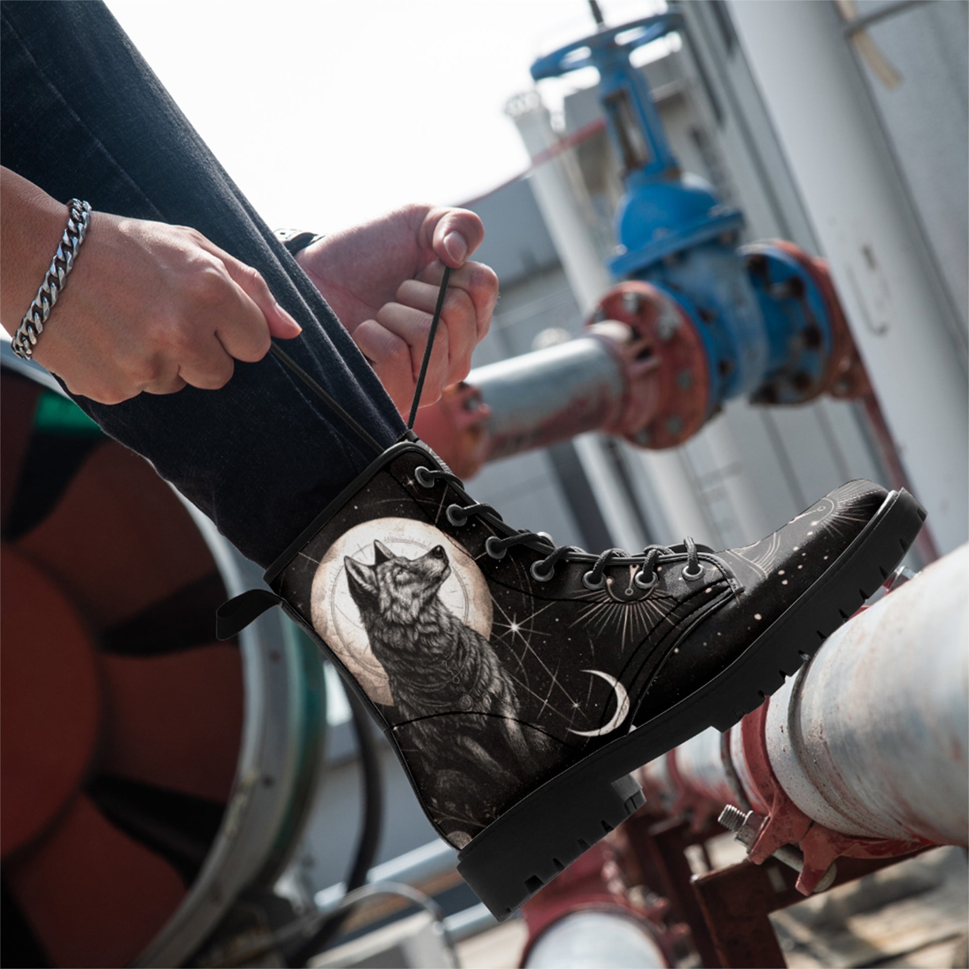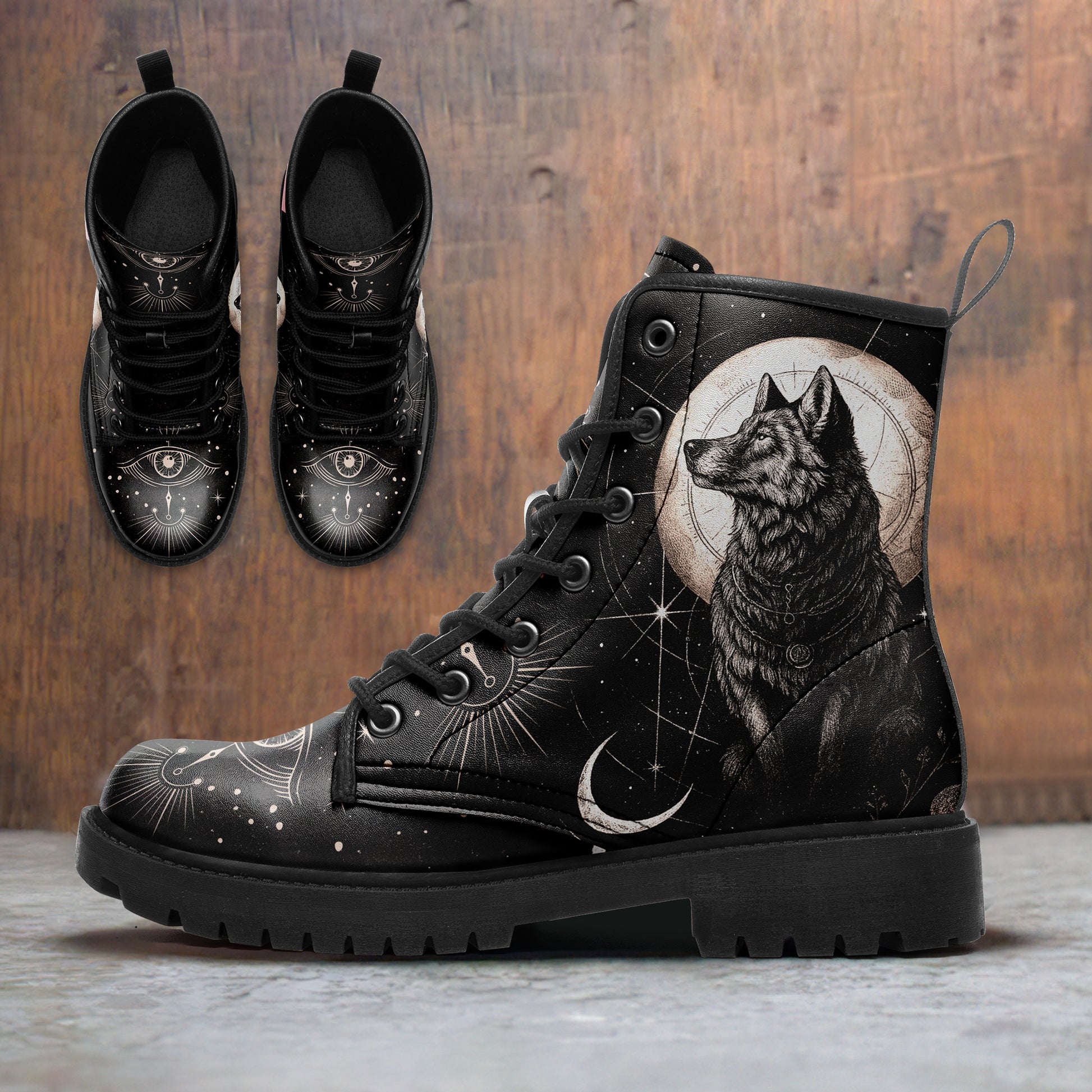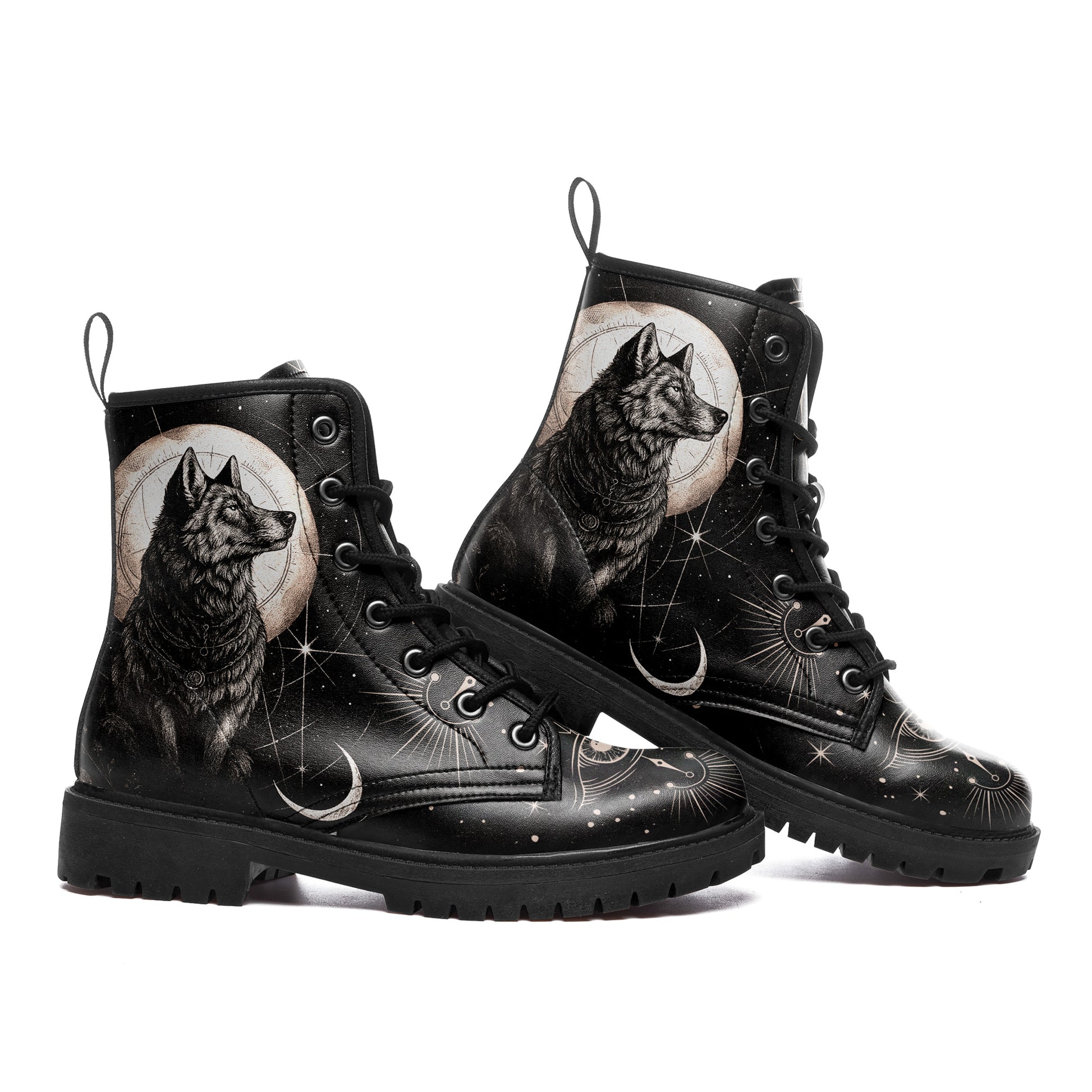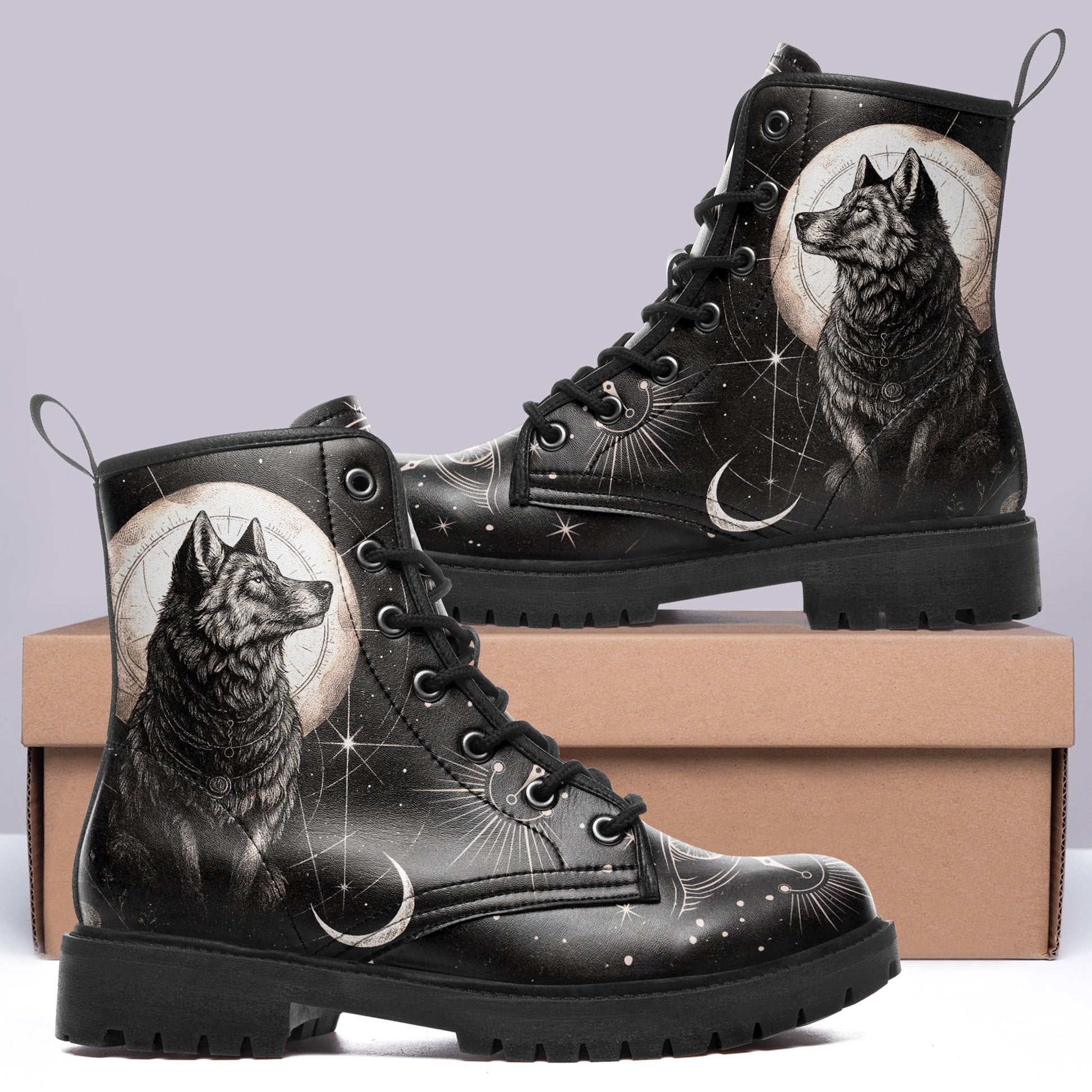 Walk with the spirit of the wild. These combat boots are a tribute to intuition, freedom, and the night. The design features a **noble wolf profile** set against a backdrop of sacred geometry and moon phases.