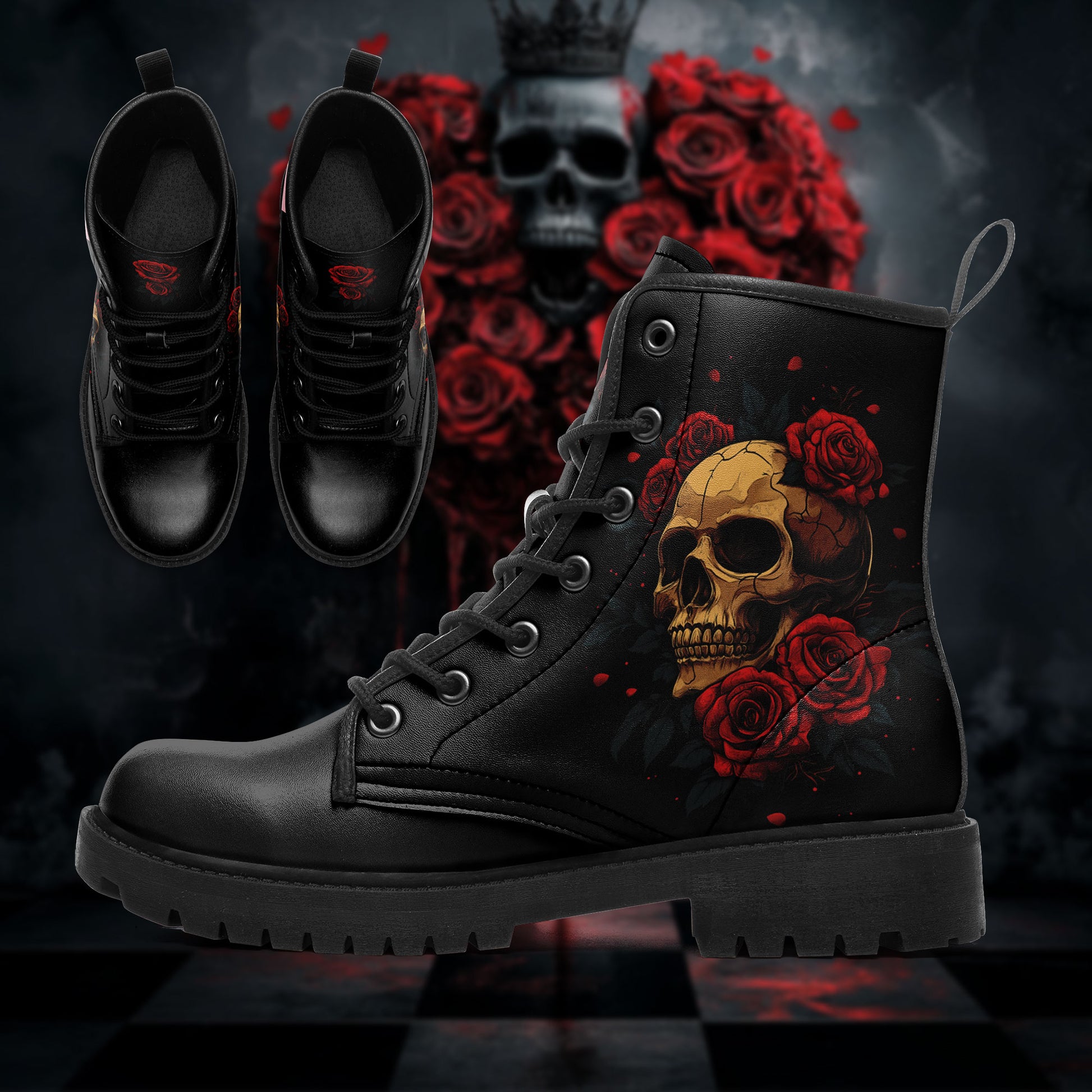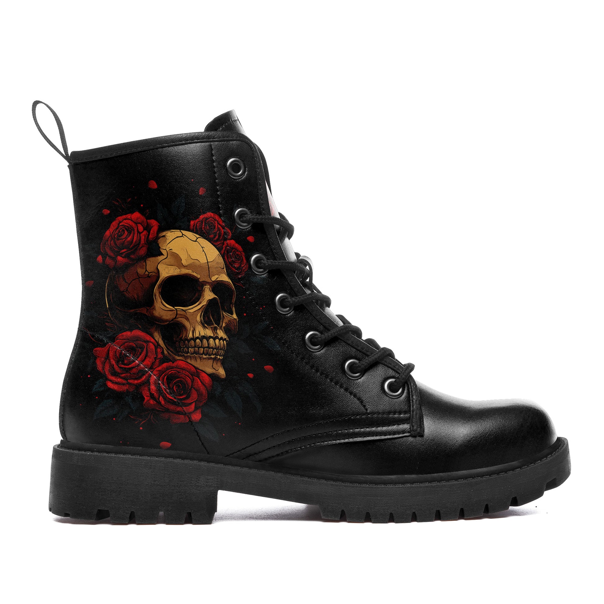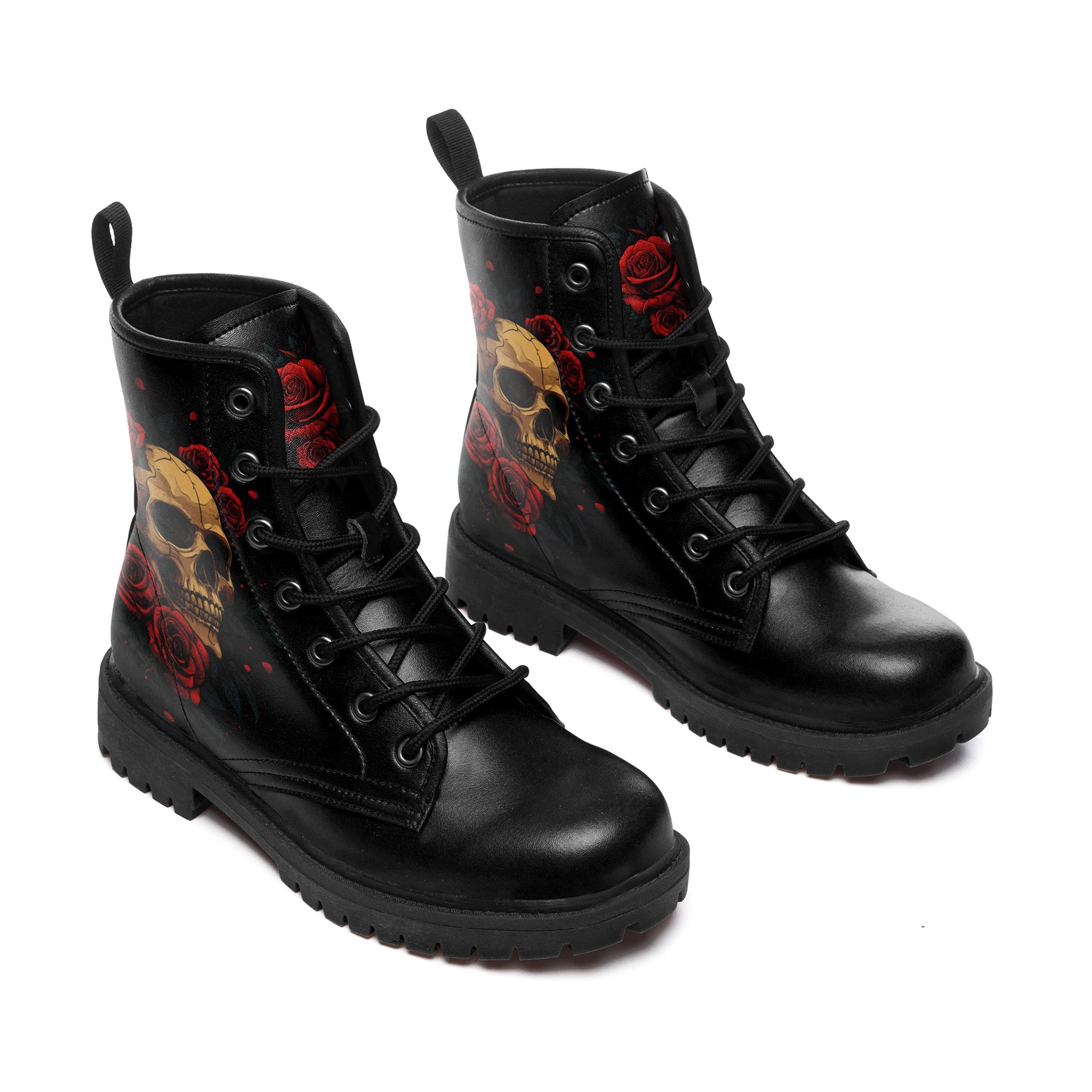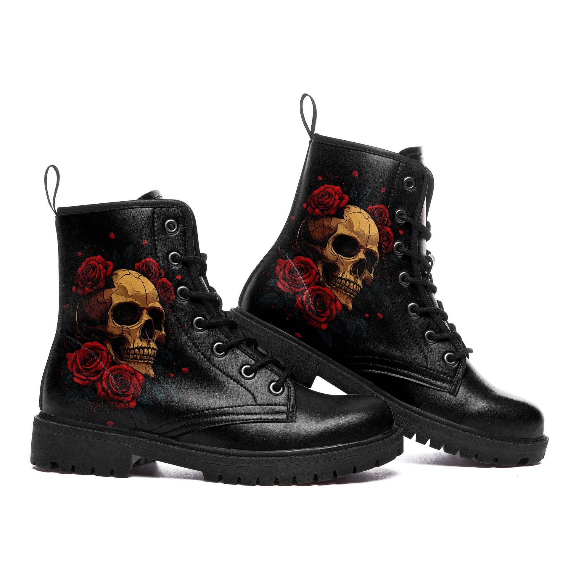 Some legends never die. These combat boots feature the most iconic duo in rock-n-roll history: the **skull and the rose**. A beautifully shaded, **golden-hued skeleton** profile is framed by deep red blooms, creating a look that is equal parts gritty and elegant.