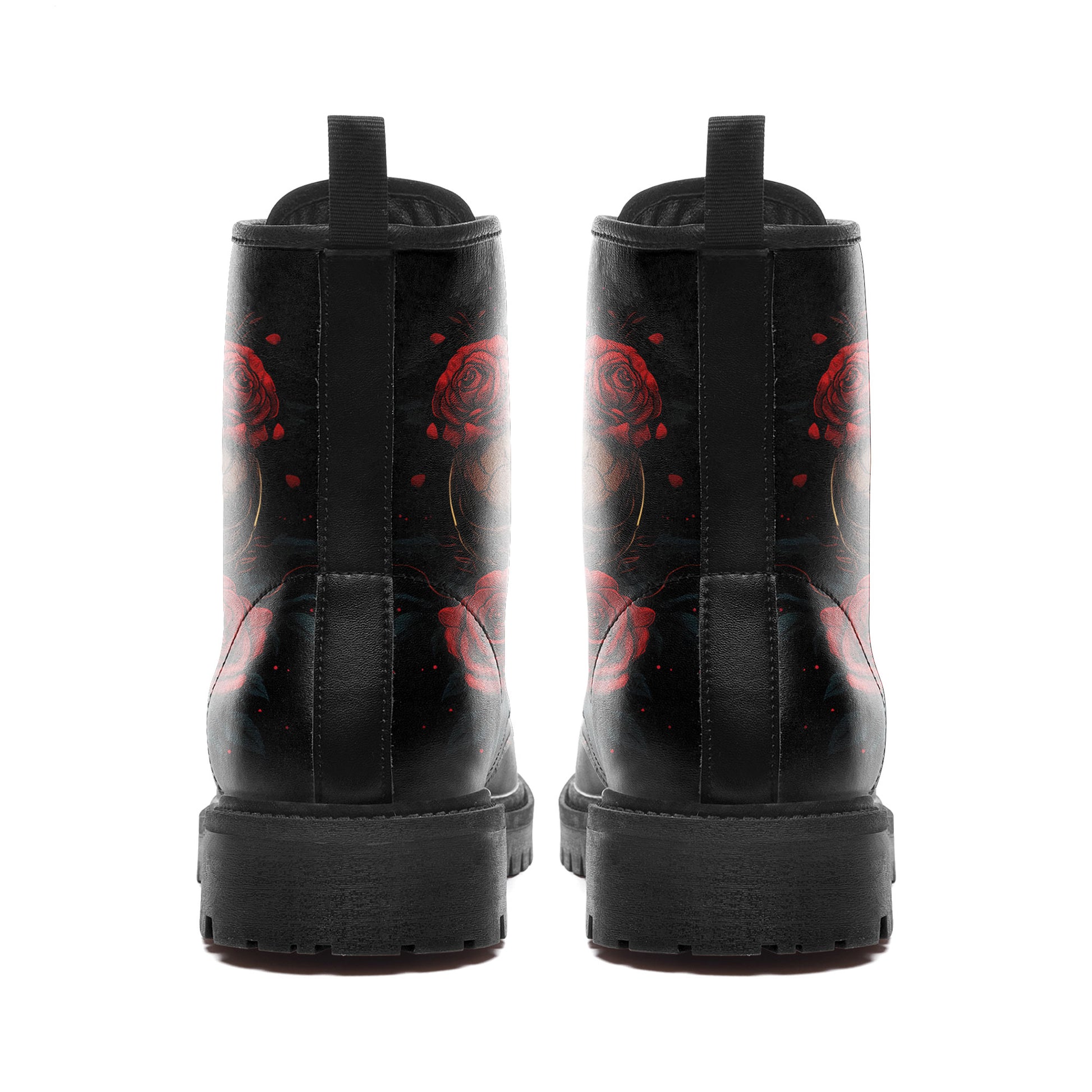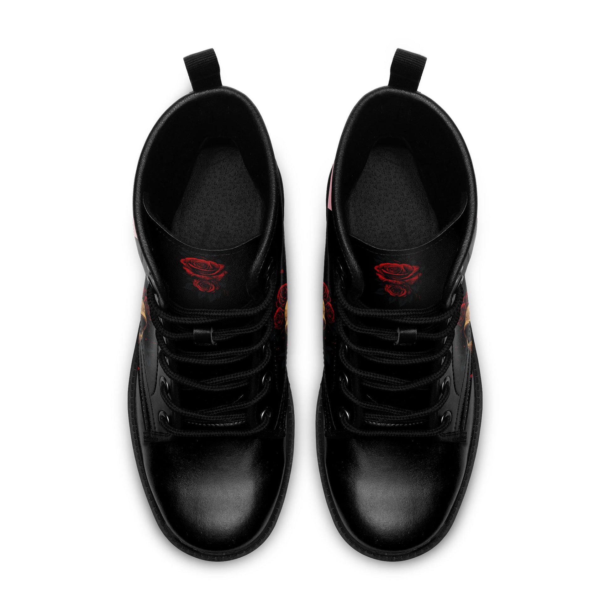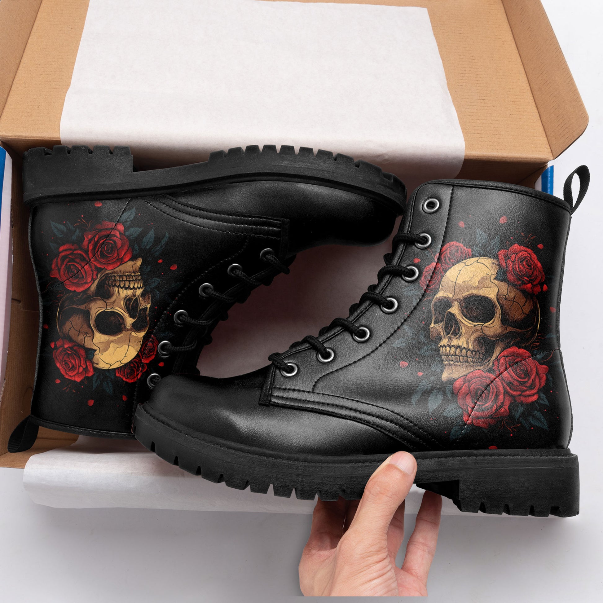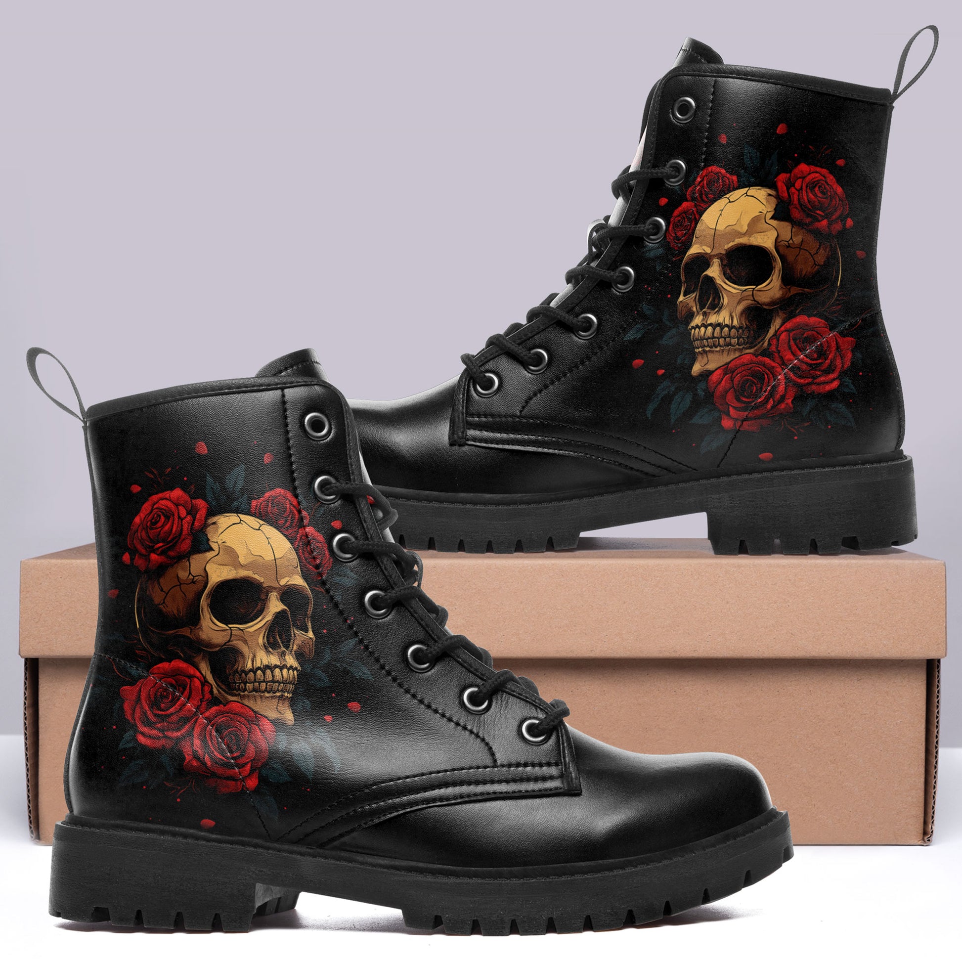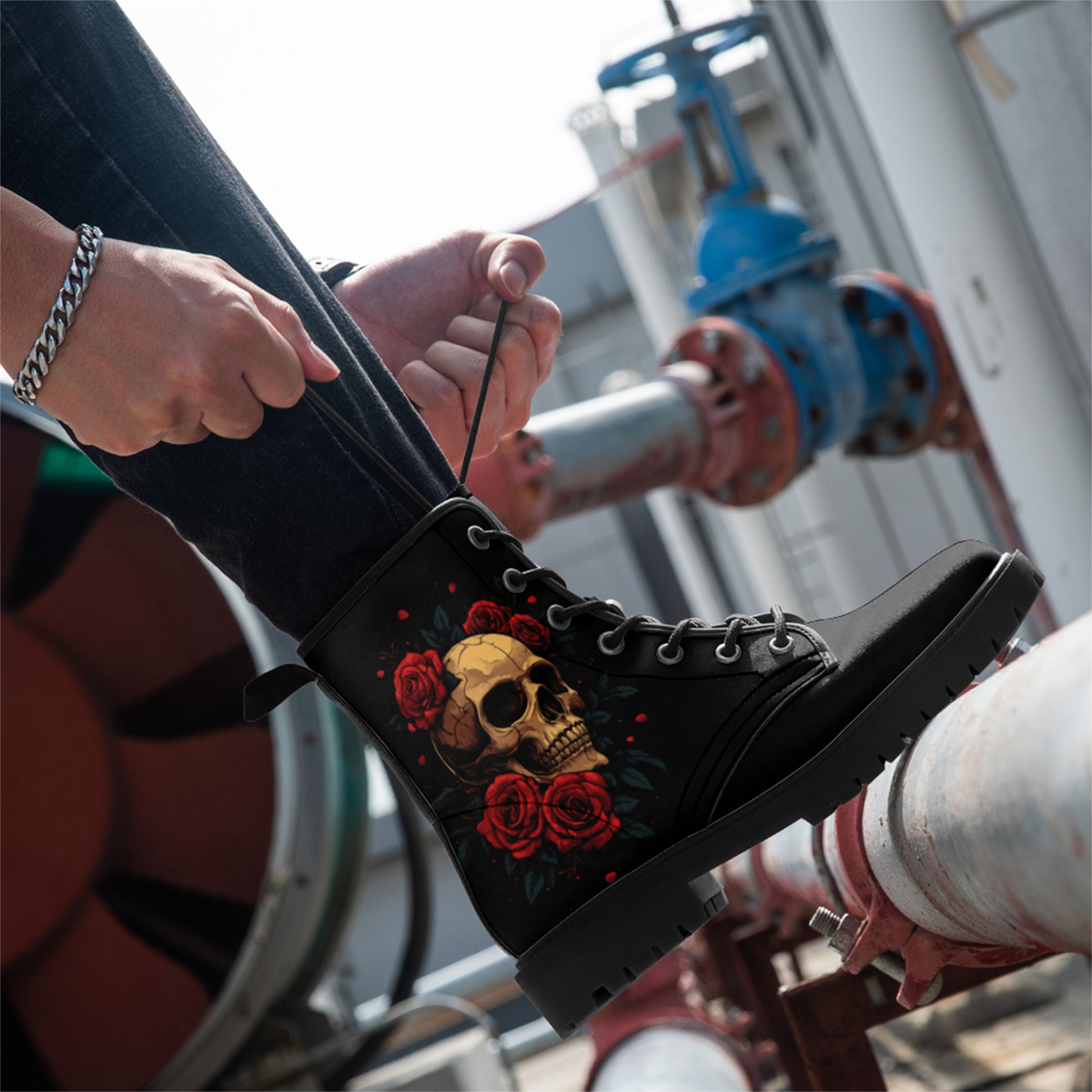 Some legends never die. These combat boots feature the most iconic duo in rock-n-roll history: the **skull and the rose**. A beautifully shaded, **golden-hued skeleton** profile is framed by deep red blooms, creating a look that is equal parts gritty and elegant.