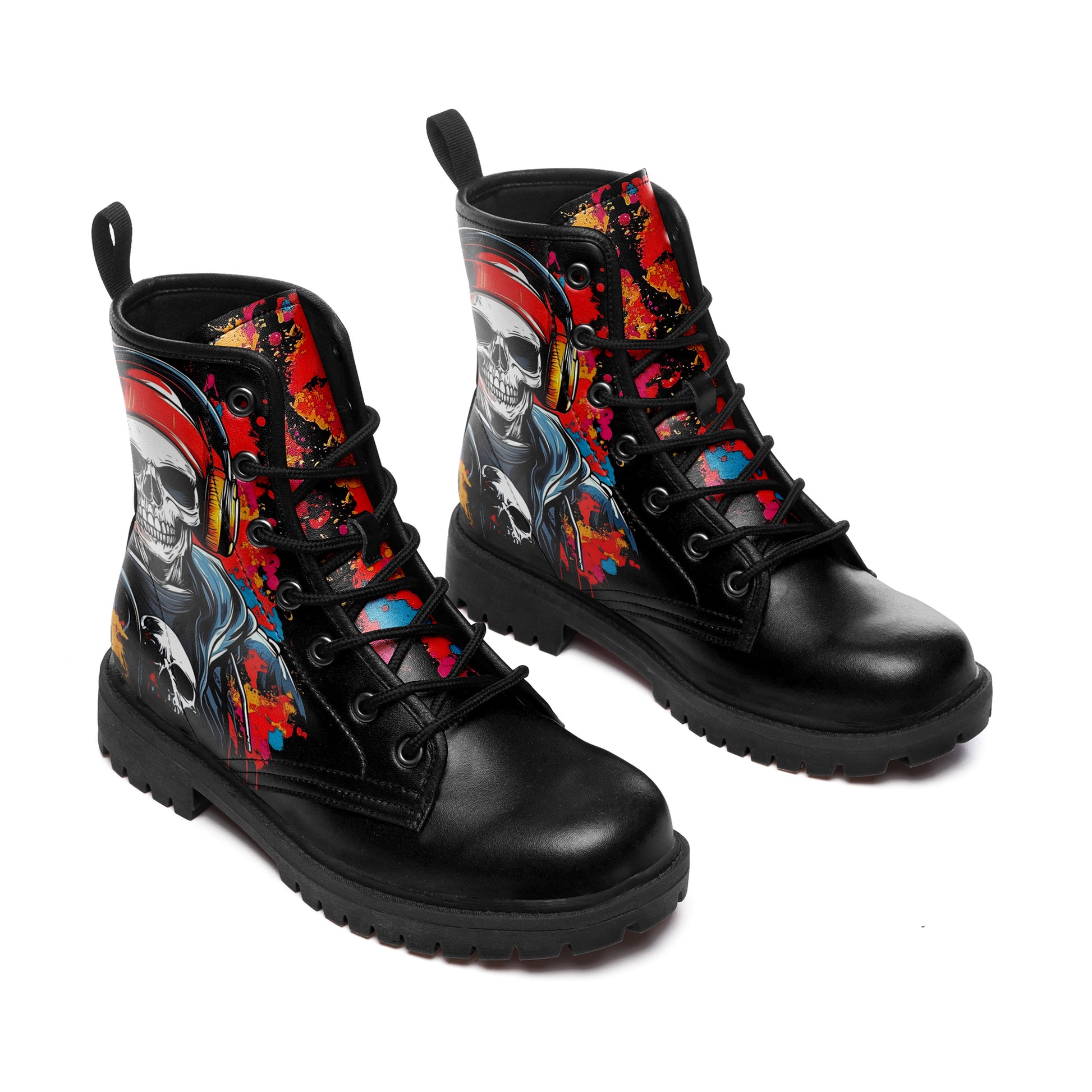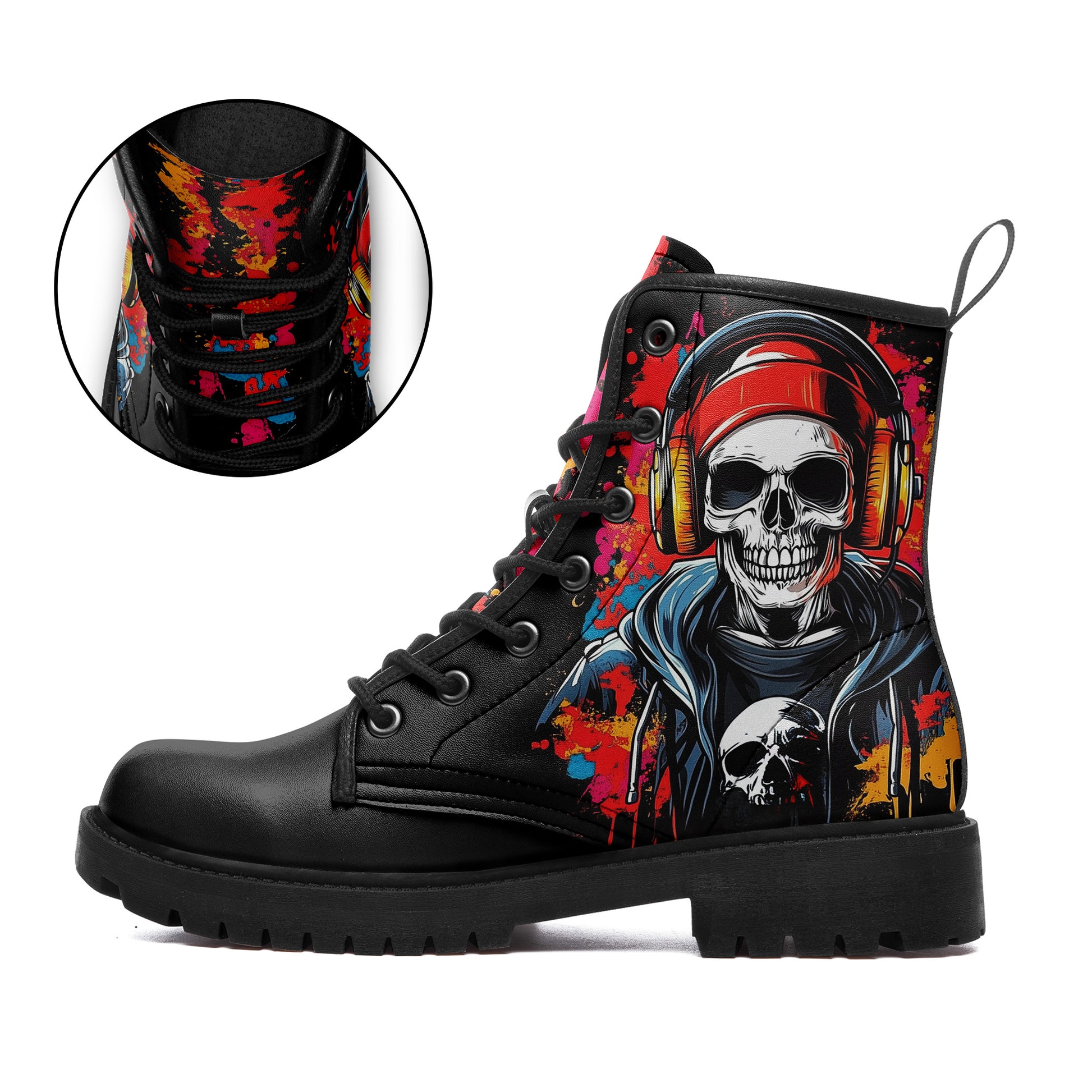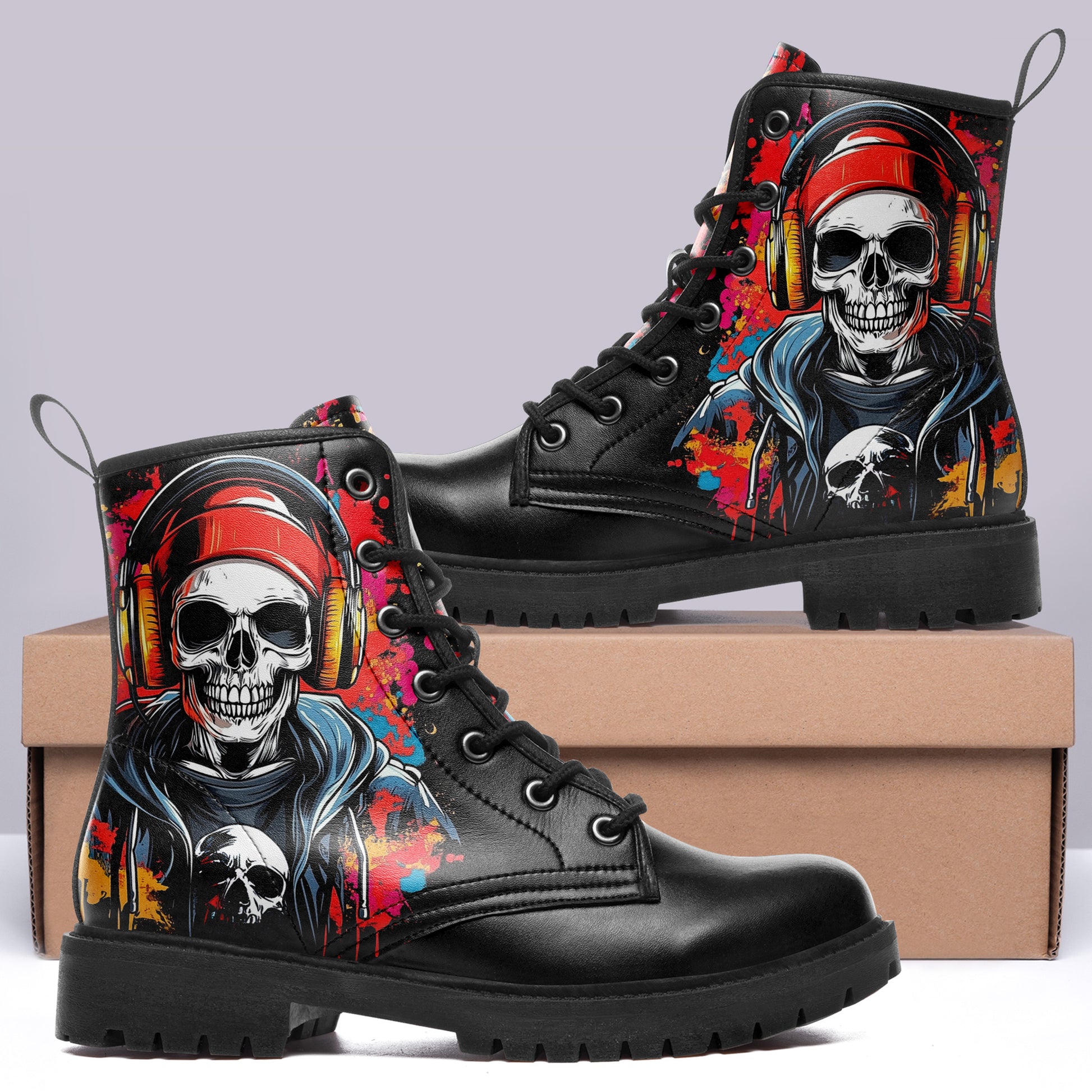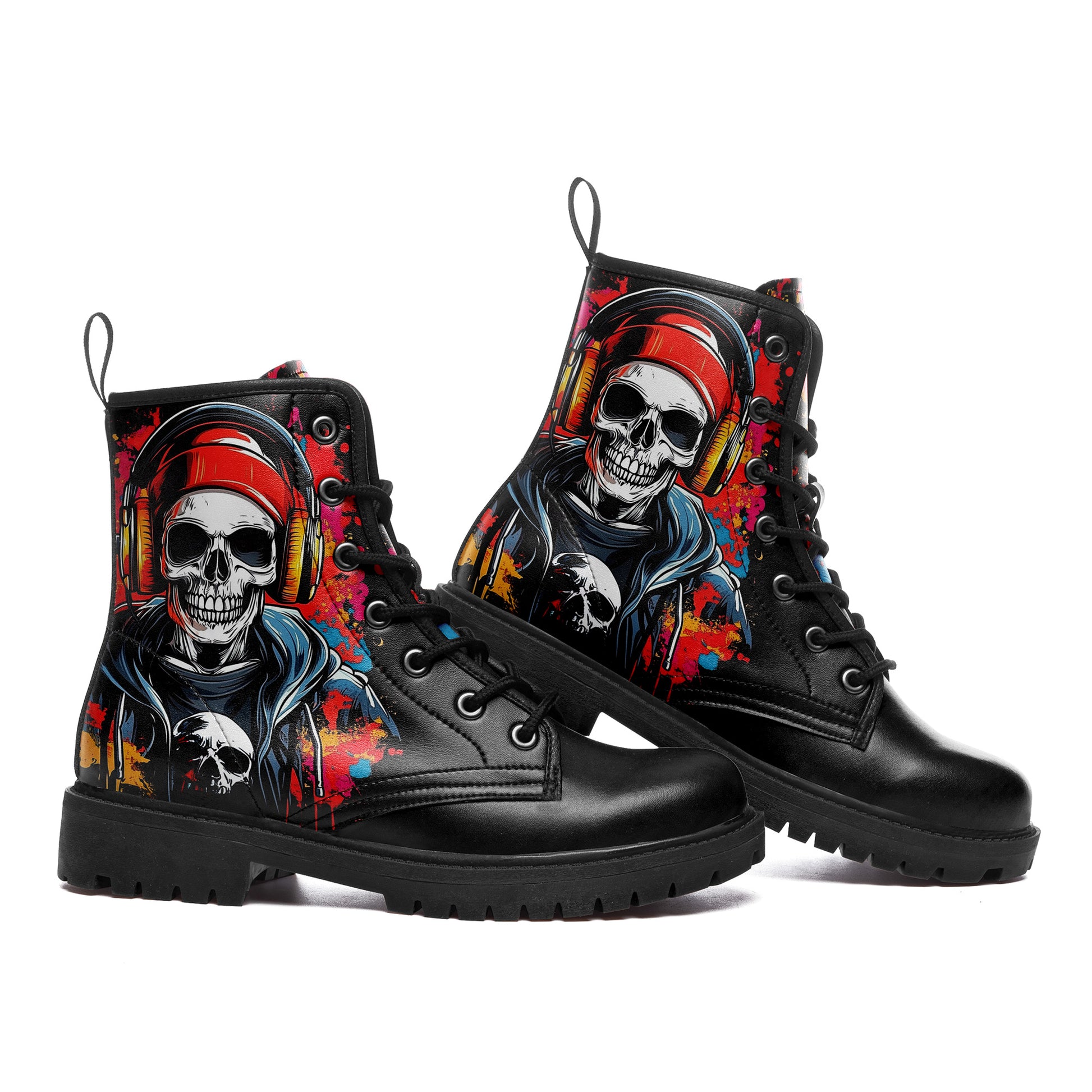 Live life in full color. These combat boots are a tribute to the creators, the artists, and the beat-makers. Featuring a **skull rocking a red beanie and headphones**, this design is an explosion of urban style.