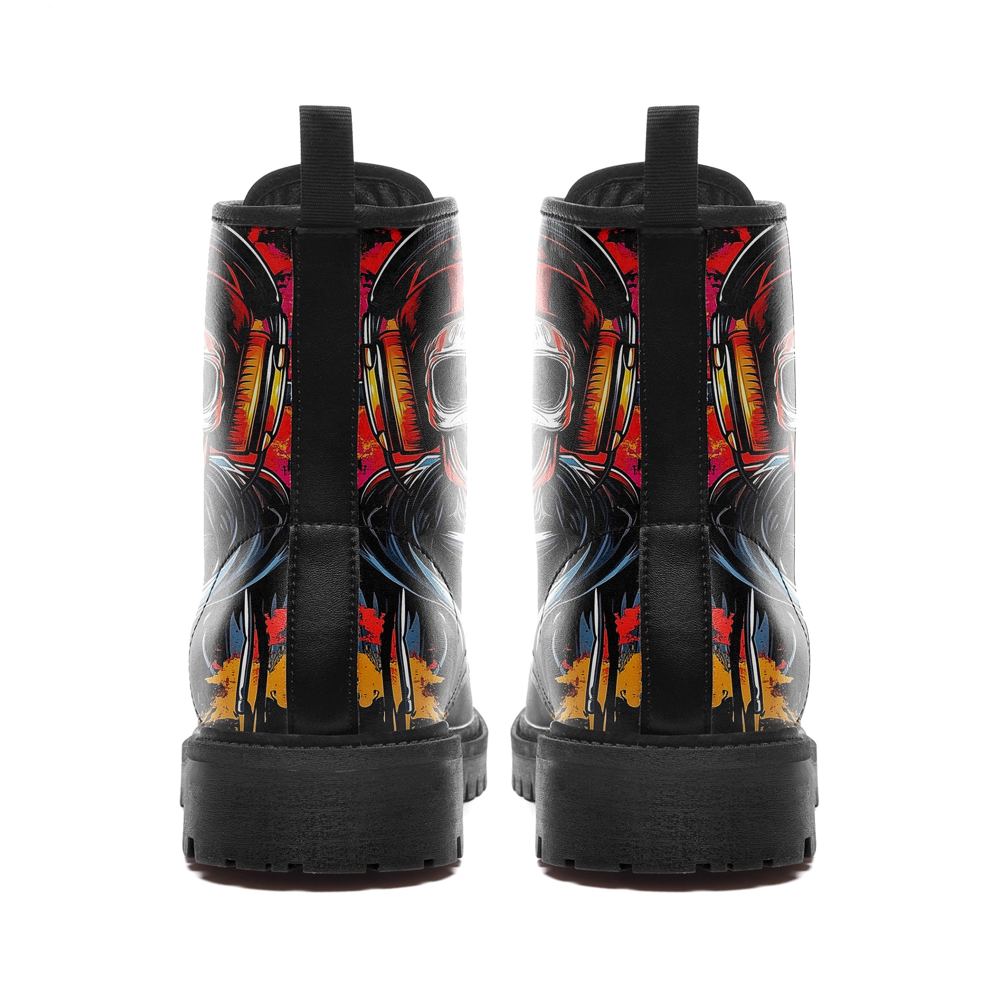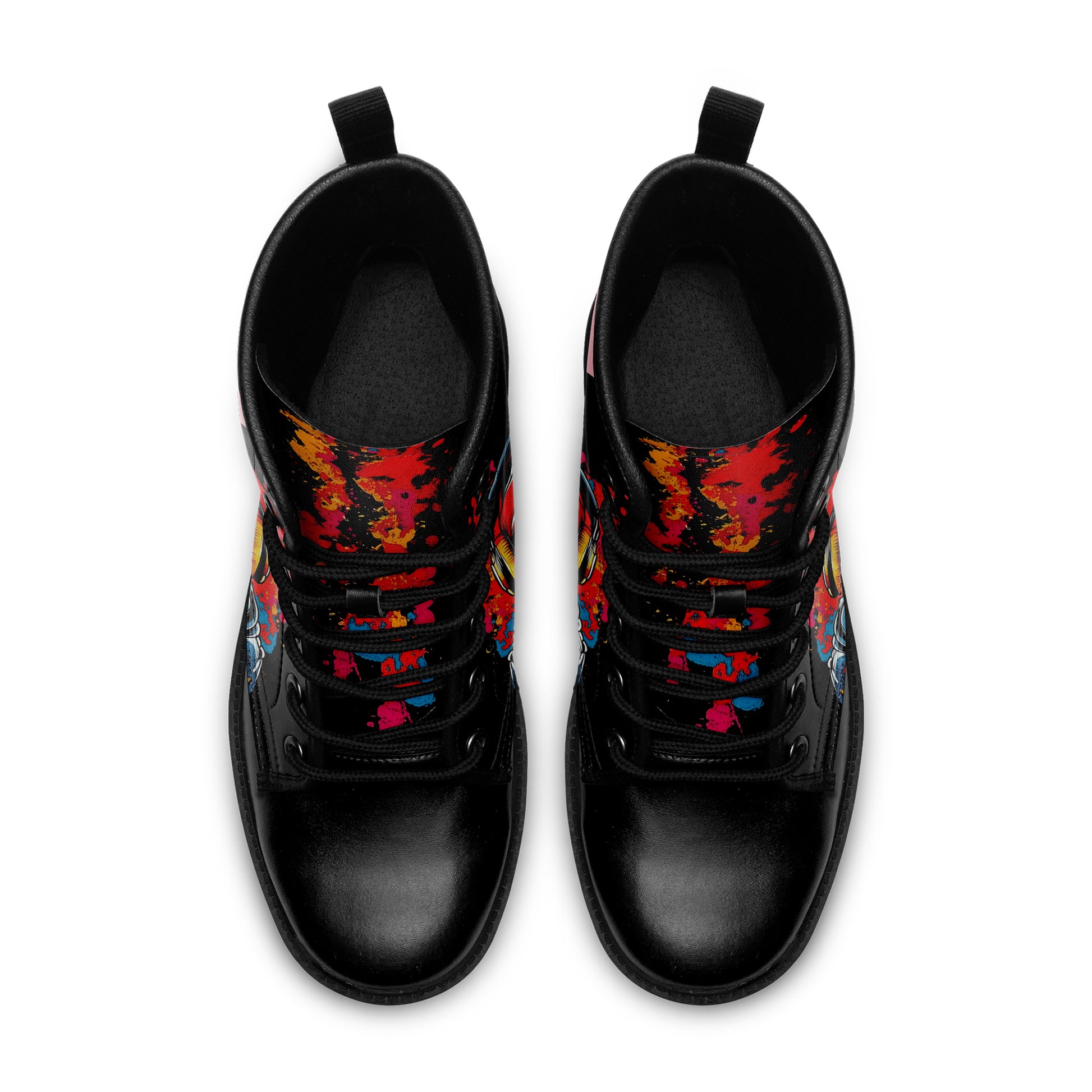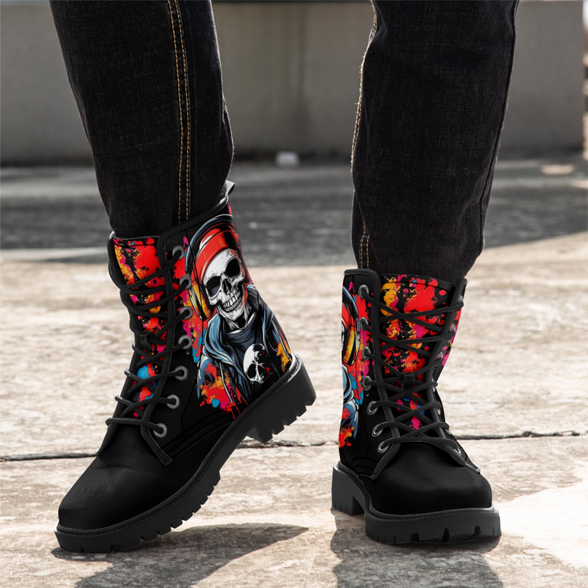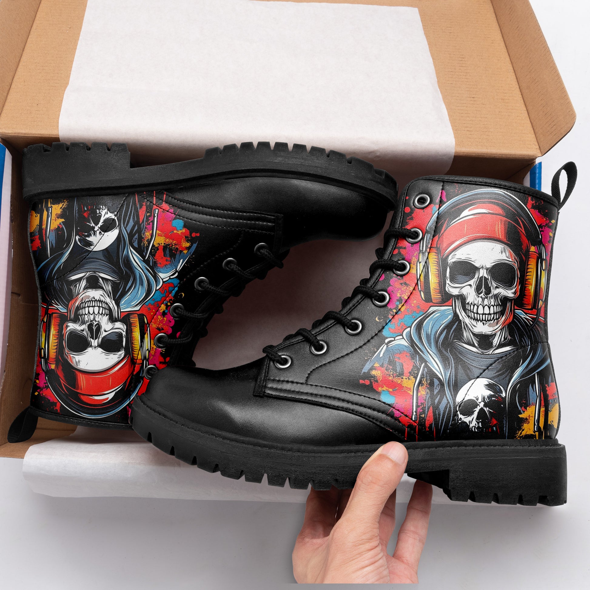 Live life in full color. These combat boots are a tribute to the creators, the artists, and the beat-makers. Featuring a **skull rocking a red beanie and headphones**, this design is an explosion of urban style.