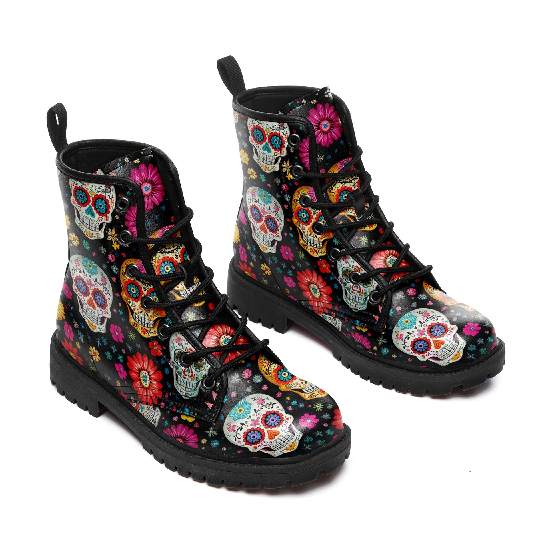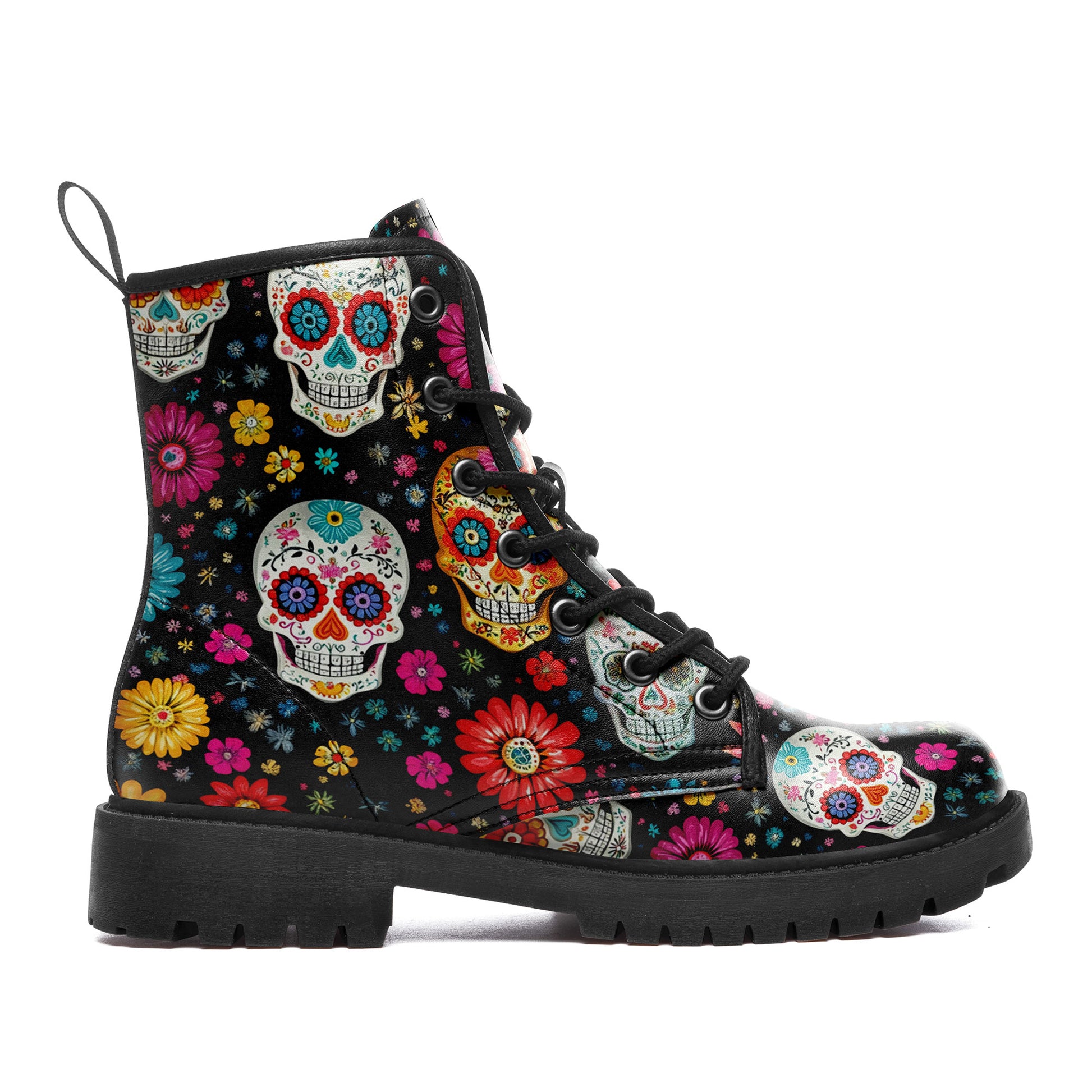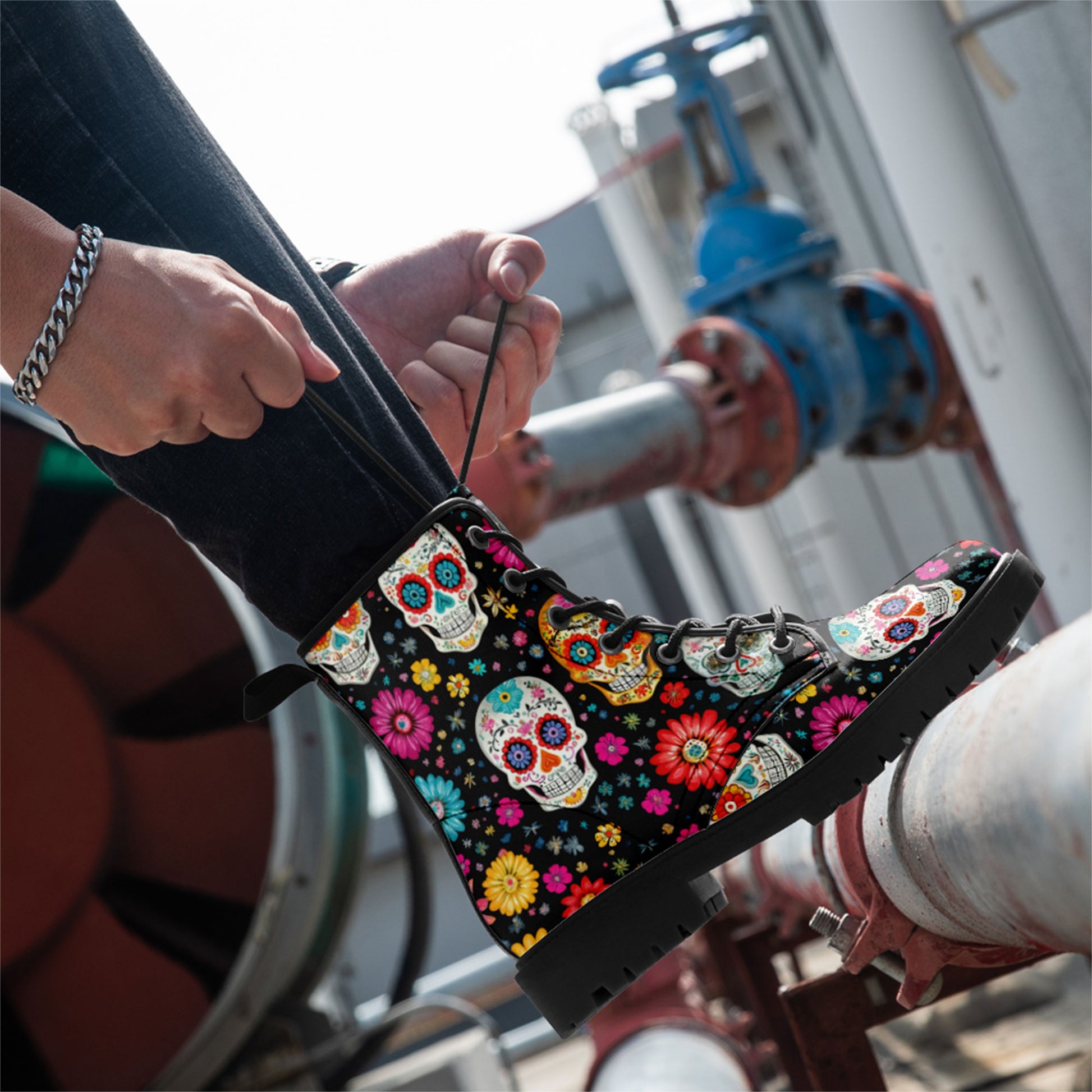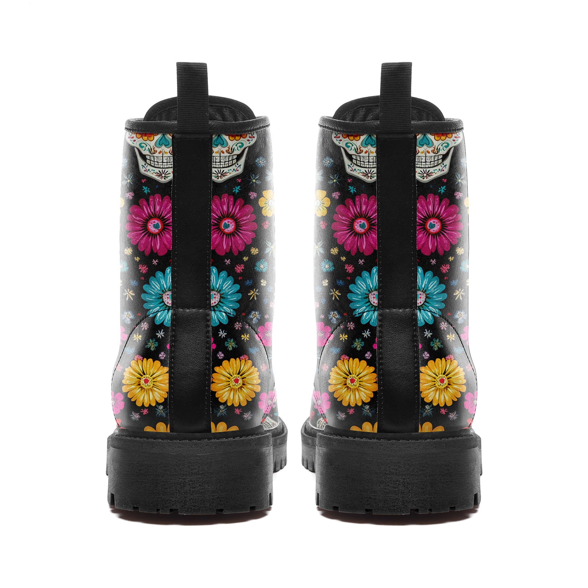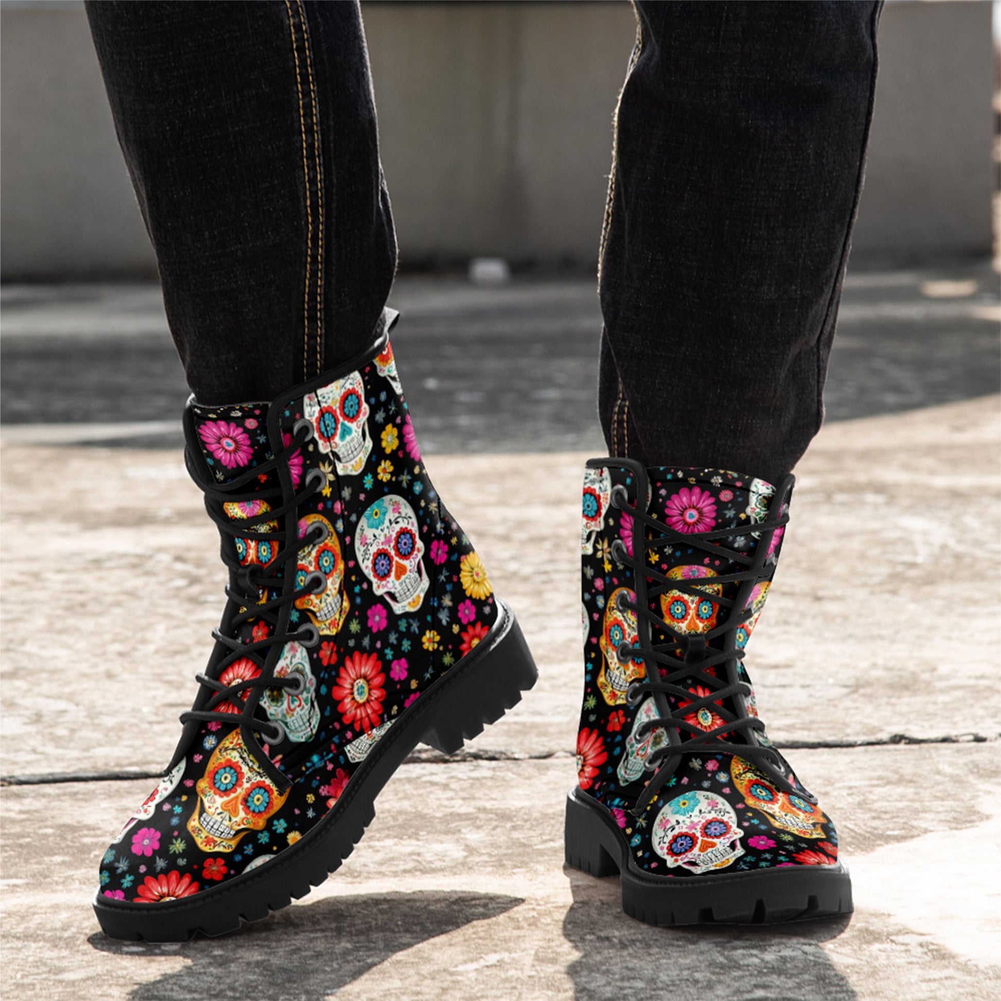 Colorful Sugar Skull & Flower Pattern Combat Boots - Mexican Folk Art Shoes 058-6-25009040-2