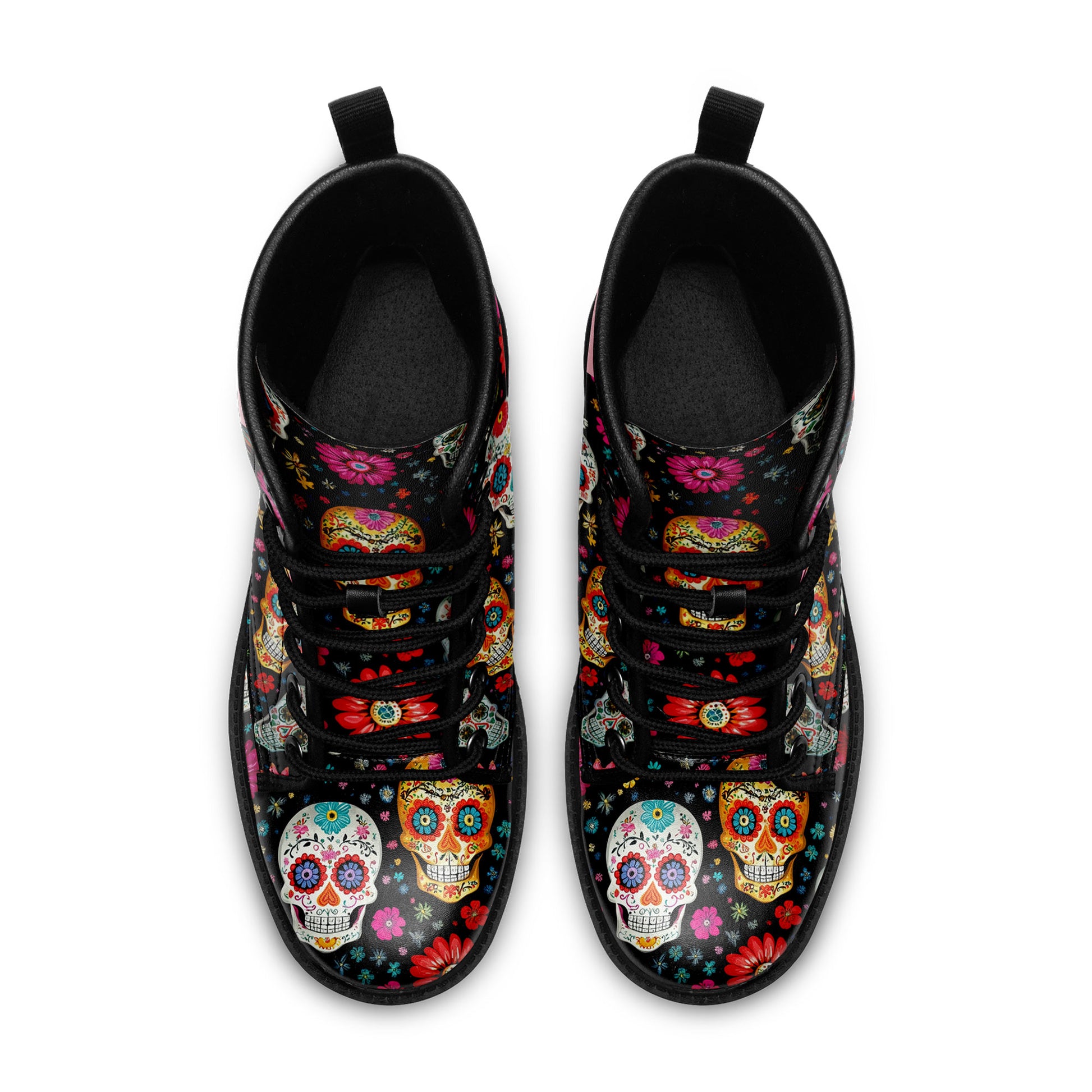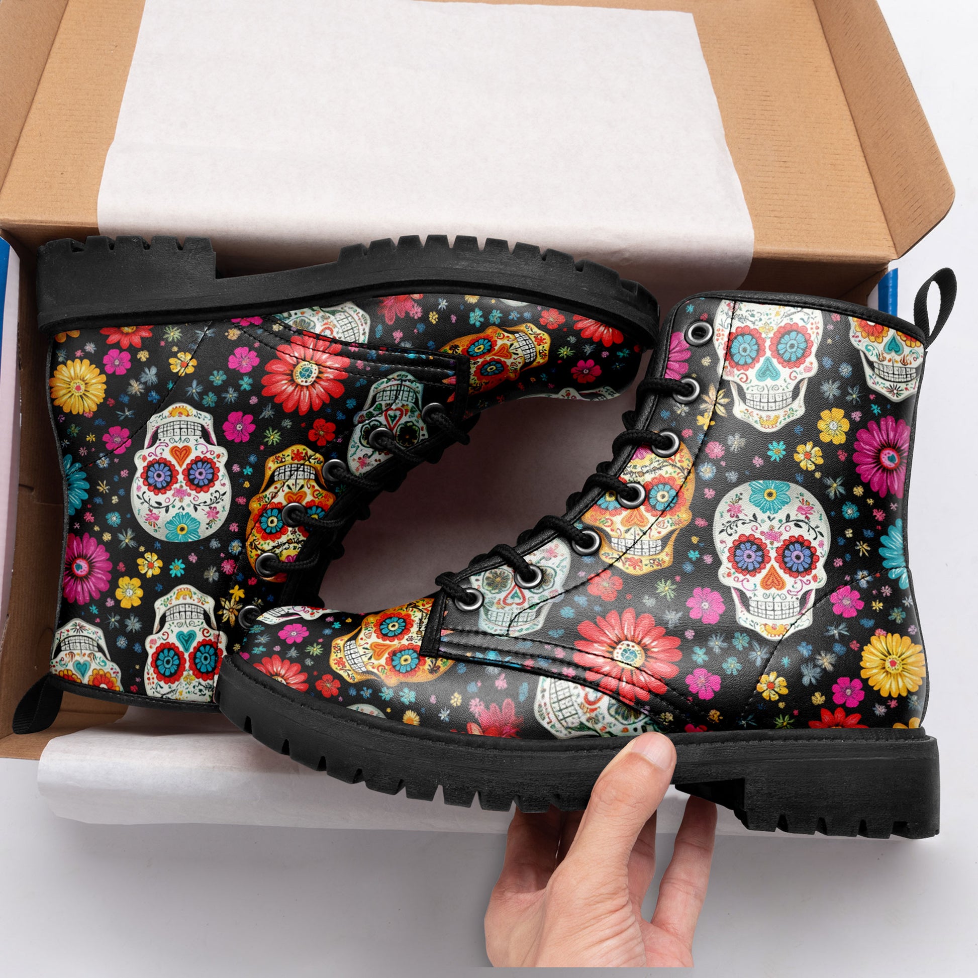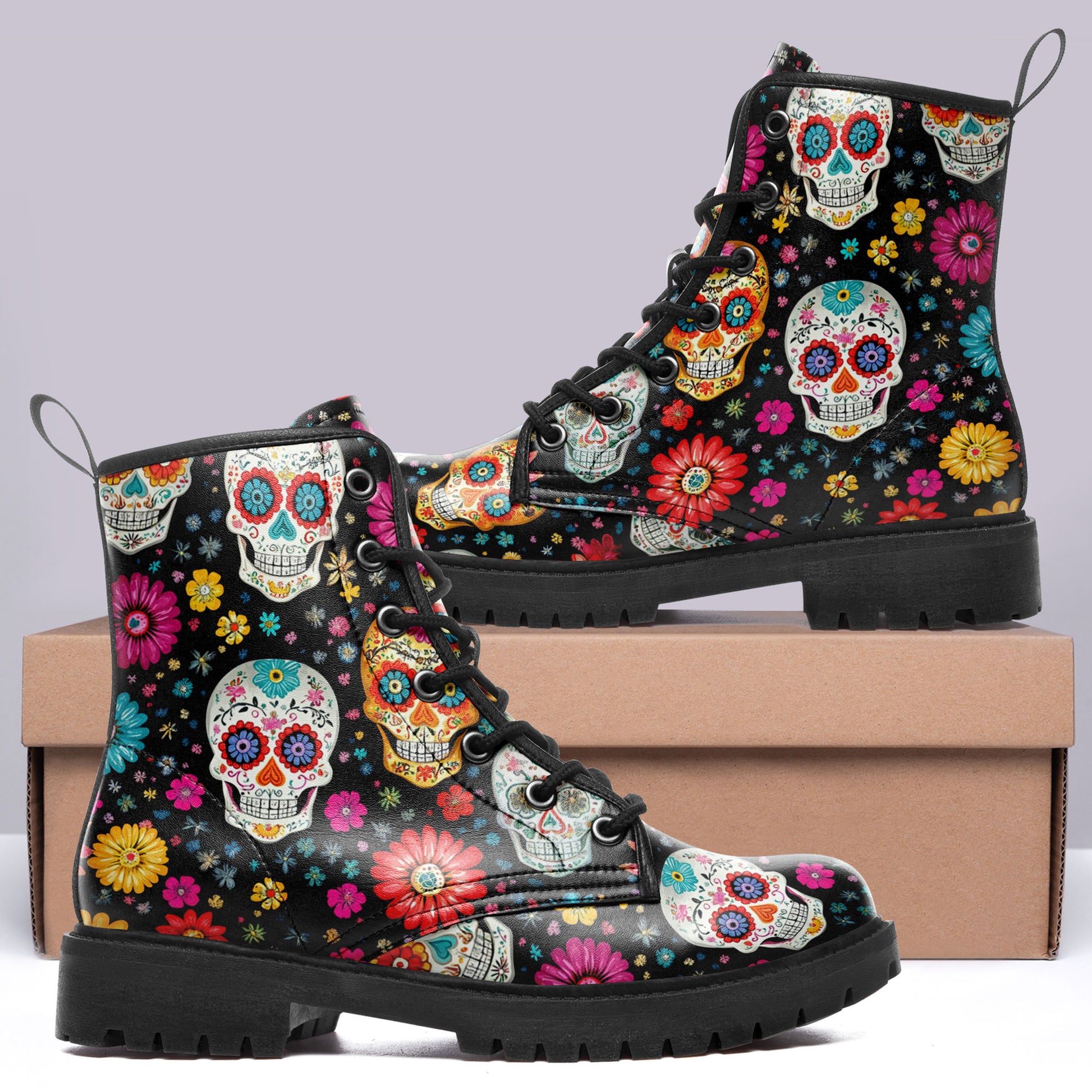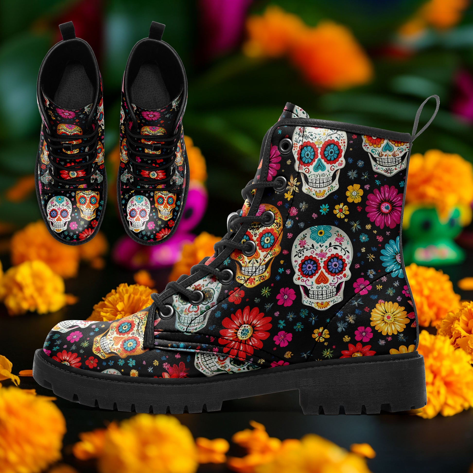 Celebrate life, memory, and color with every step. These combat boots are a vibrant tribute to the **Day of the Dead (Día de los Muertos)**, featuring intricate **sugar skulls** nestled among a bed of **marigolds and roses**.