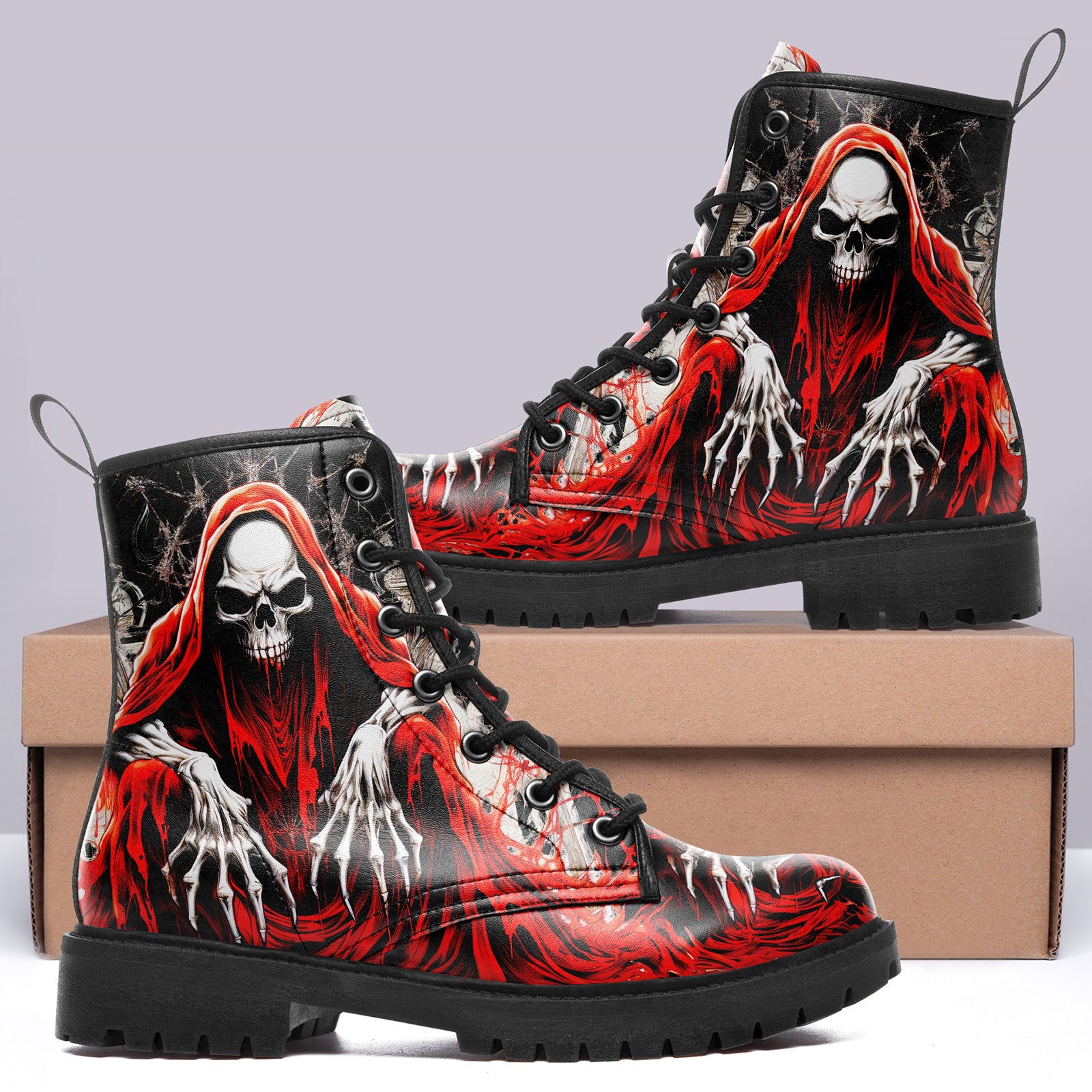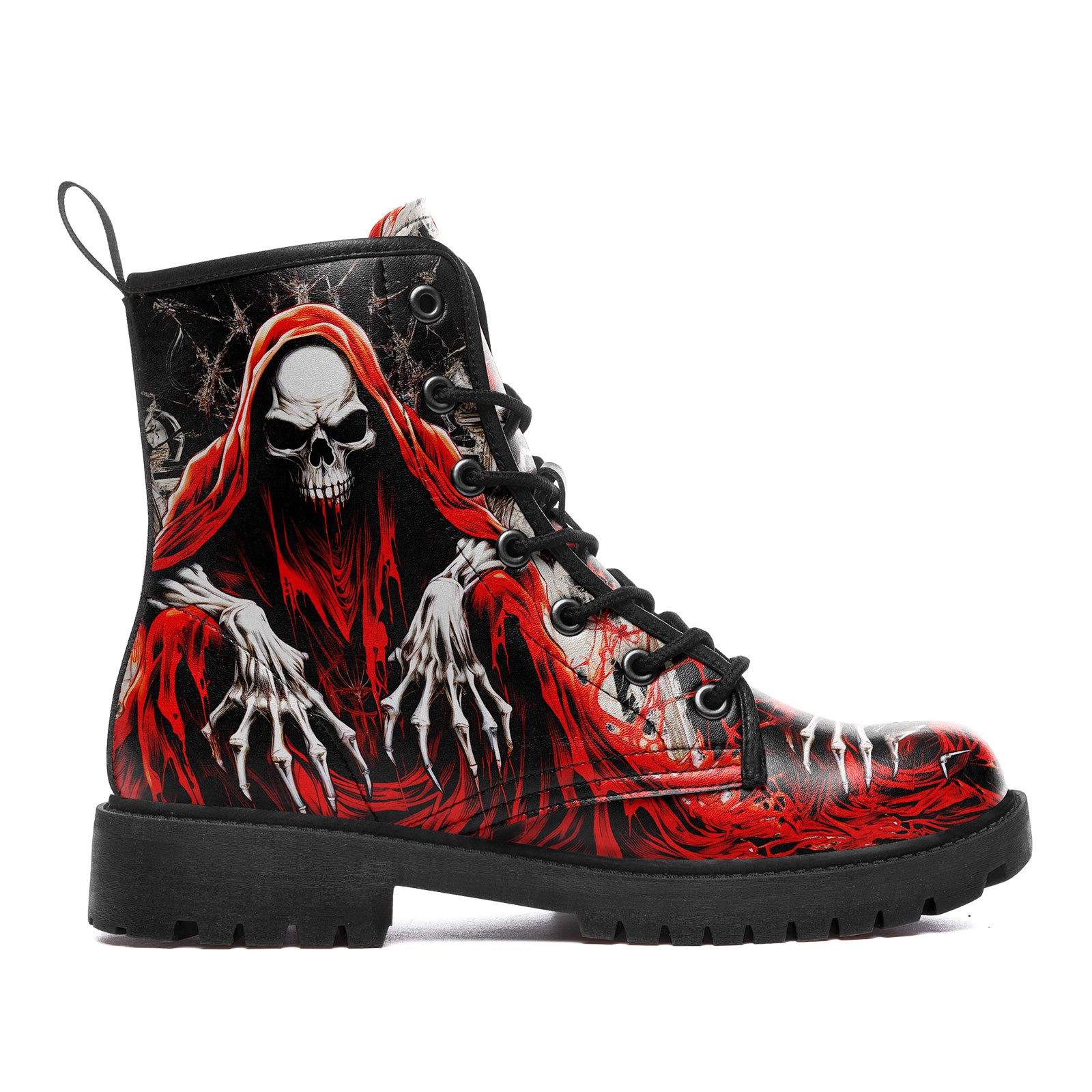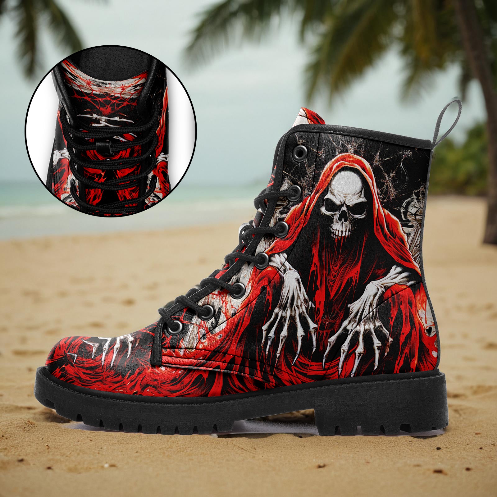 Command the darkness. These combat boots are a vision of pure power and dread. Featuring a terrifying **skeletal reaper draped in blood-red robes**, this design captures the essence of the underworld.