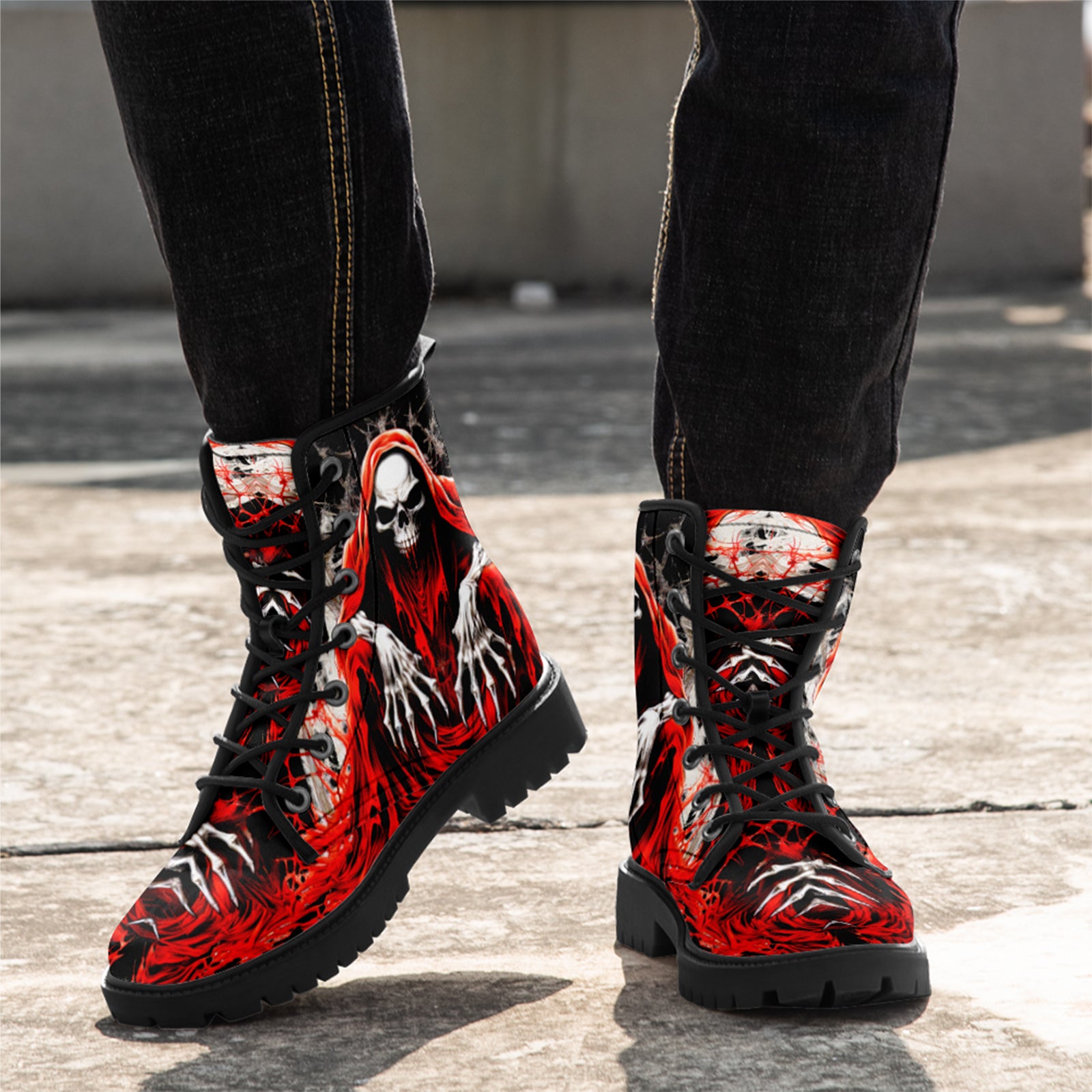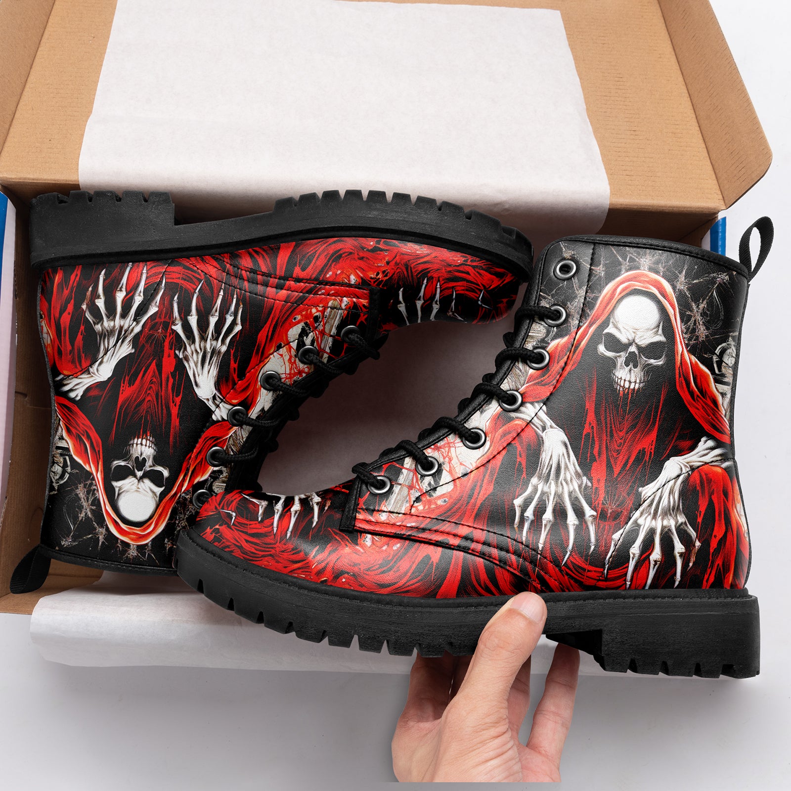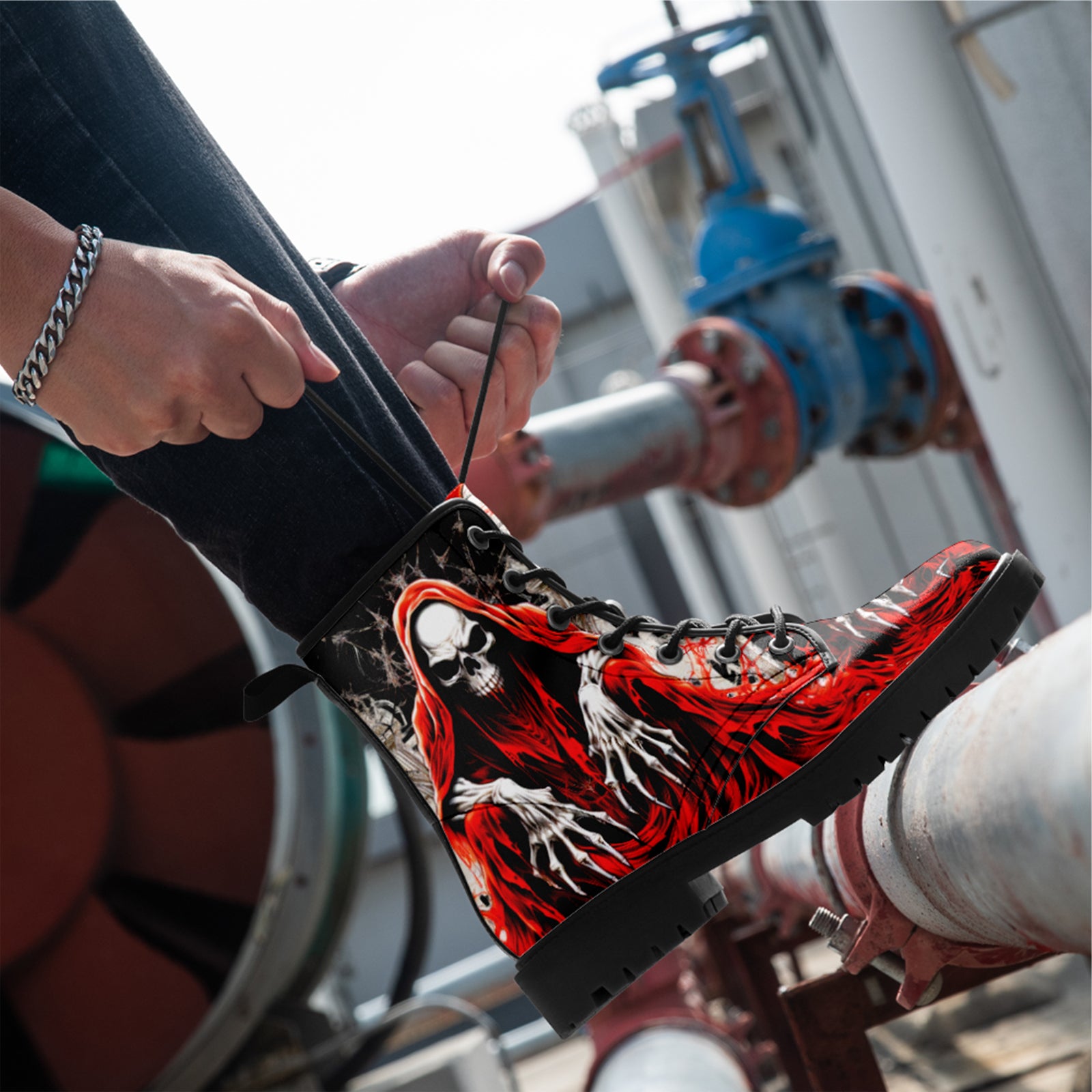 Command the darkness. These combat boots are a vision of pure power and dread. Featuring a terrifying **skeletal reaper draped in blood-red robes**, this design captures the essence of the underworld.
