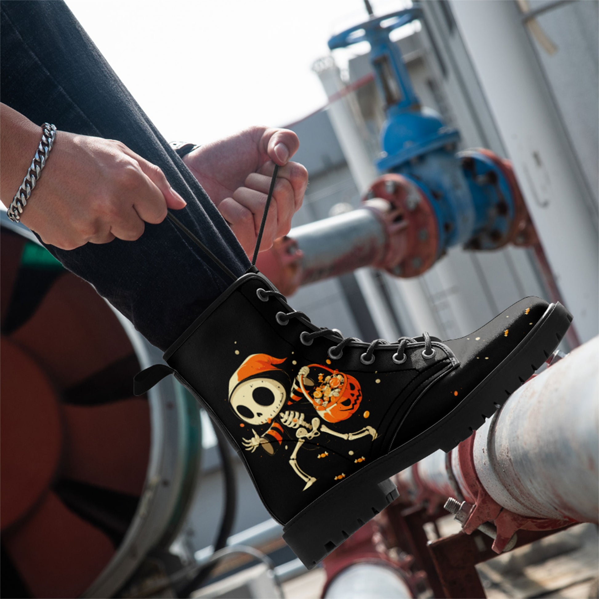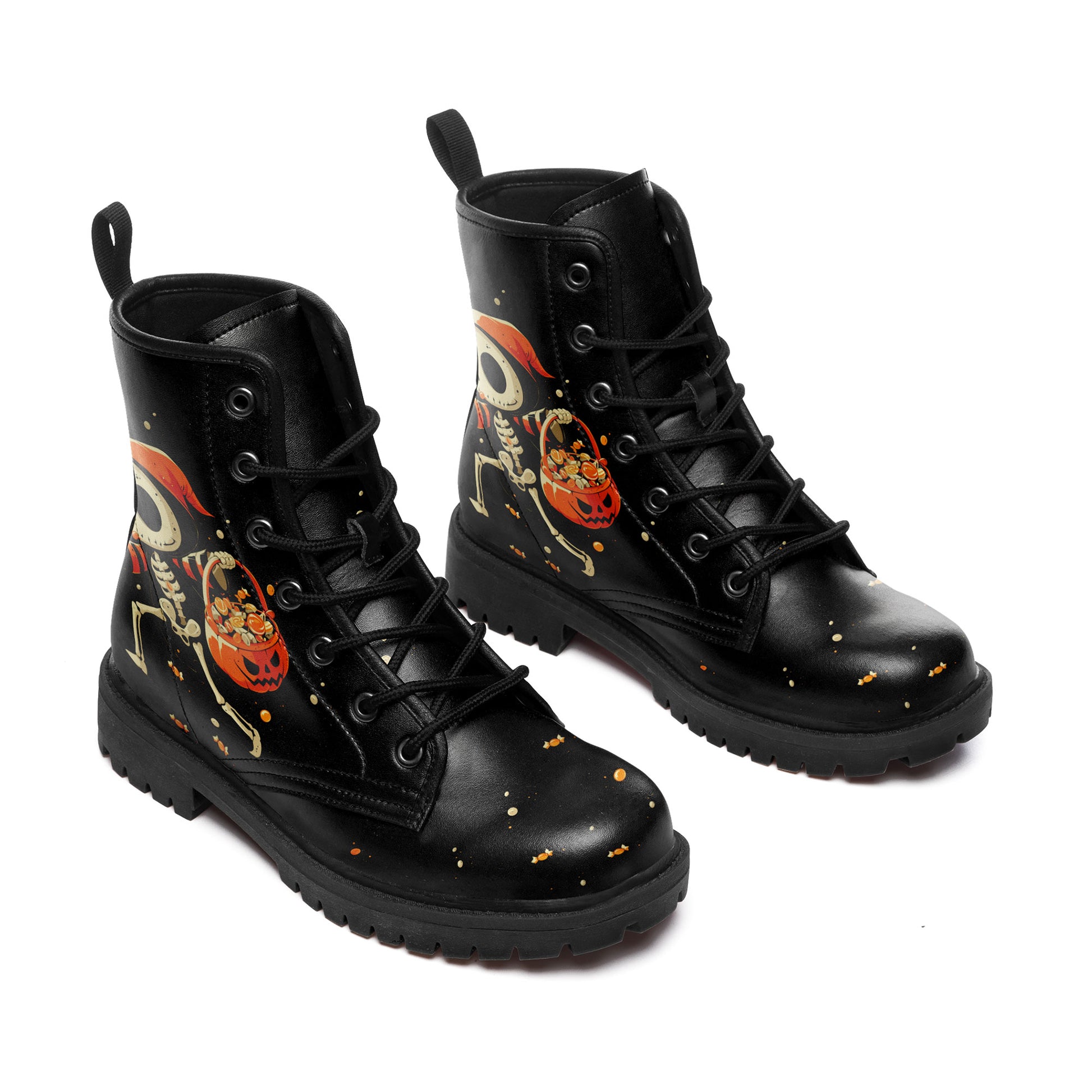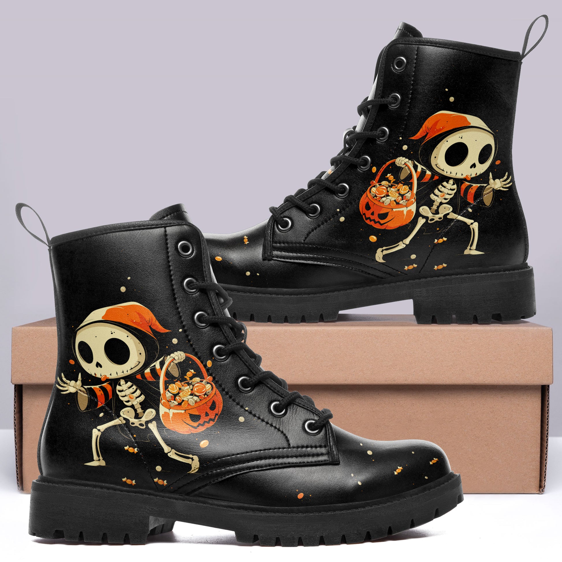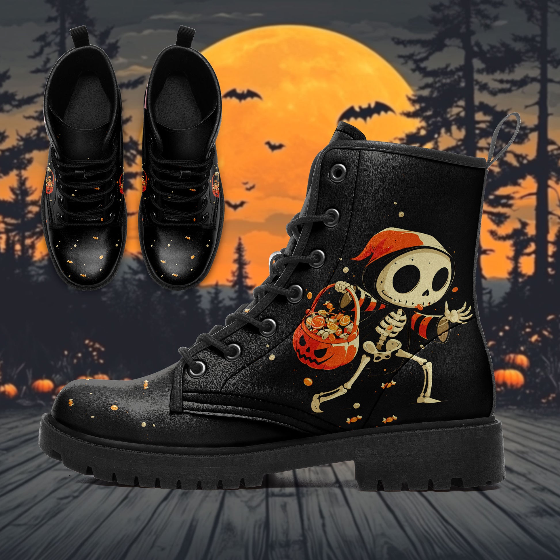 Relive the magic of the best night of the year. These adorable combat boots capture the pure joy of Halloween, featuring a **cute skeleton sprinting with a pumpkin bucket full of candy**.