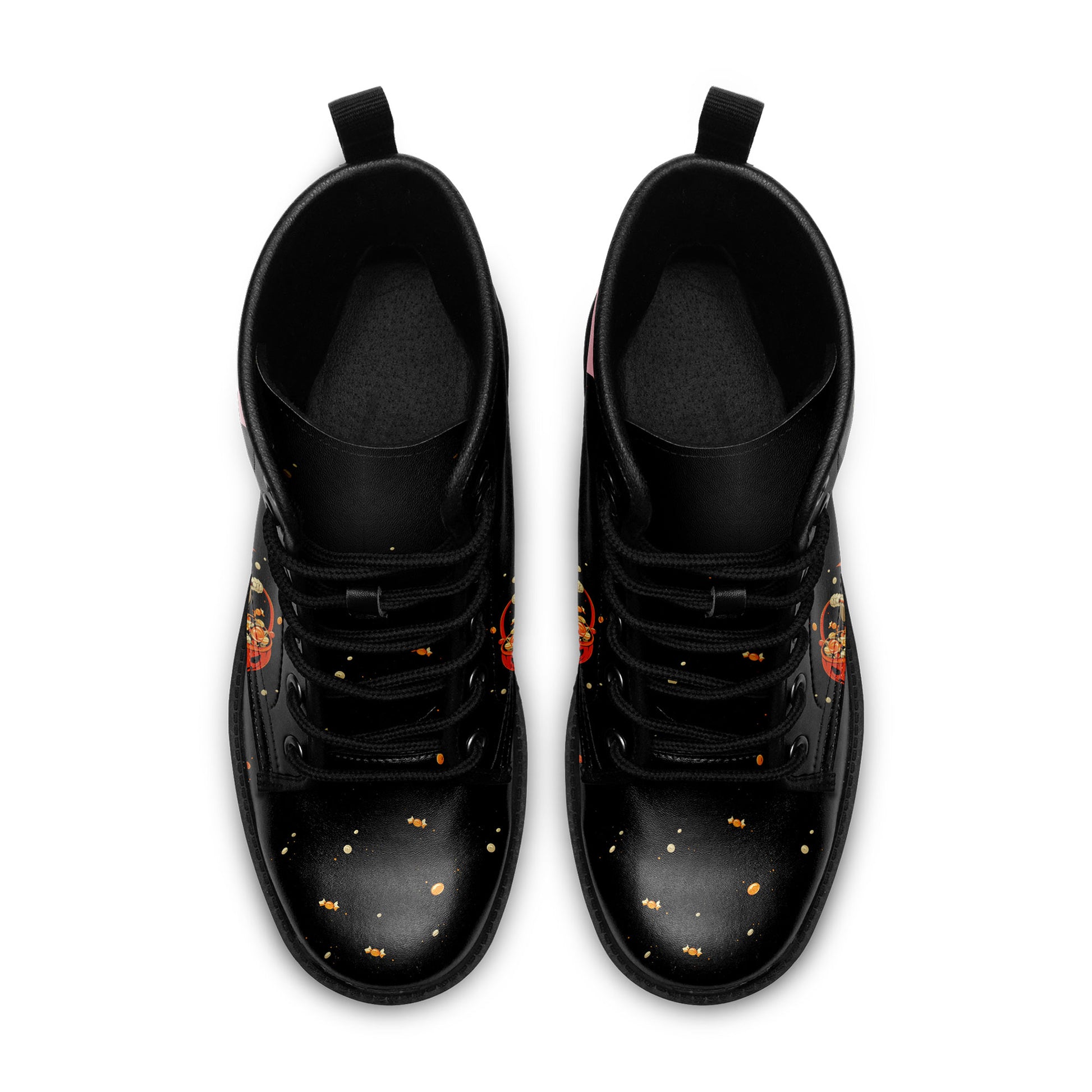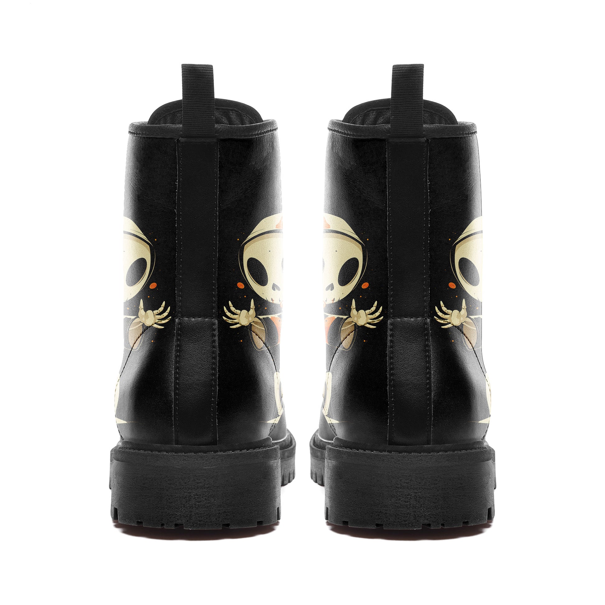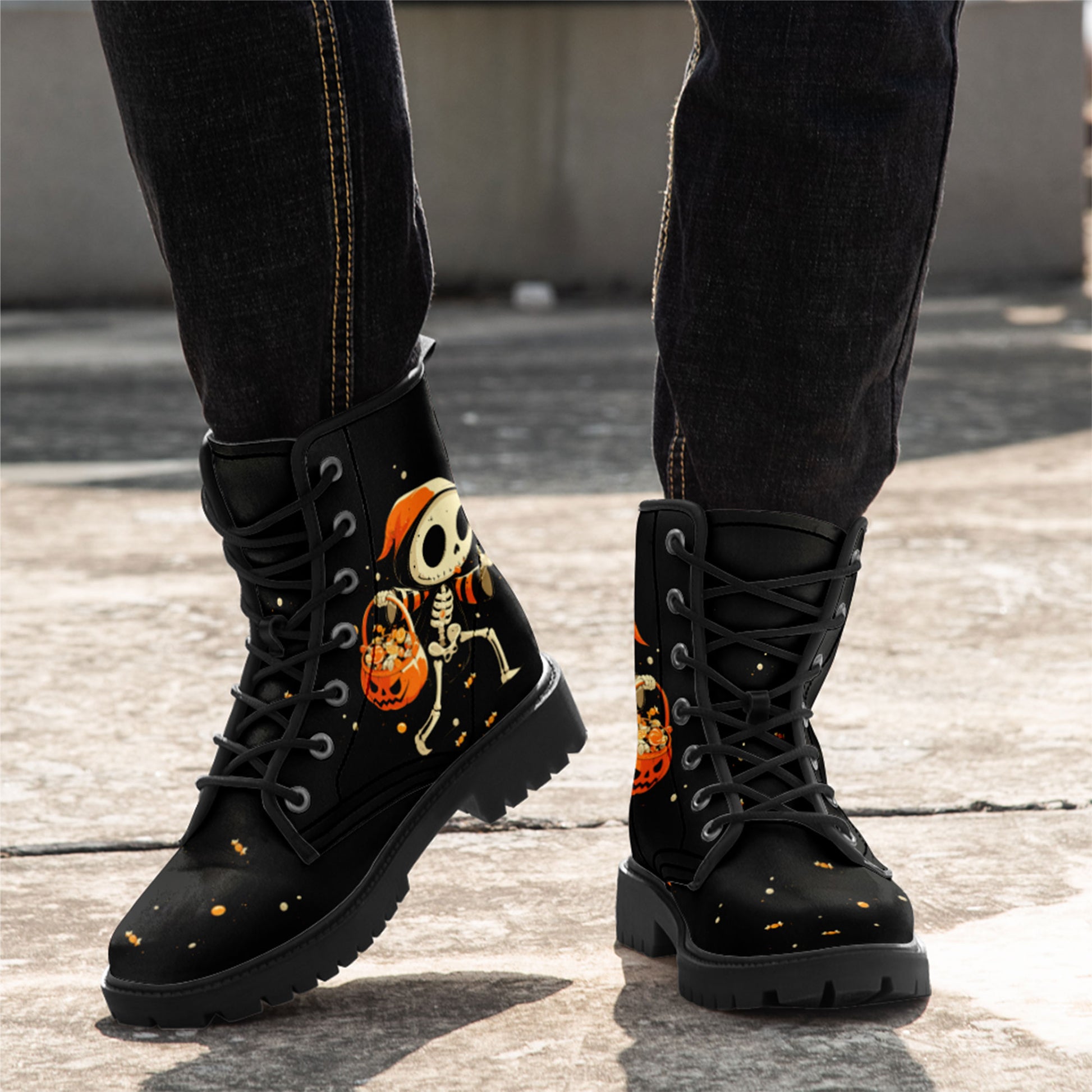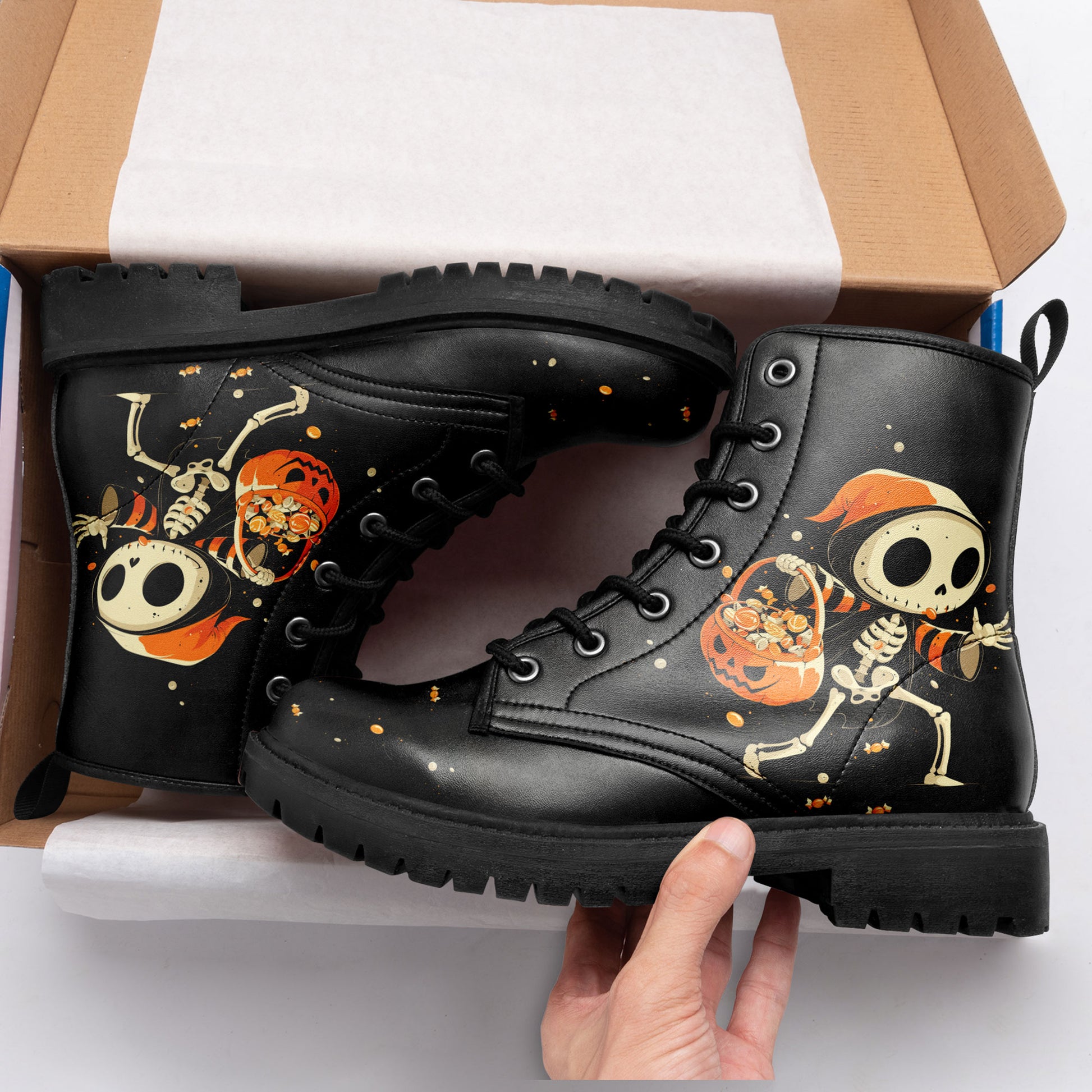 Relive the magic of the best night of the year. These adorable combat boots capture the pure joy of Halloween, featuring a **cute skeleton sprinting with a pumpkin bucket full of candy**.