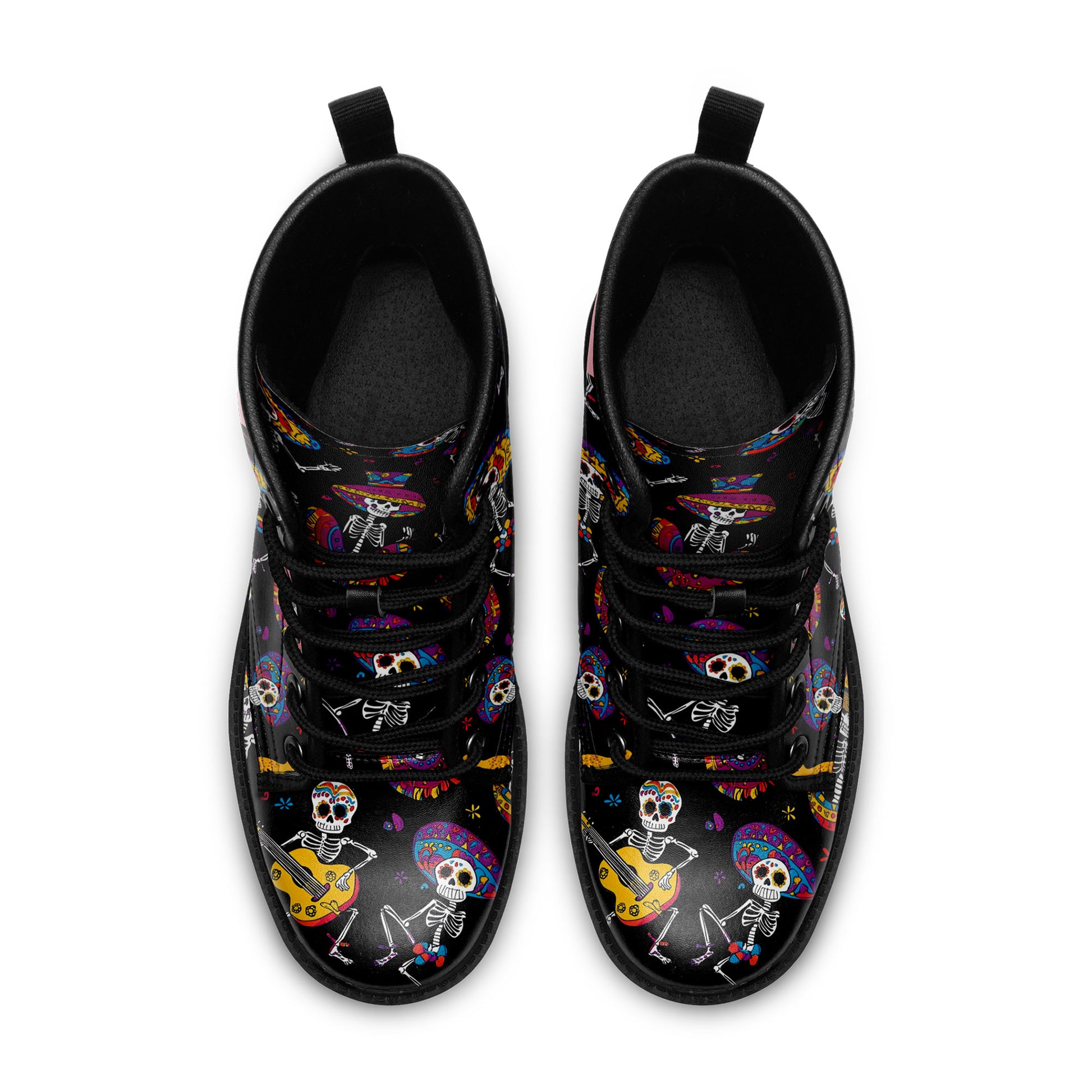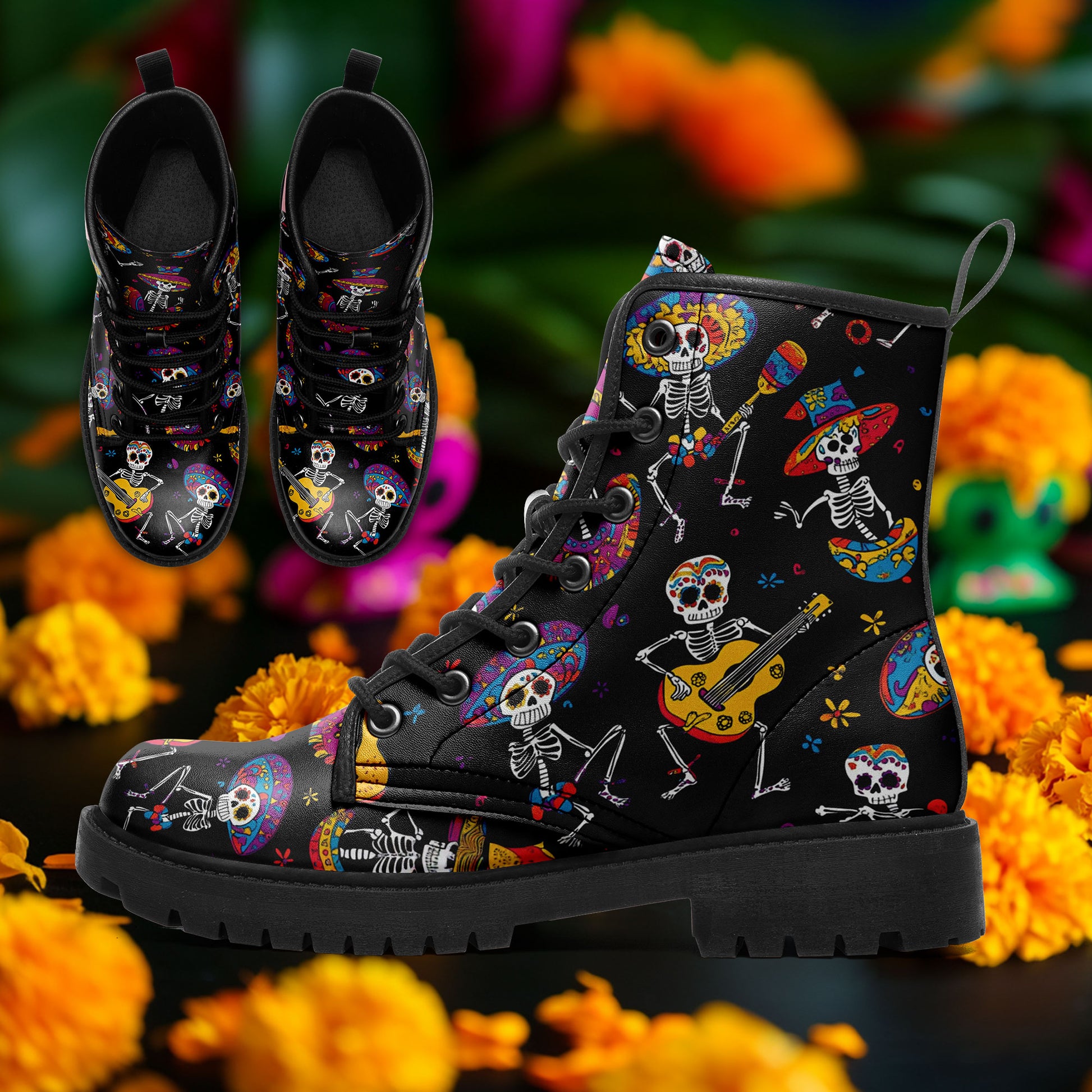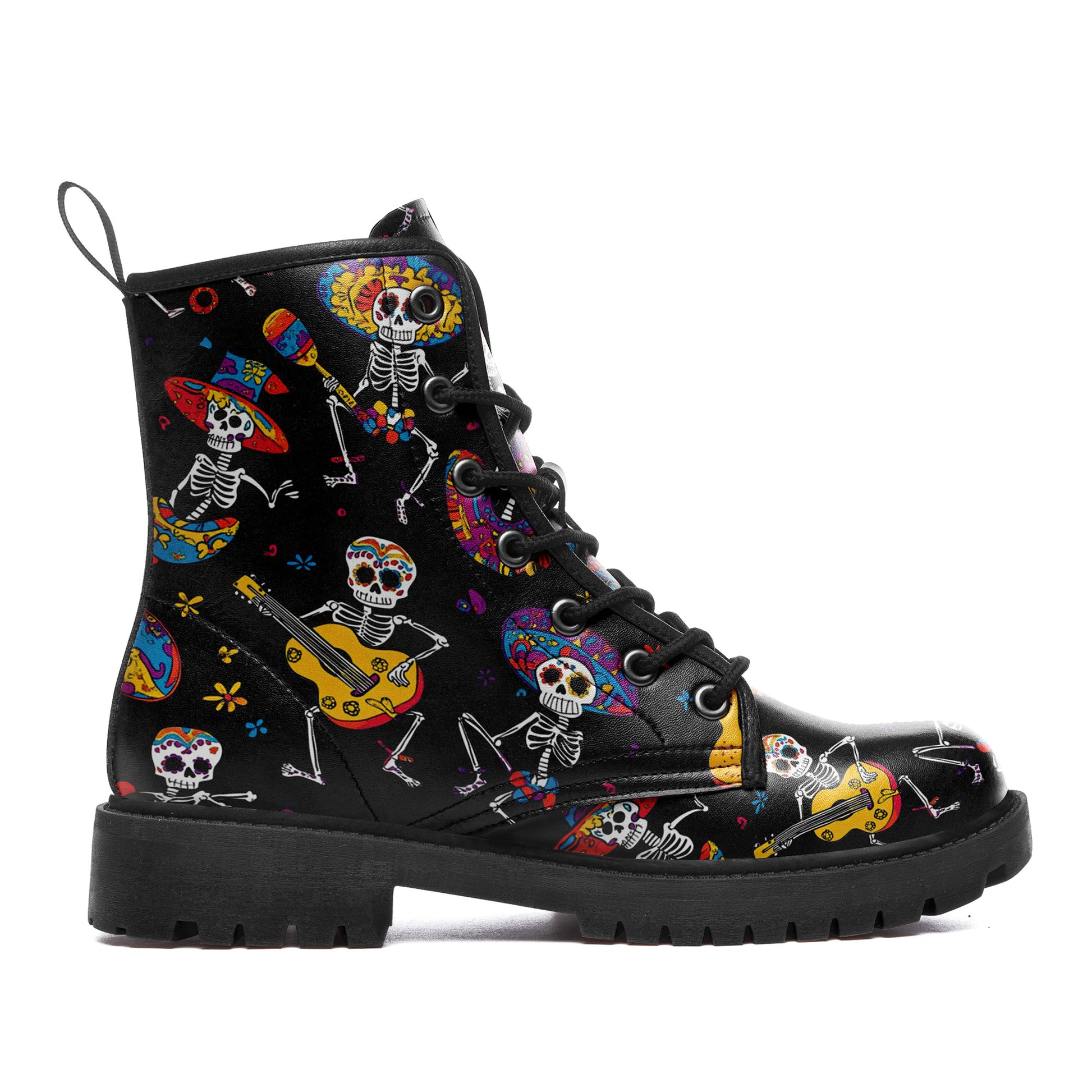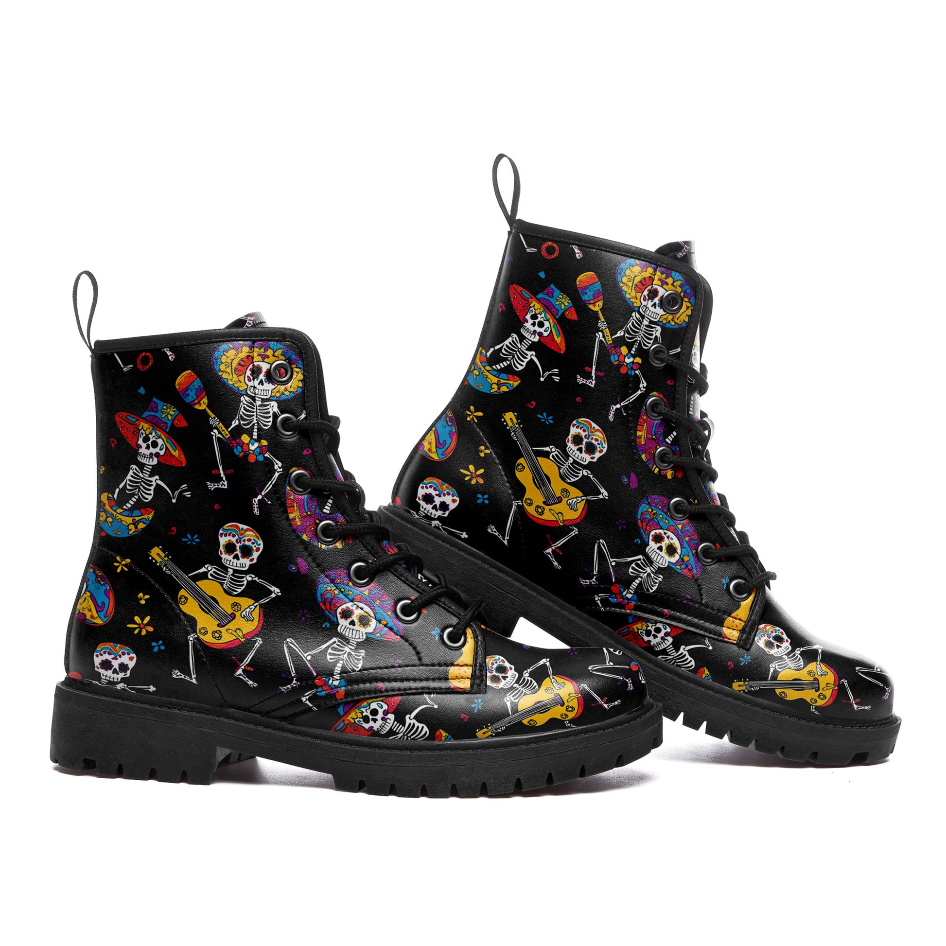 Let the music move you. These combat boots are a party waiting to happen, featuring a lively band of **skeletons playing guitars and shaking maracas**.