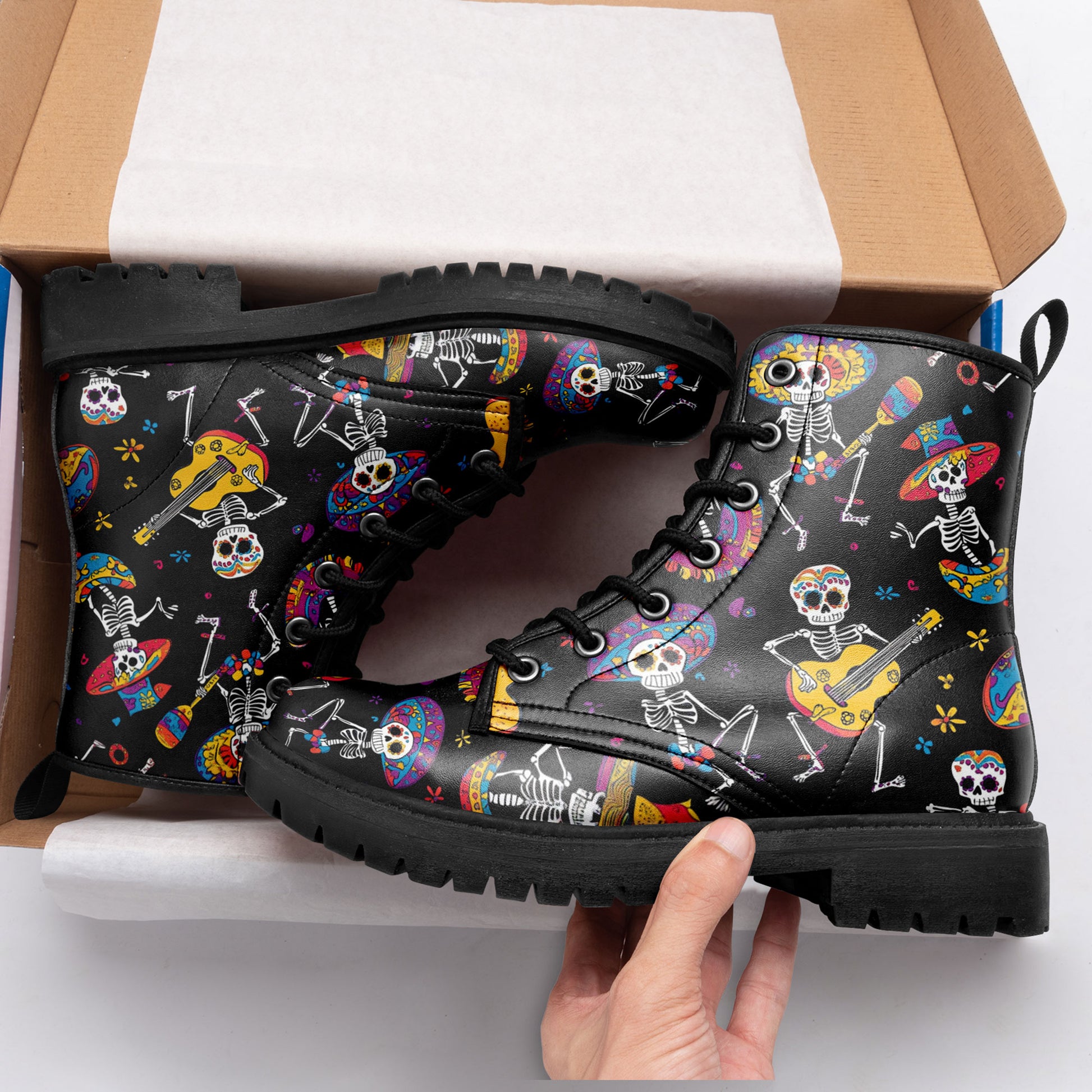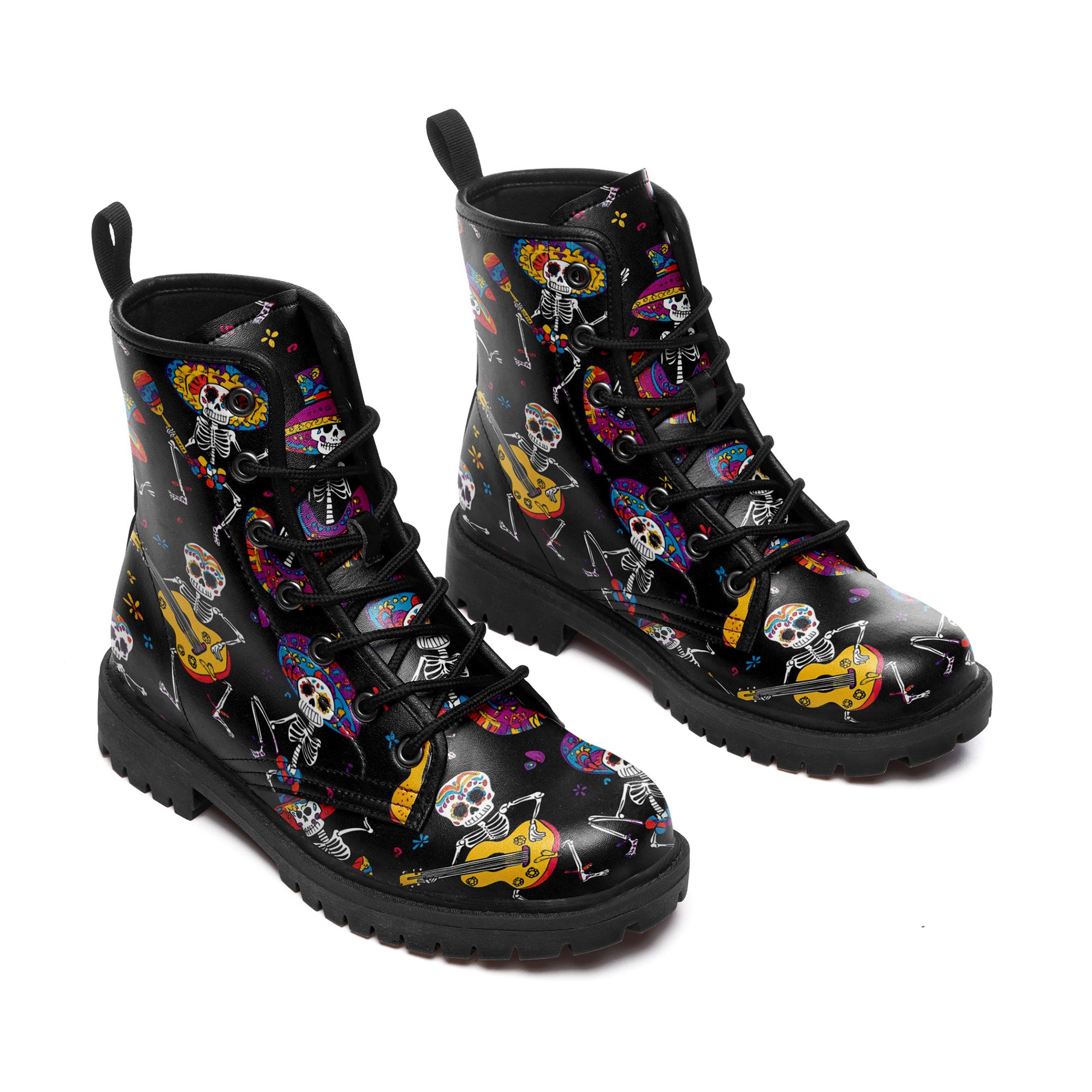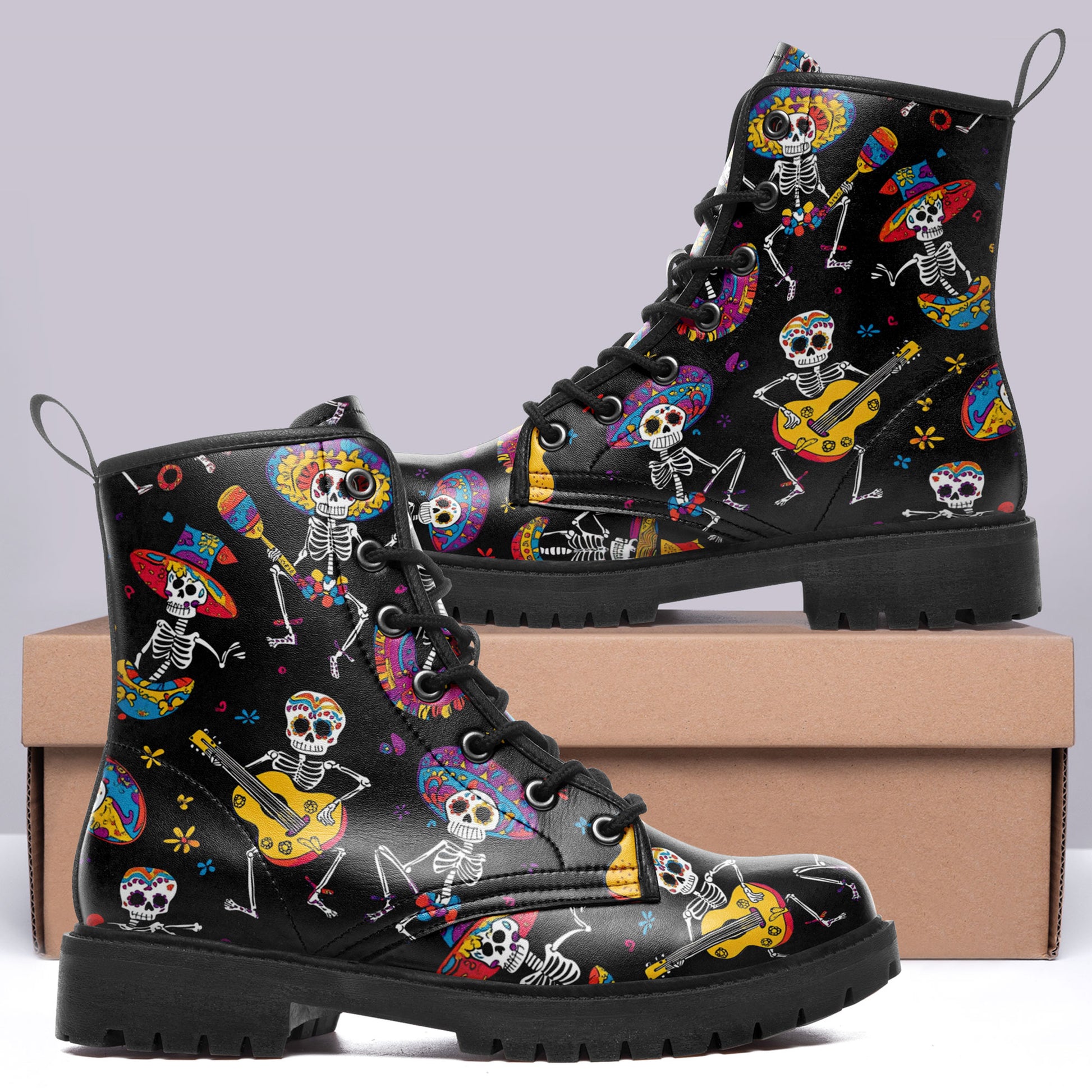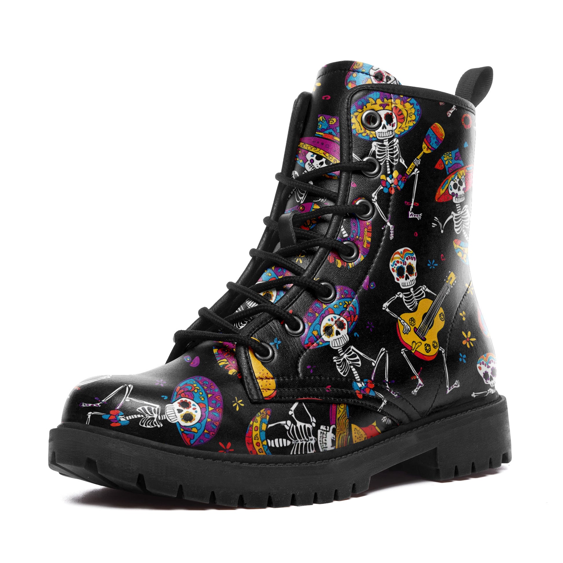 Let the music move you. These combat boots are a party waiting to happen, featuring a lively band of **skeletons playing guitars and shaking maracas**.