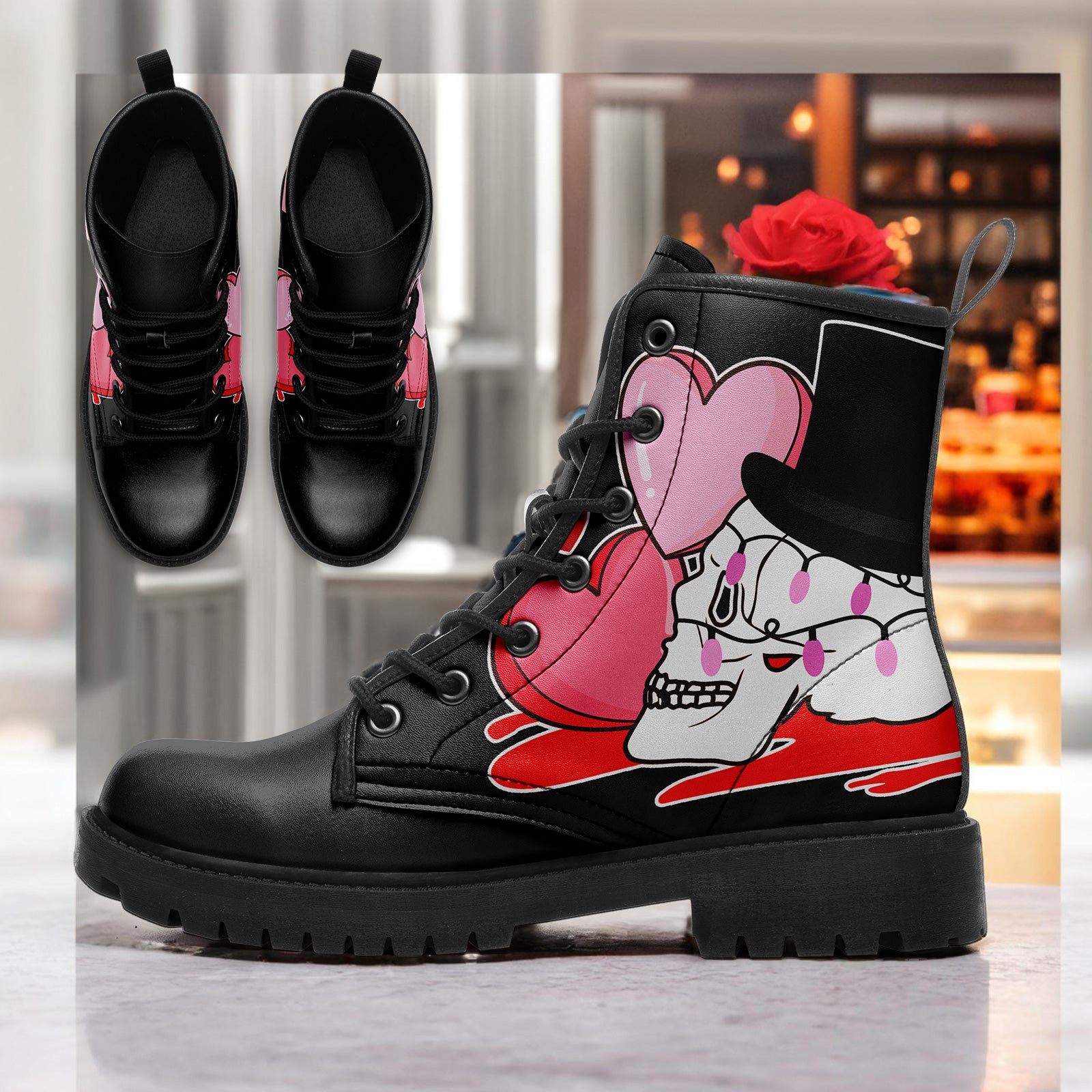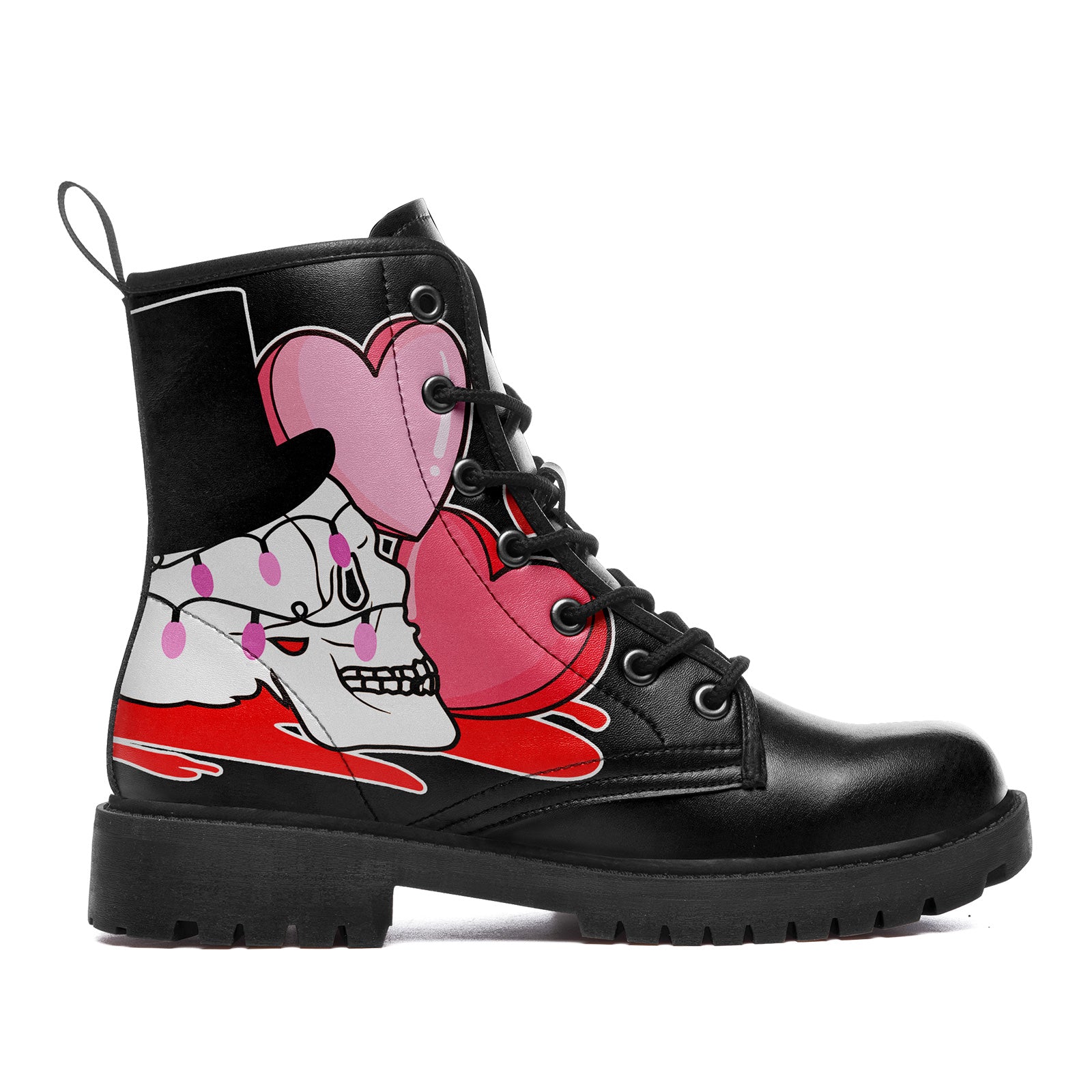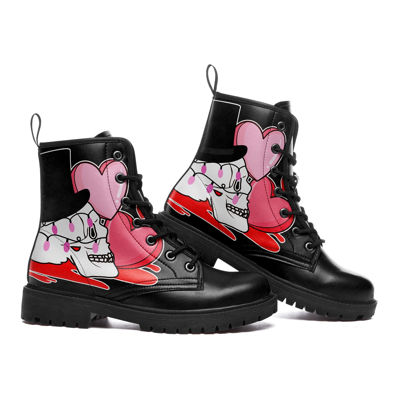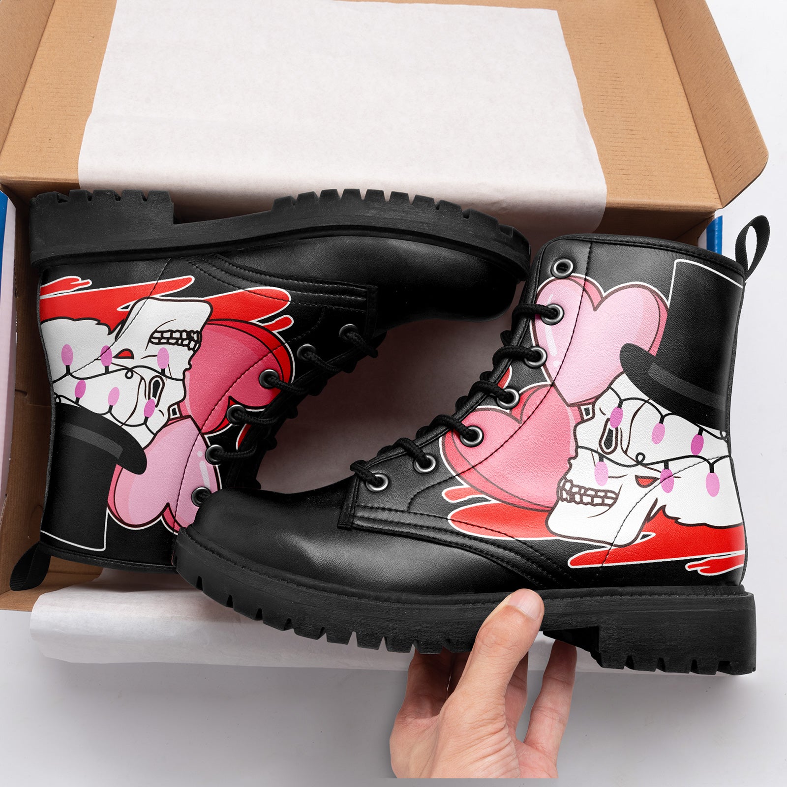 Who says romance is dead? Well, this guy might be, but heβs still dressed to impress. These adorable combat boots feature a **dapper skeleton** wearing his finest **top hat**, surrounded by floating **pink and red hearts**.