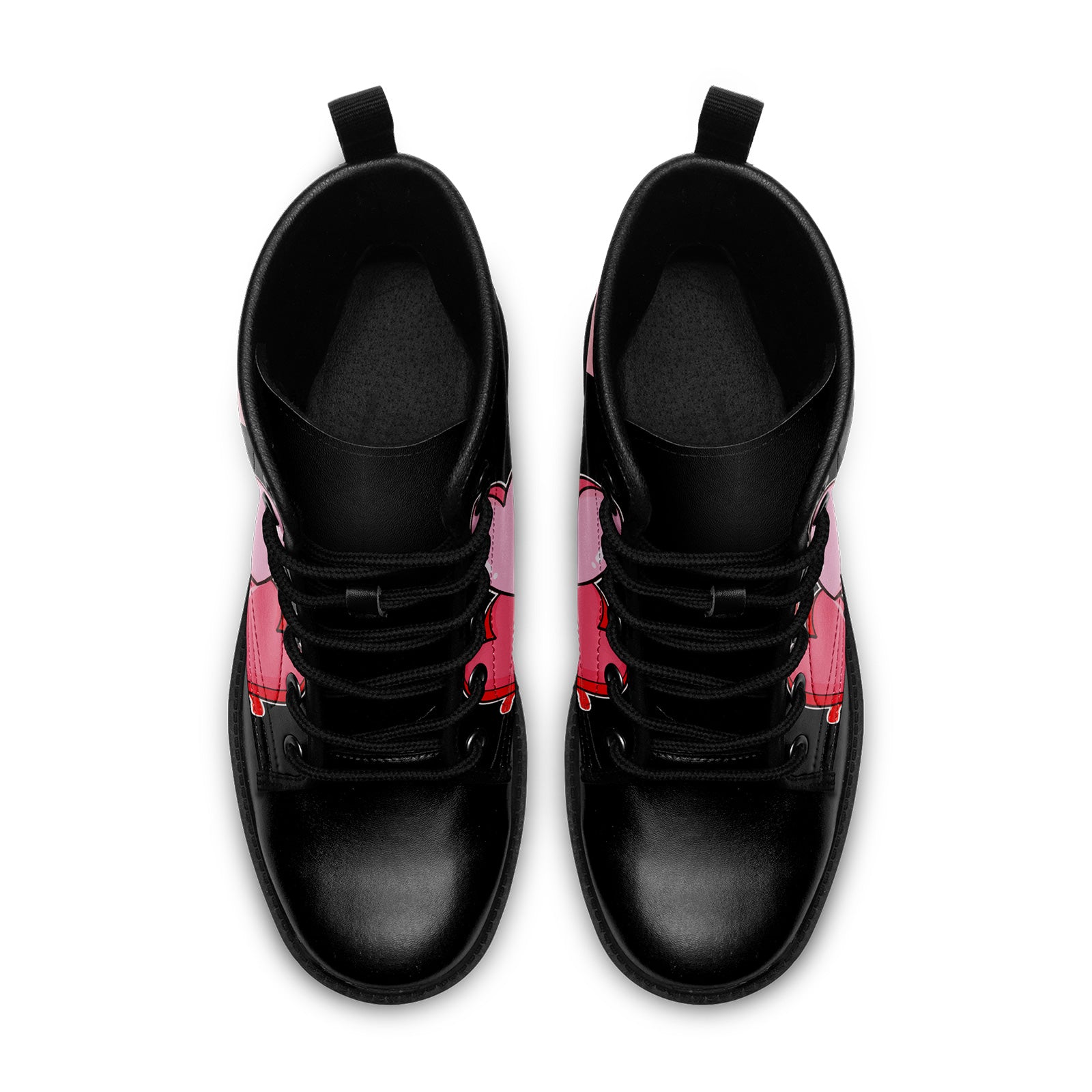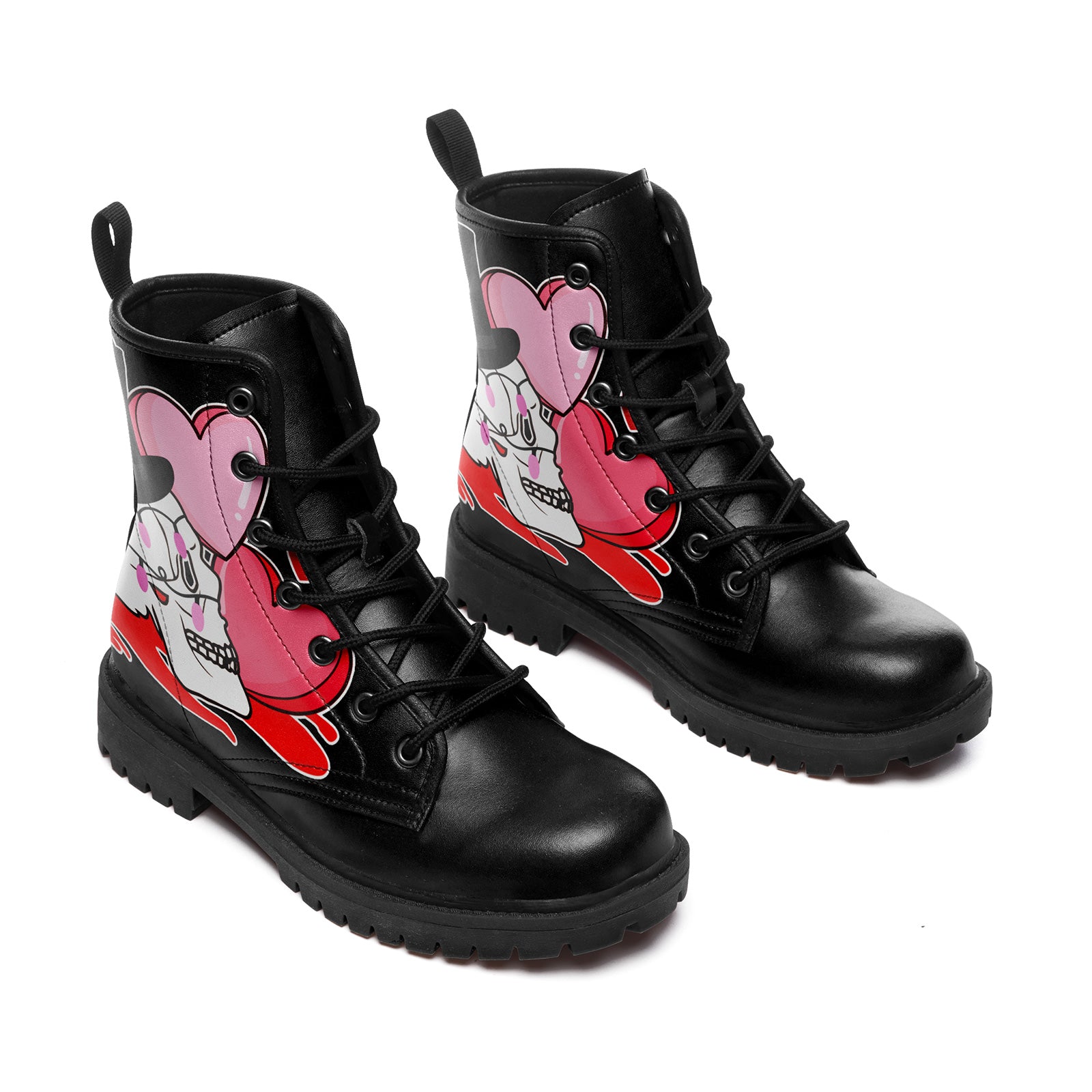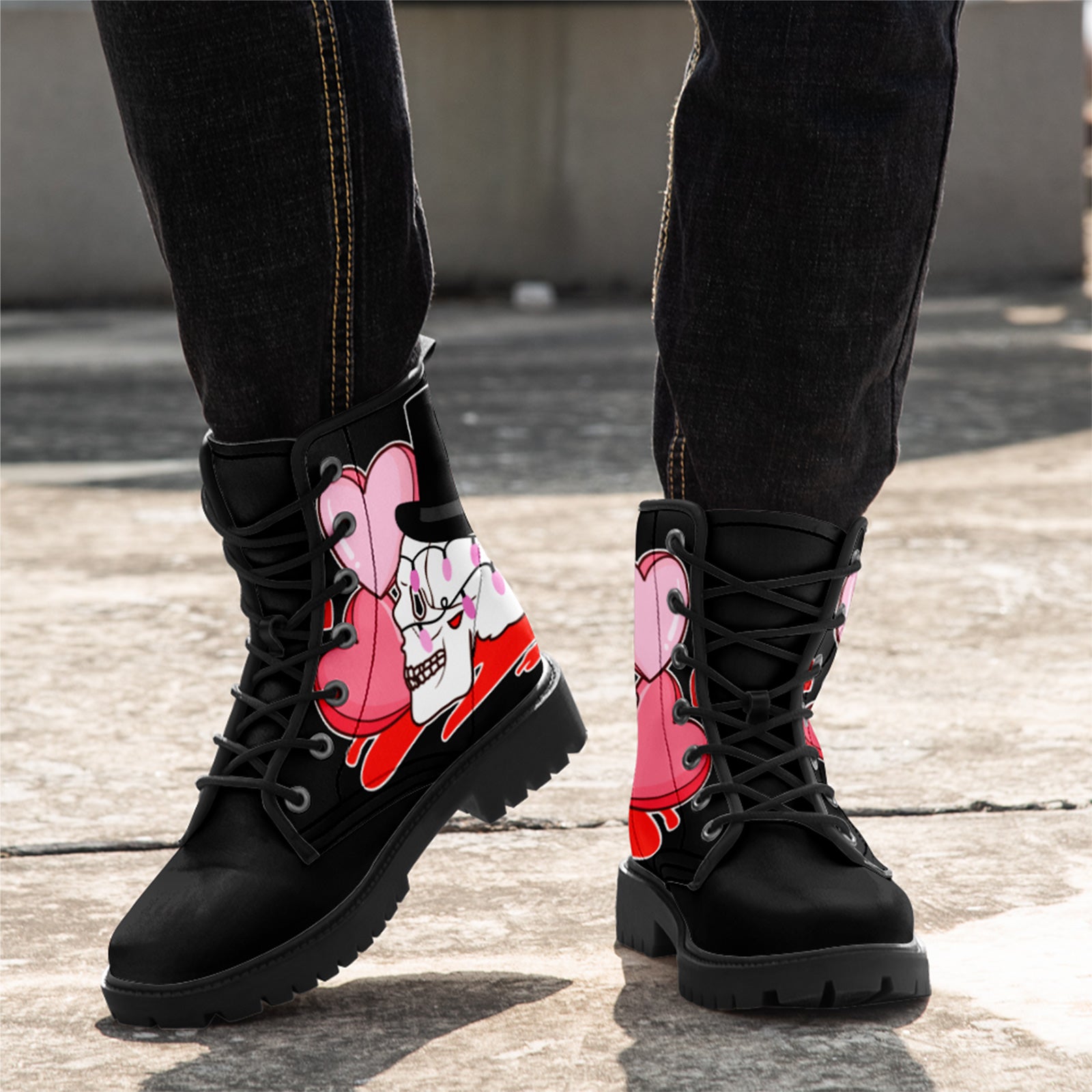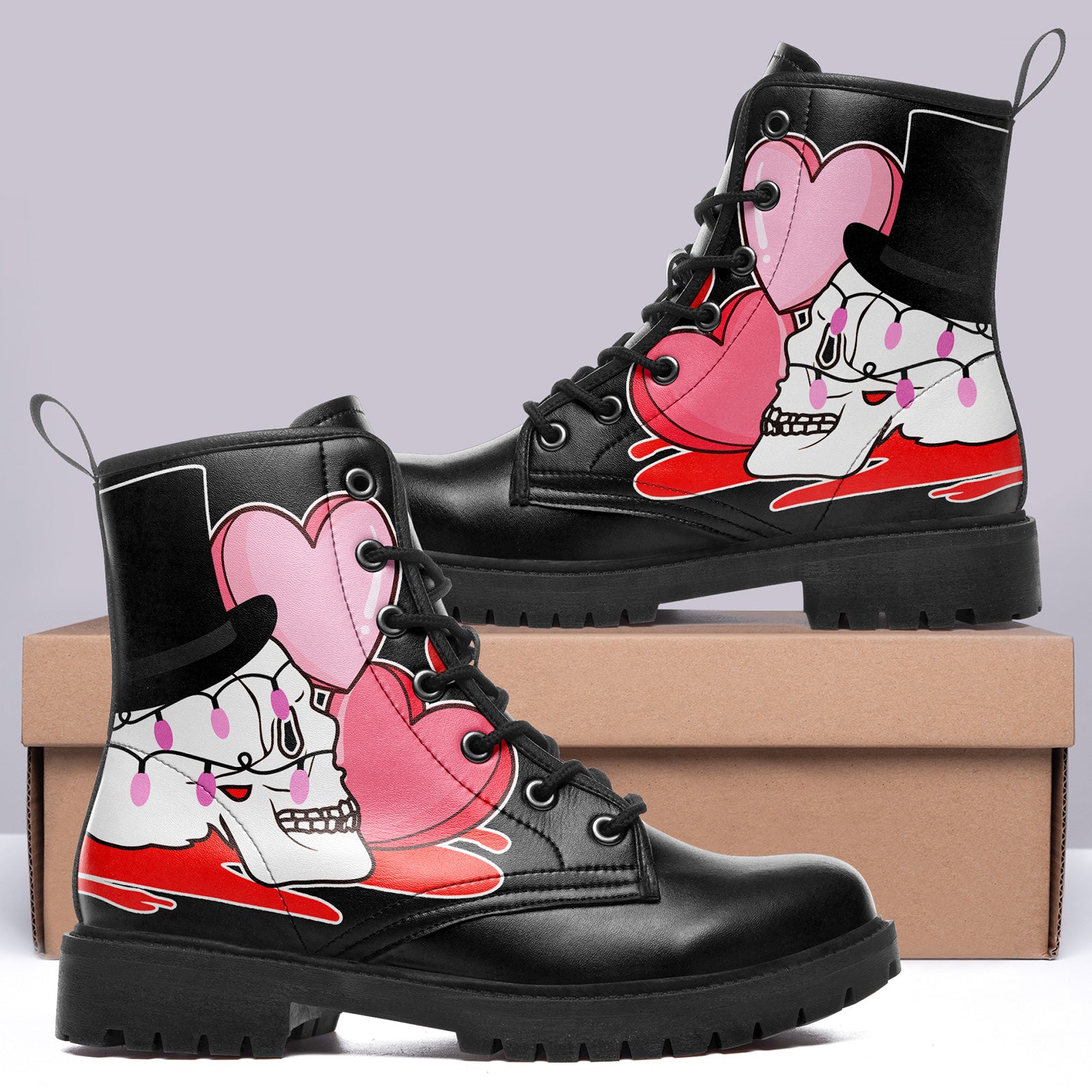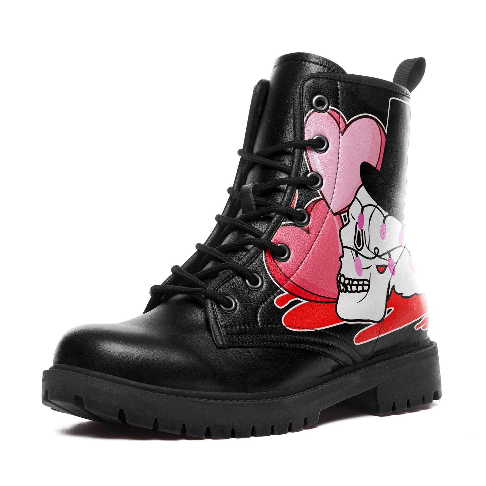 Who says romance is dead? Well, this guy might be, but heβs still dressed to impress. These adorable combat boots feature a **dapper skeleton** wearing his finest **top hat**, surrounded by floating **pink and red hearts**.
