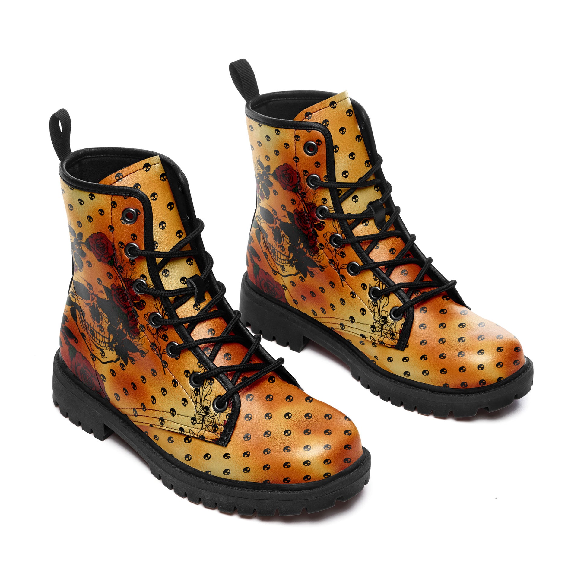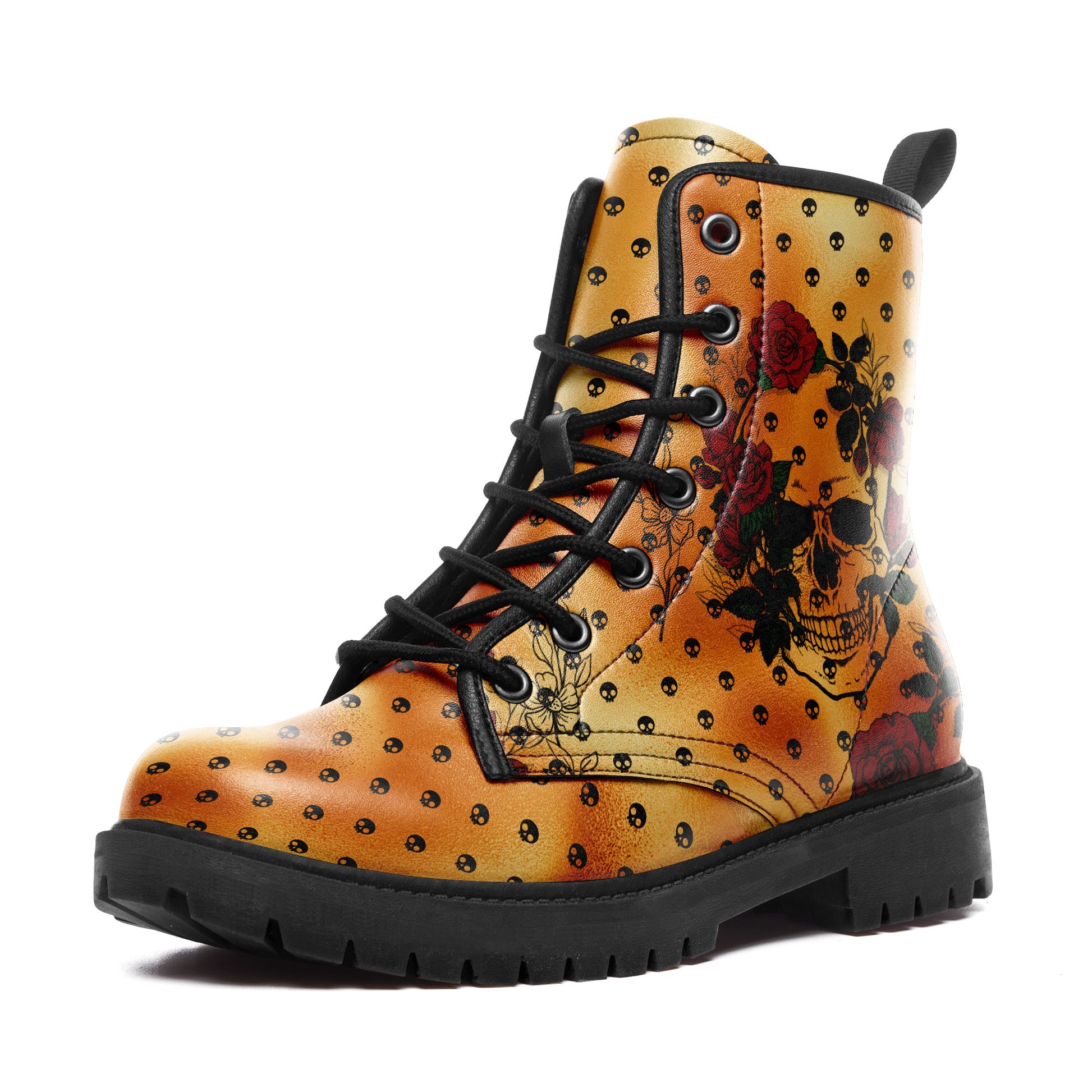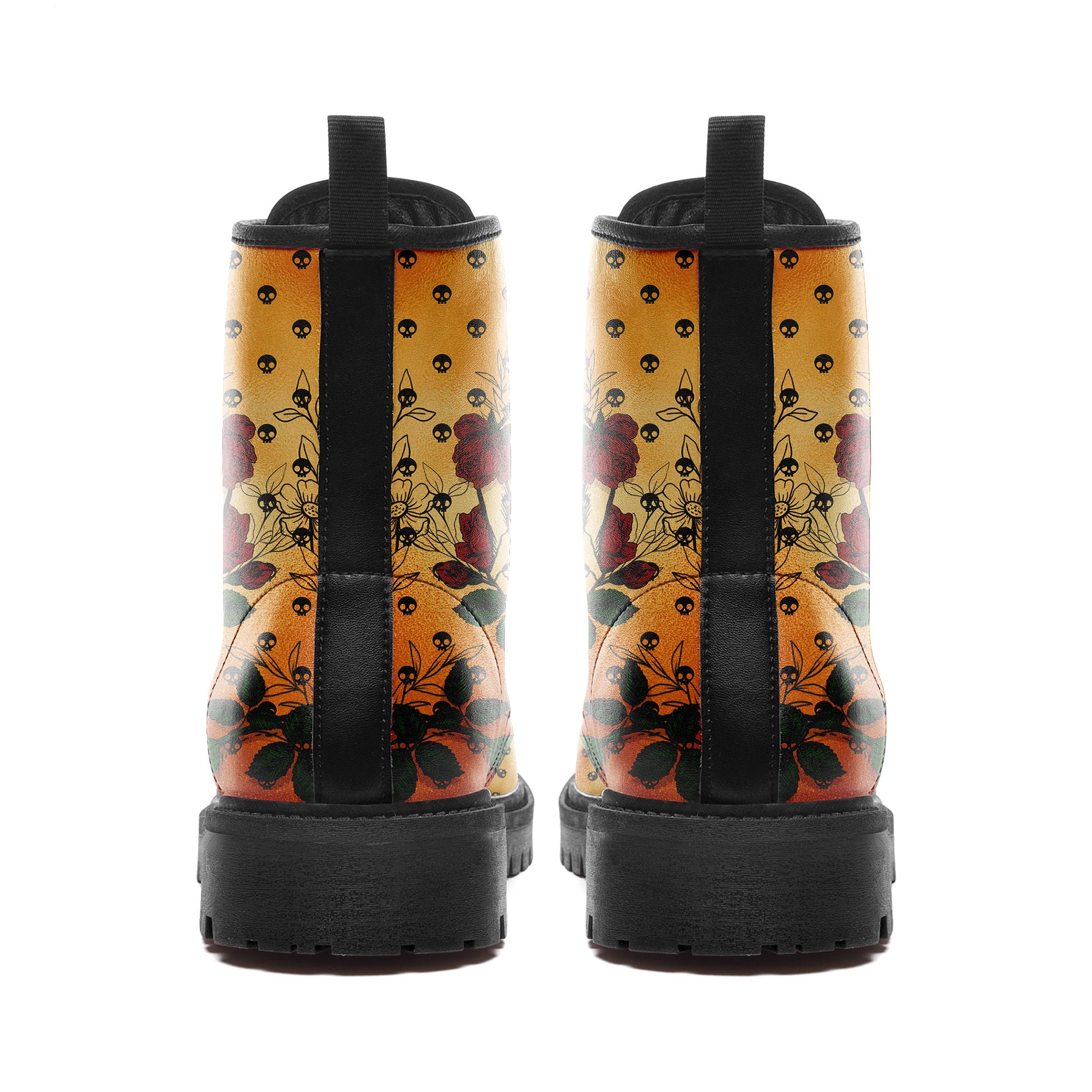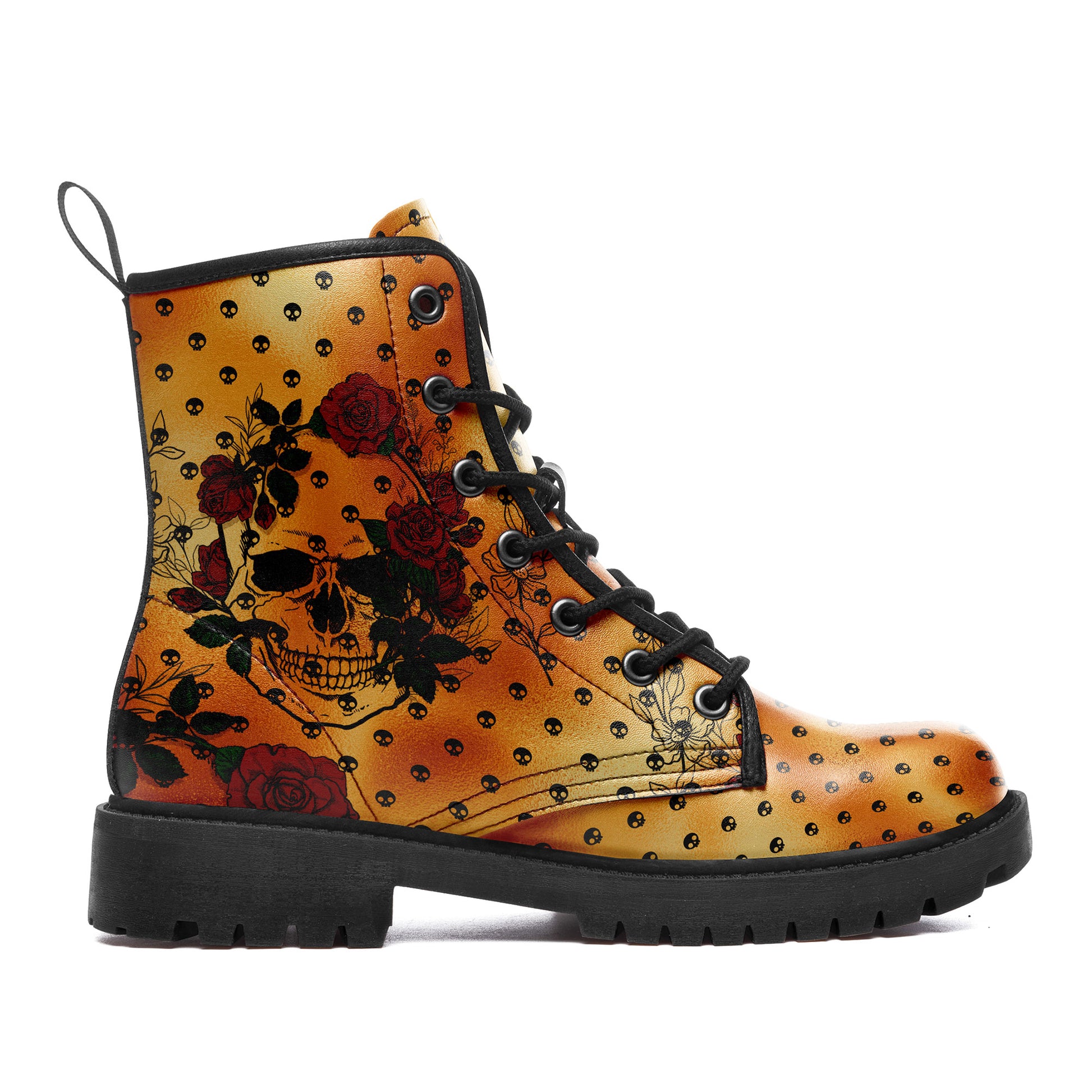 Floral Skull & Red Roses Combat Boots - Orange Gothic Tattoo Art Shoes BOOTS-24025002-4