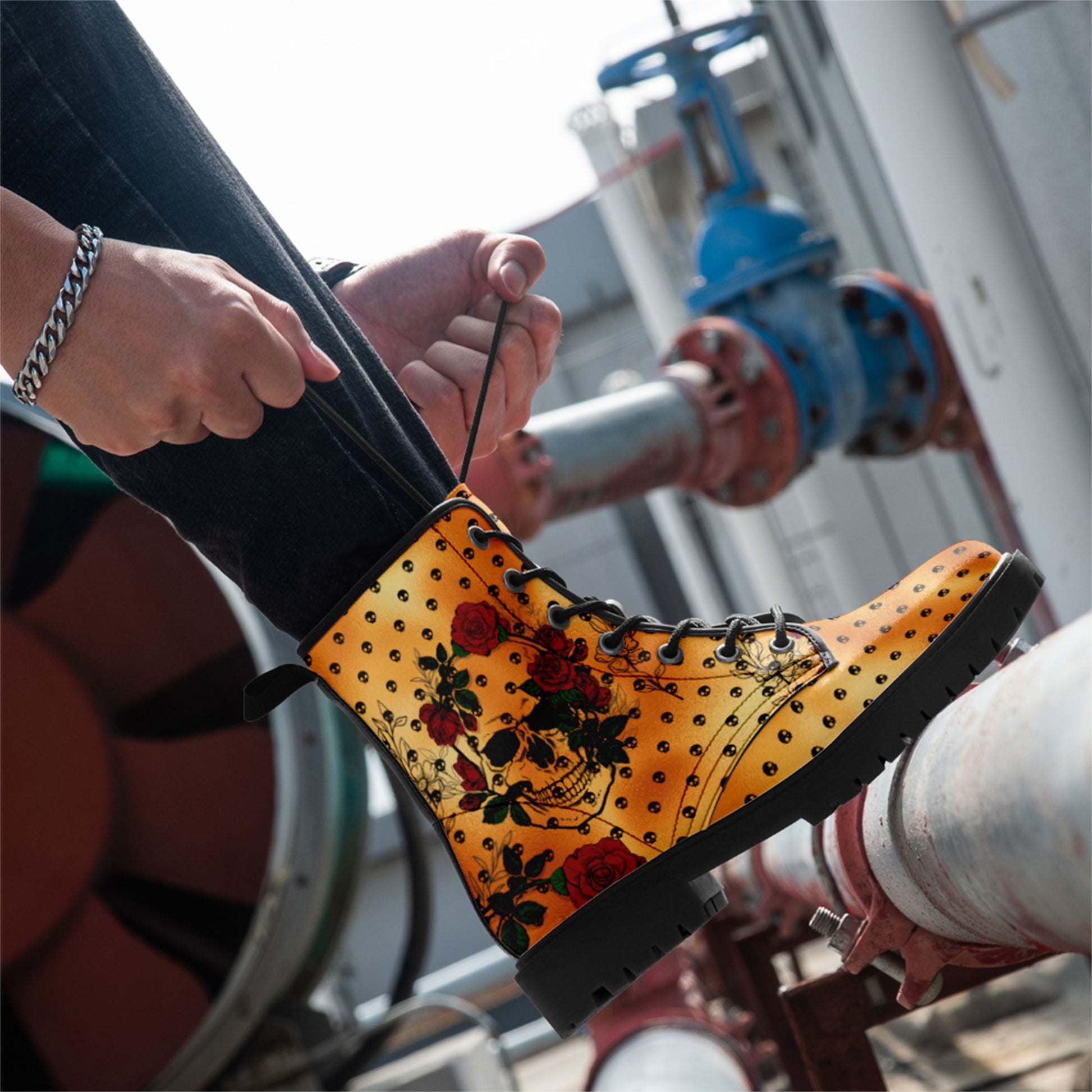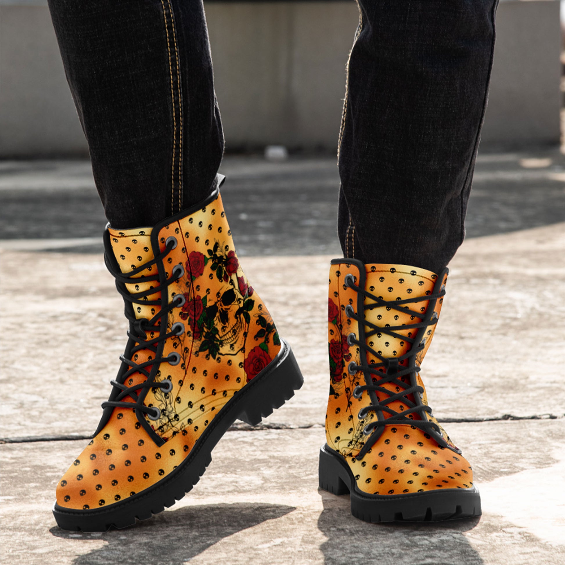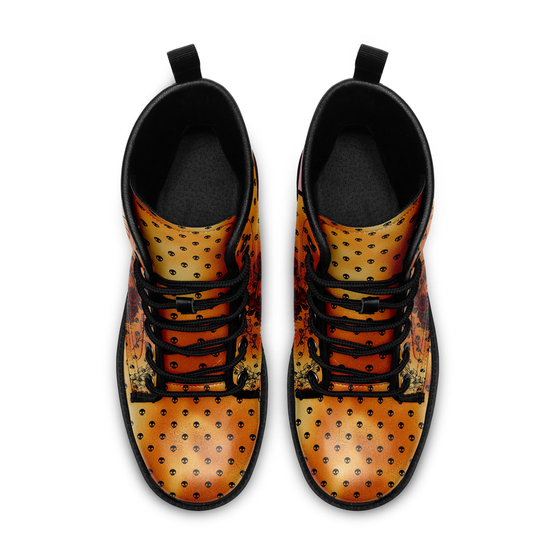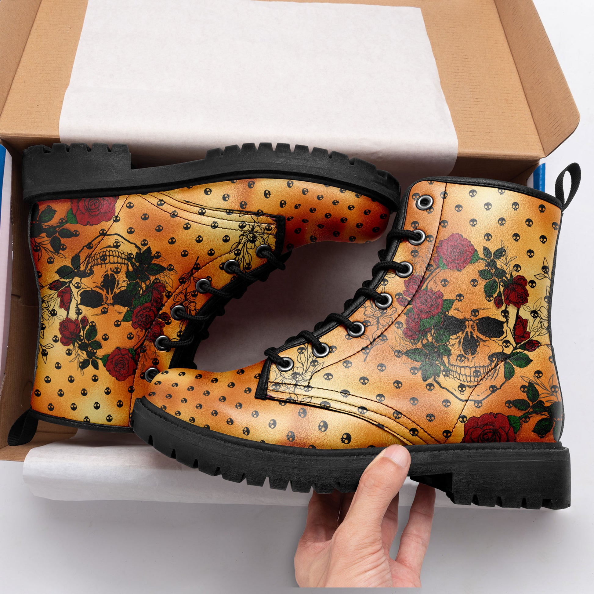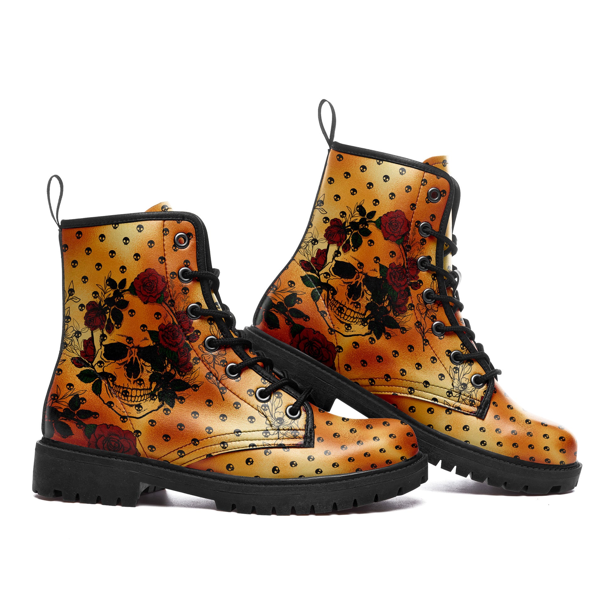 Floral Skull & Red Roses Combat Boots - Orange Gothic Tattoo Art Shoes BOOTS-24025002-4