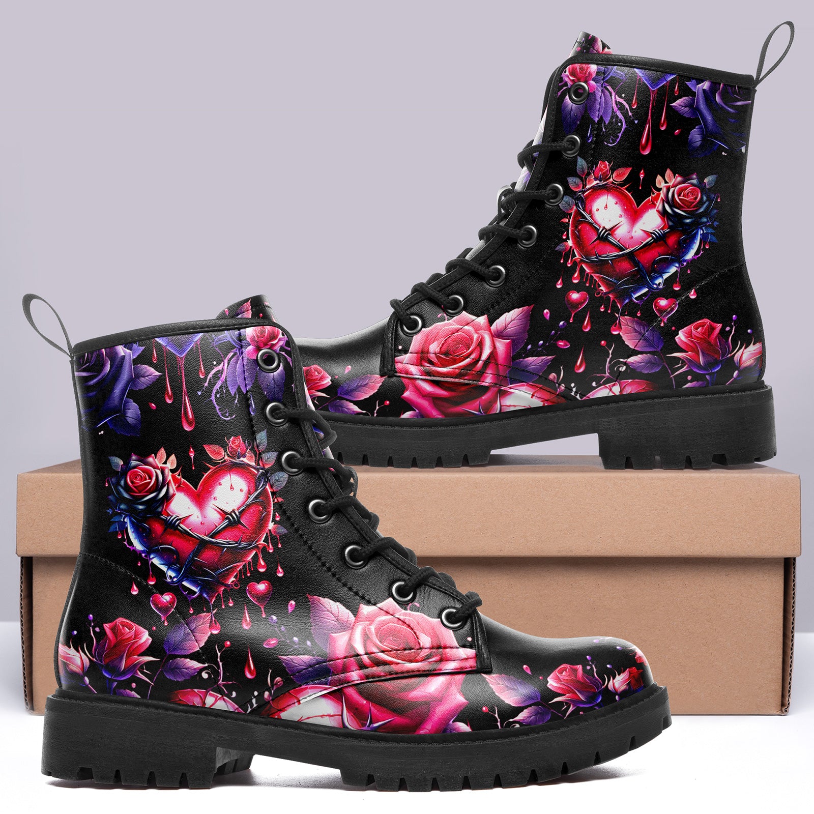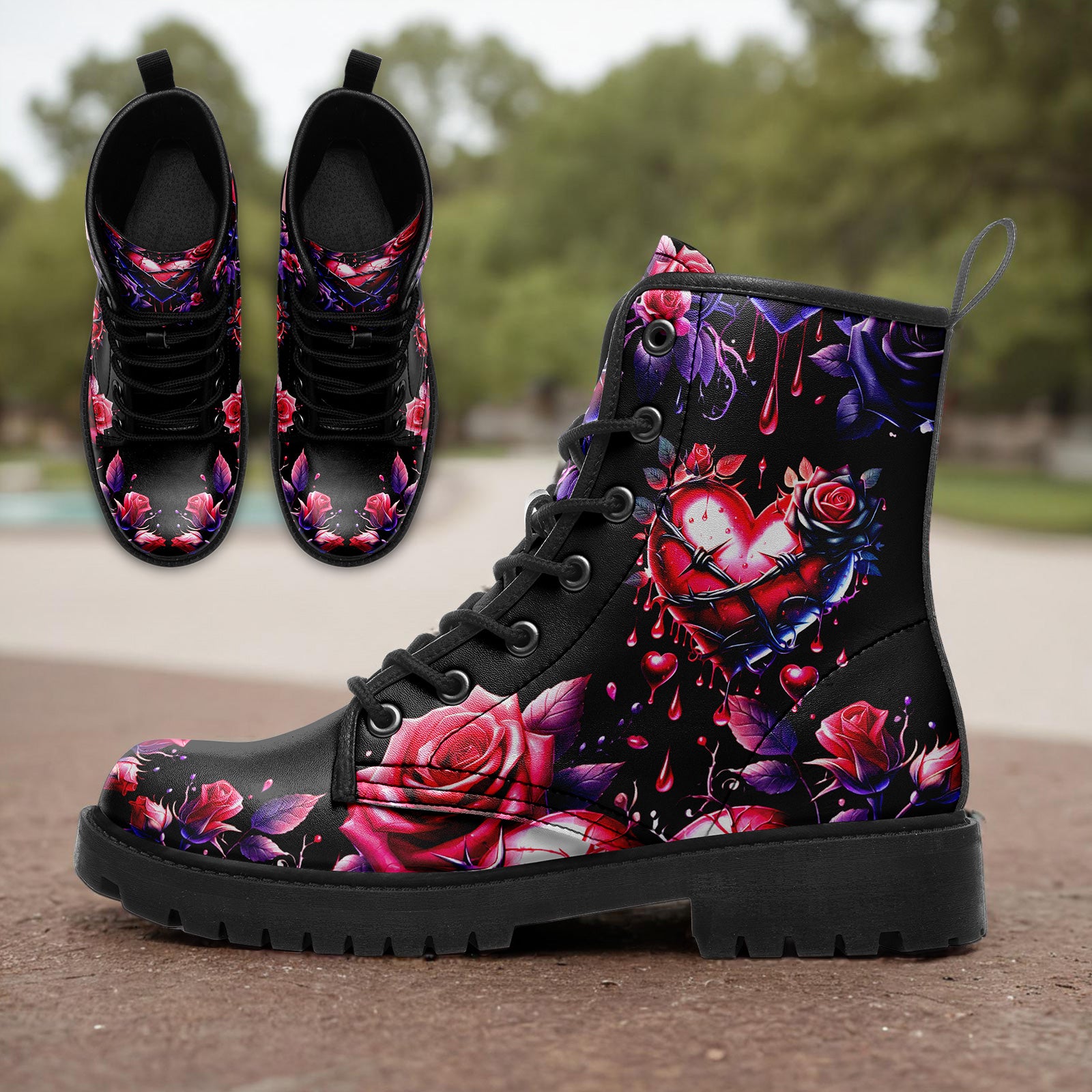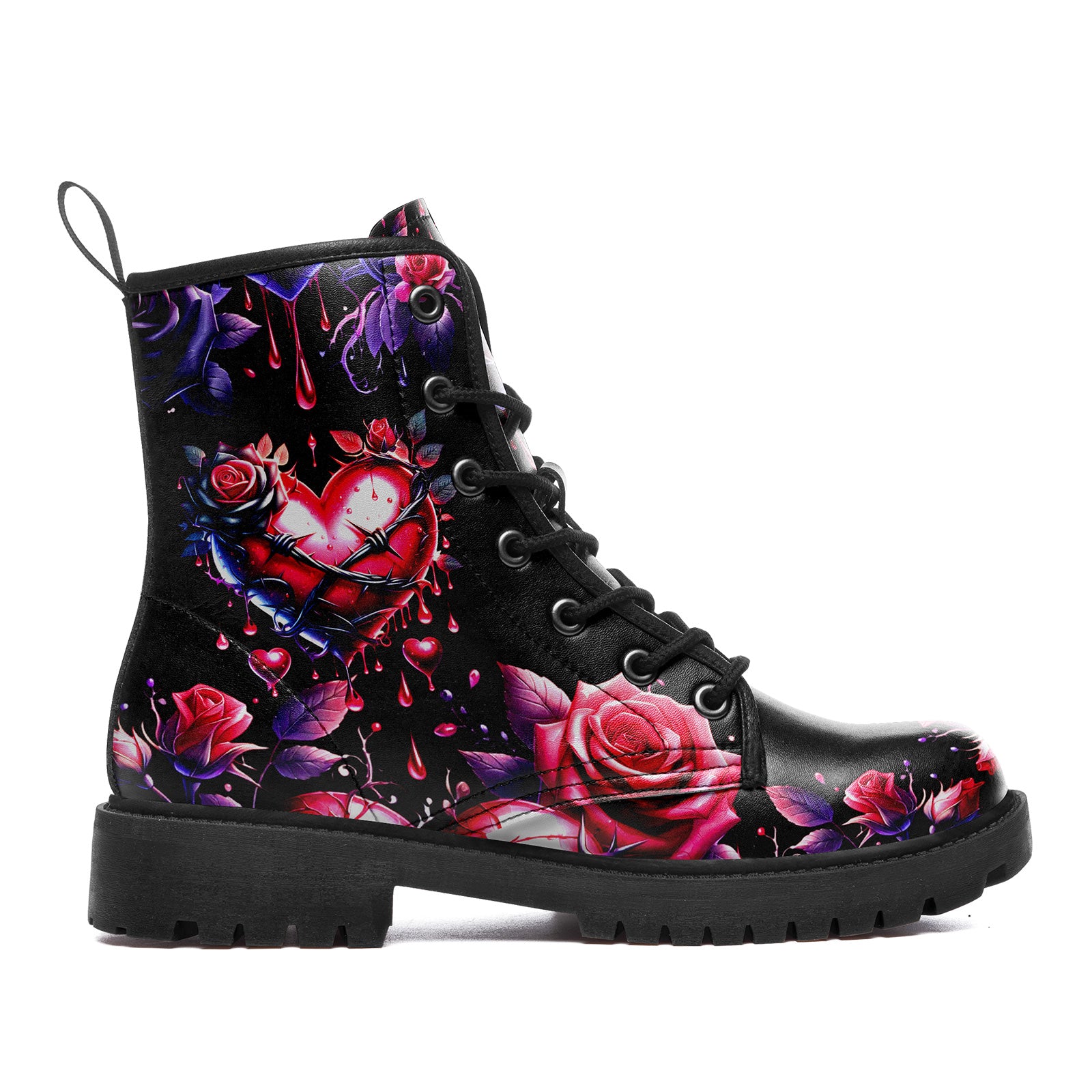 Love is a battlefield, and you're dressed to win. These striking combat boots feature a bold **bleeding heart wrapped in barbed wire**, symbolizing a passion that is fierce, protected, and resilient.
