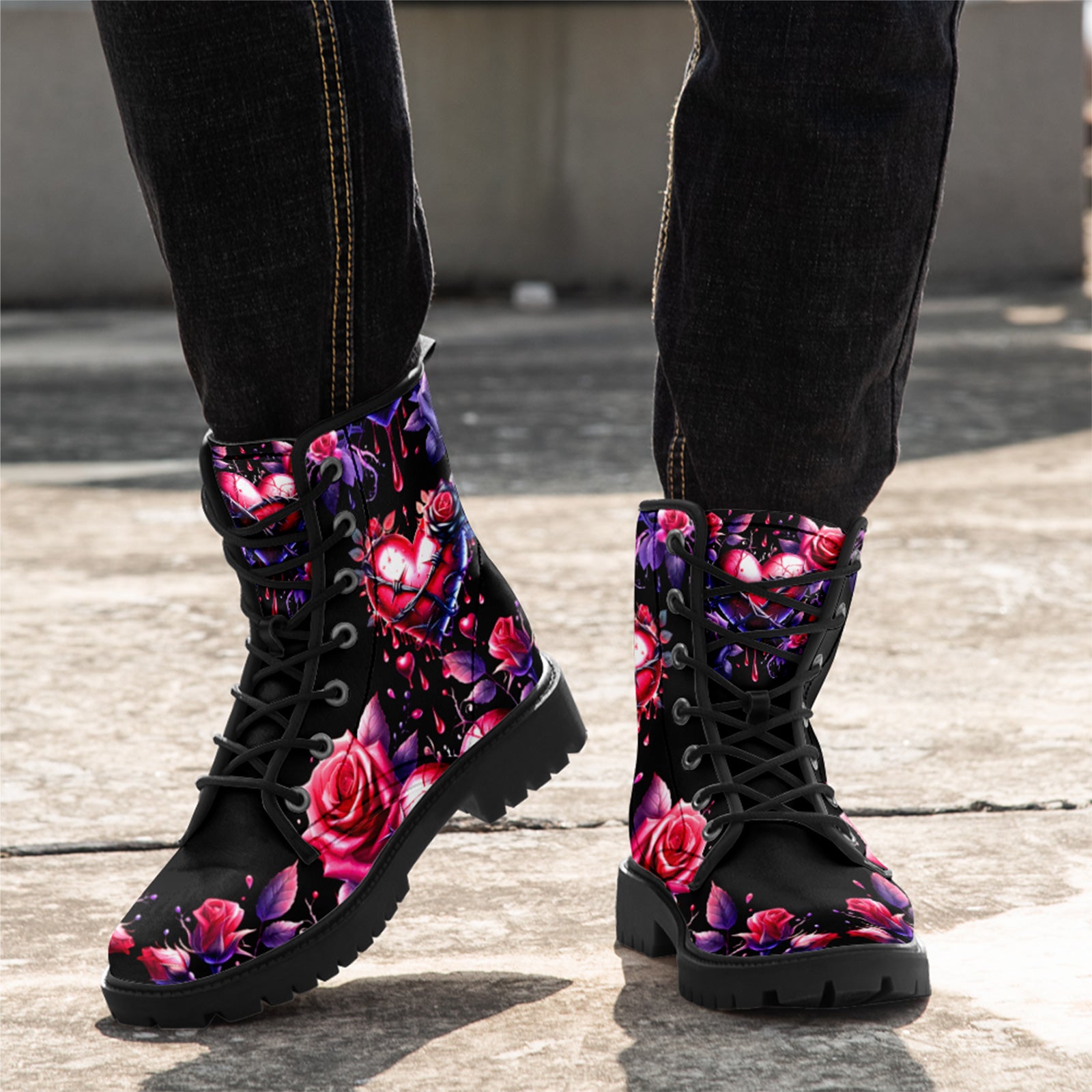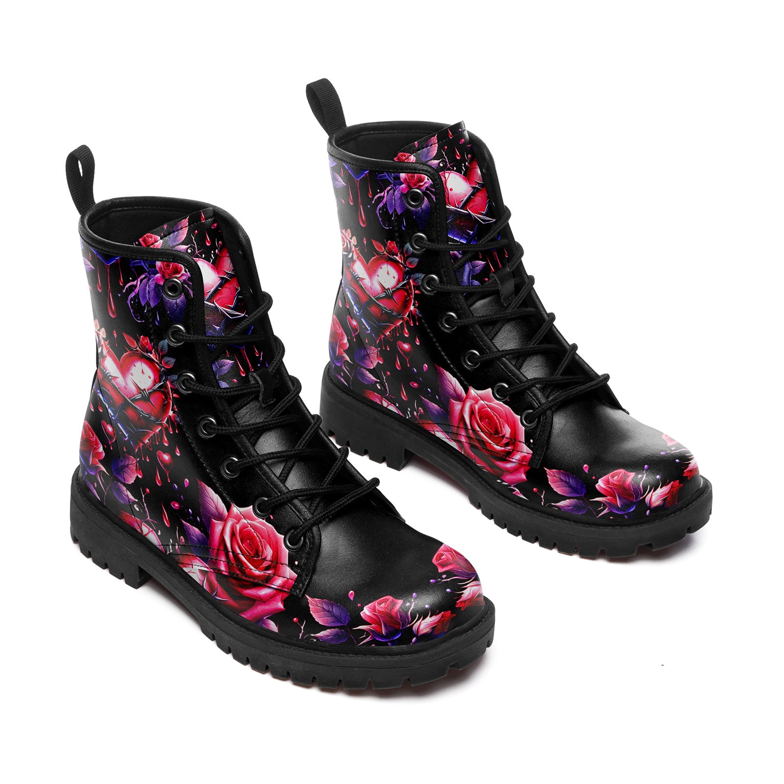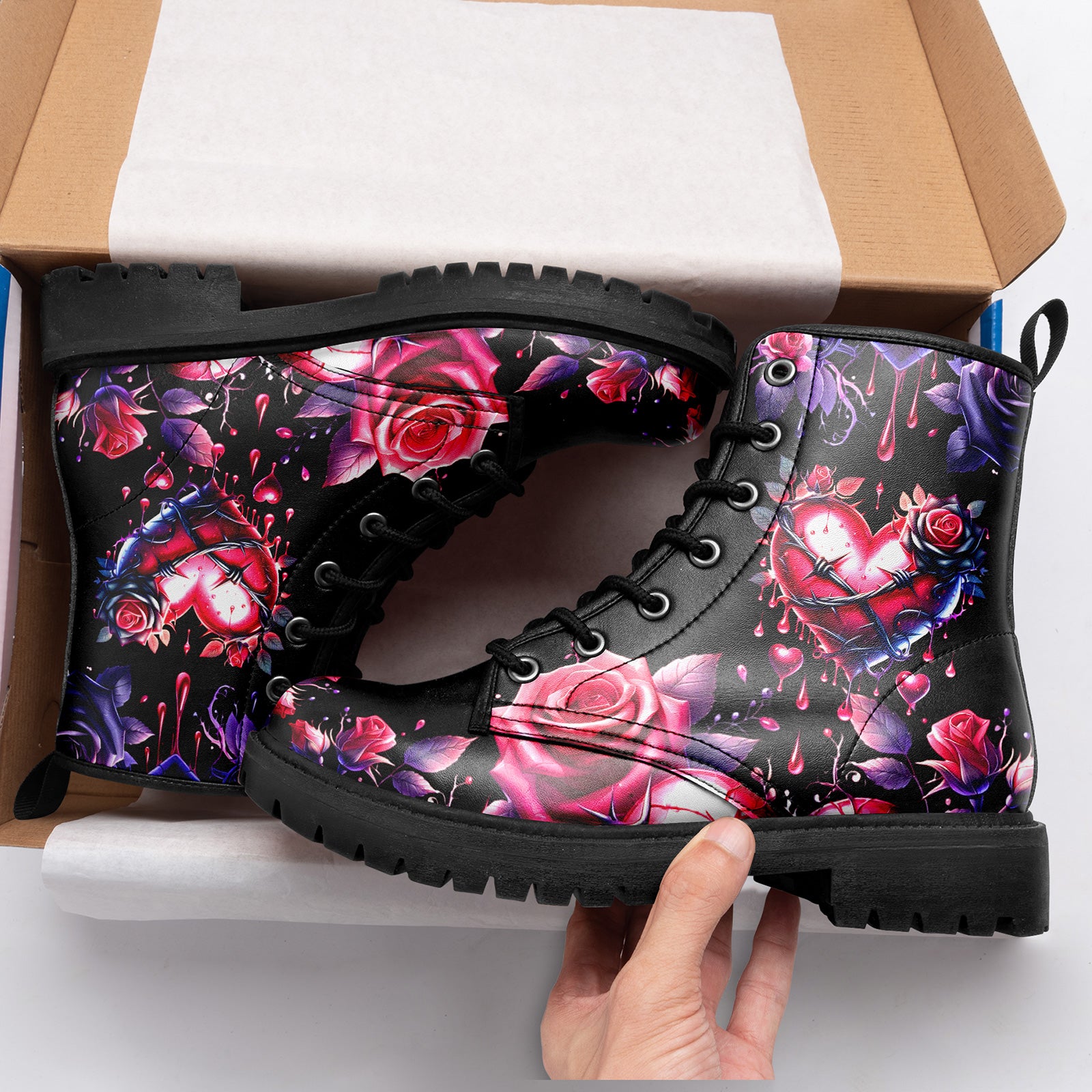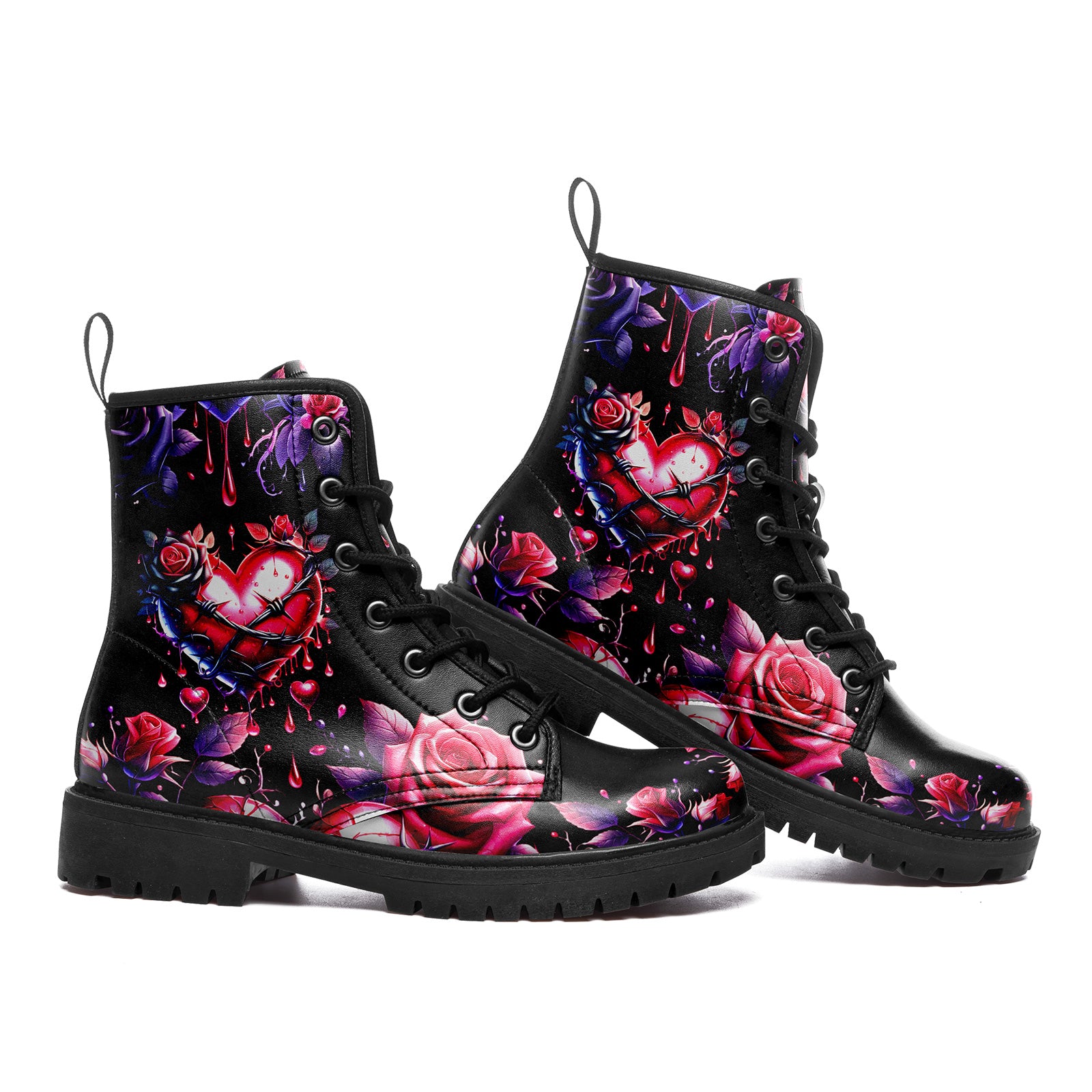 Love is a battlefield, and you're dressed to win. These striking combat boots feature a bold **bleeding heart wrapped in barbed wire**, symbolizing a passion that is fierce, protected, and resilient.