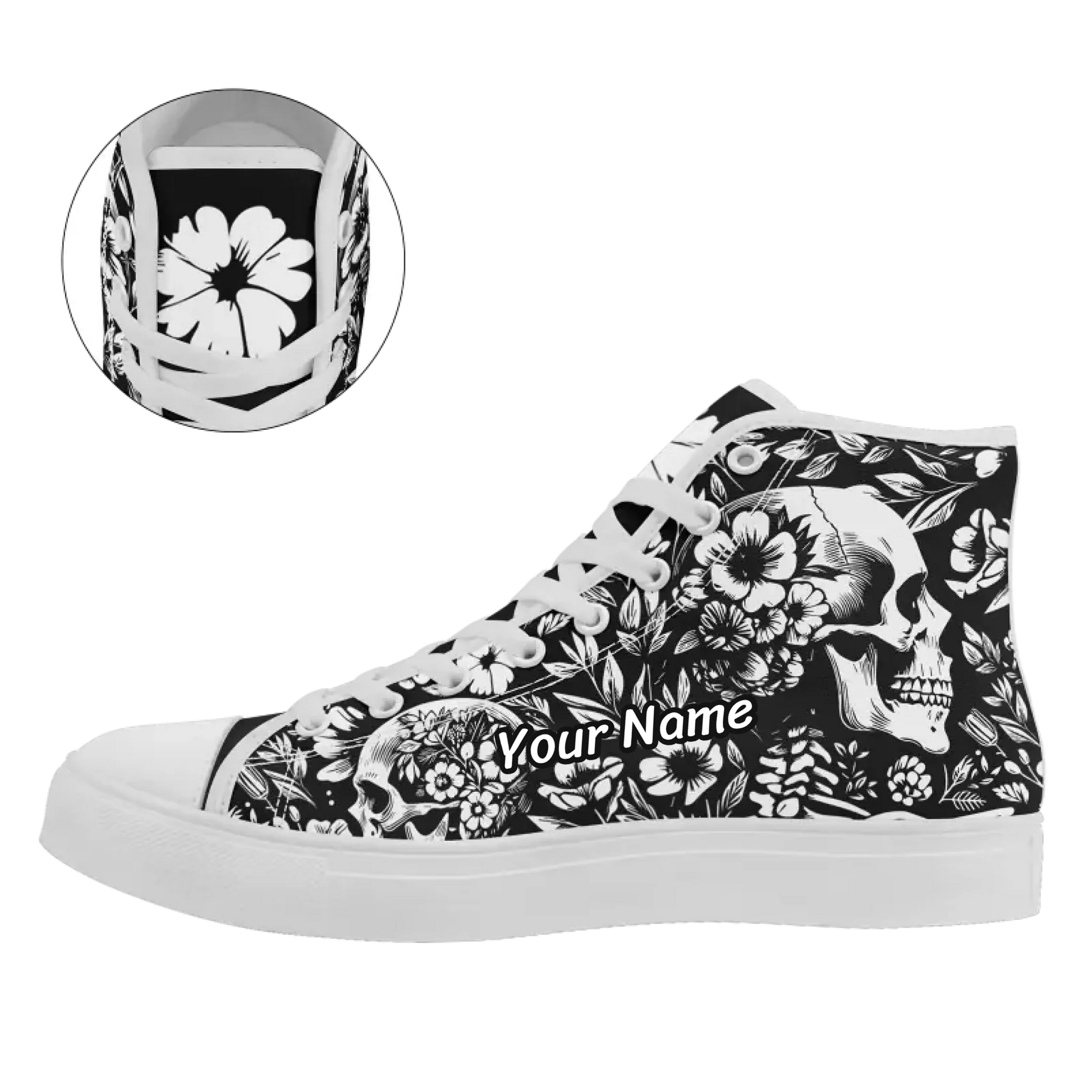 Gothic Floral Skull High-Top Sneakers, Monochrome Dark Botanical Art Canvas Shoes FN024-25023190