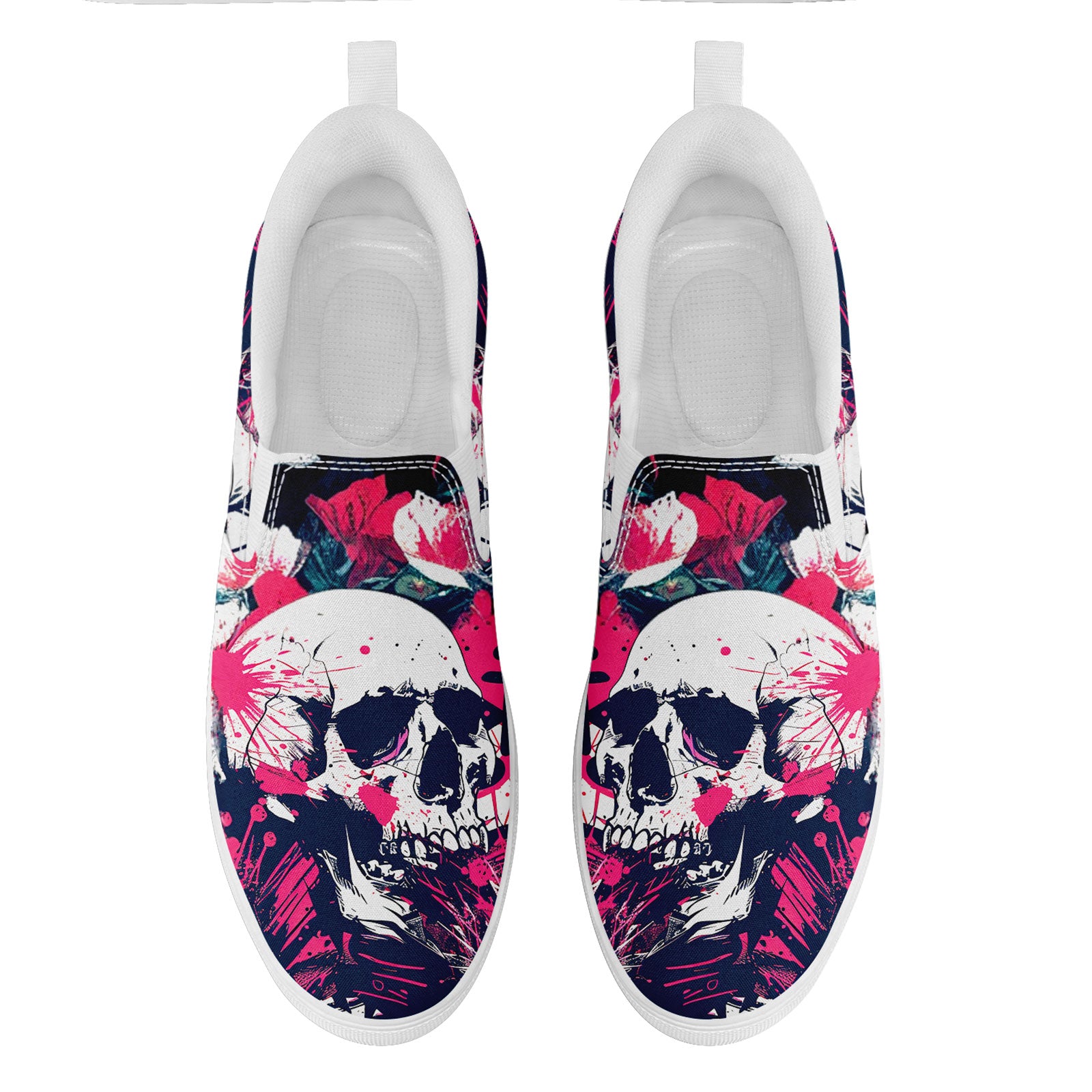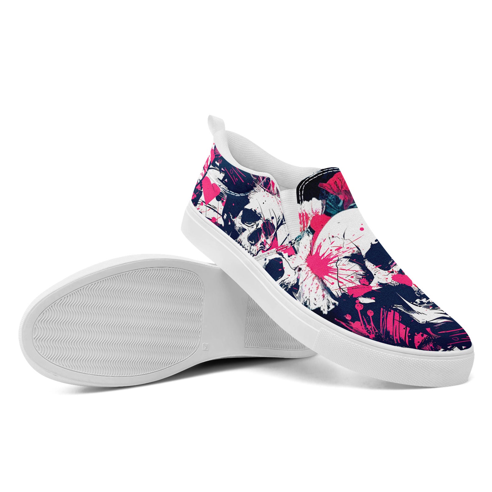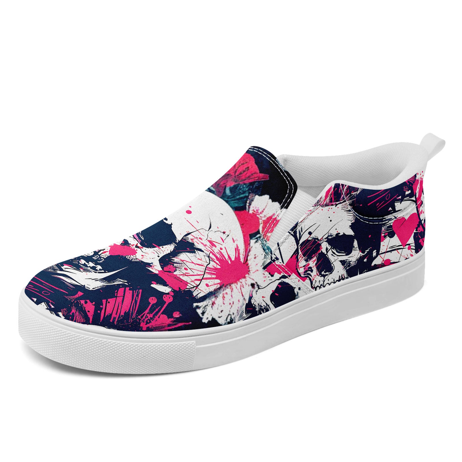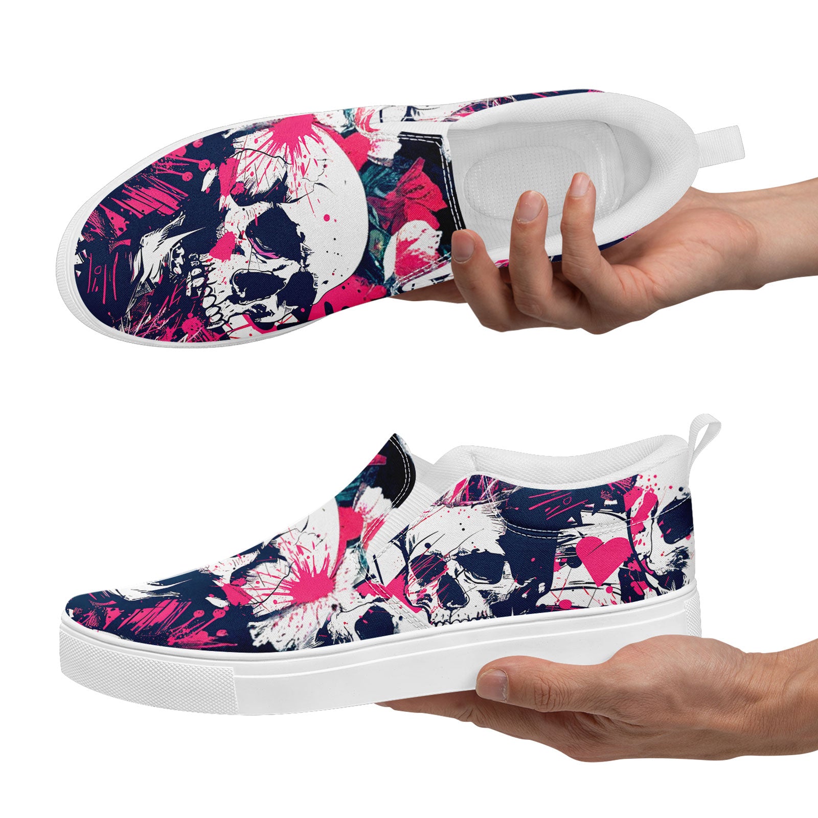 Floral Skull Slip-On Shoes | Pink & White Grunge Skull Art Canvas Sneakers
