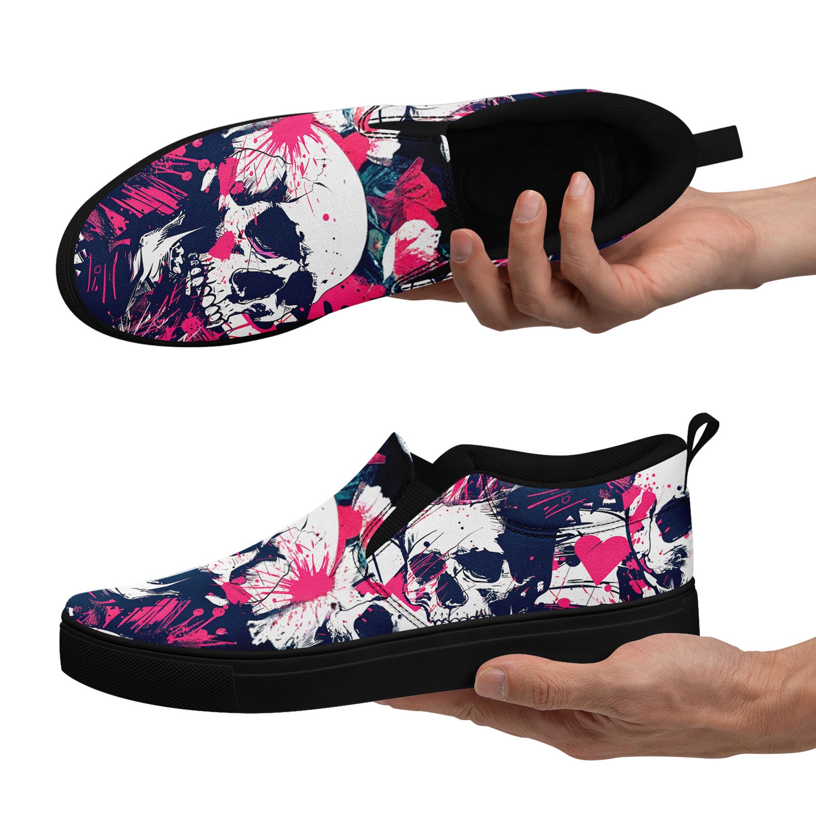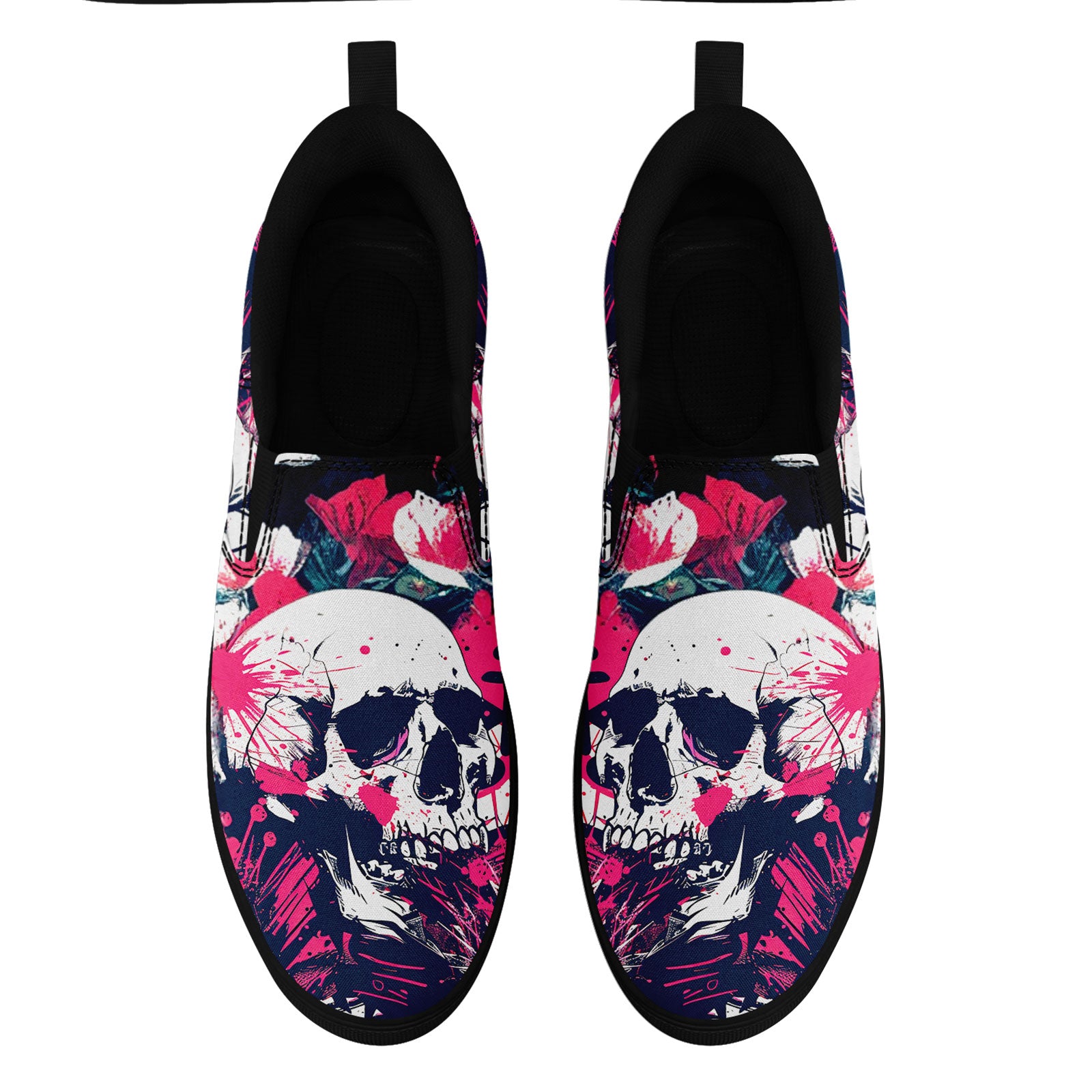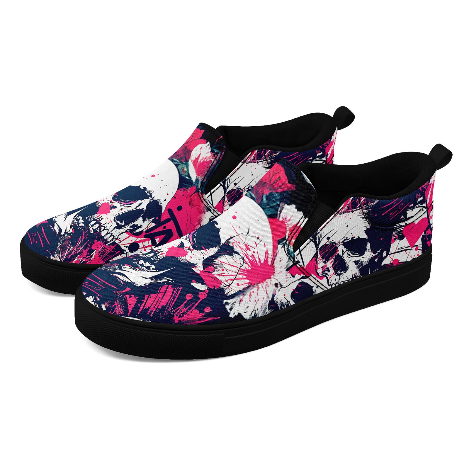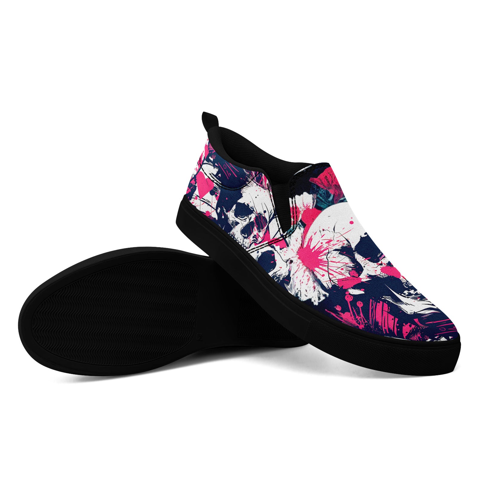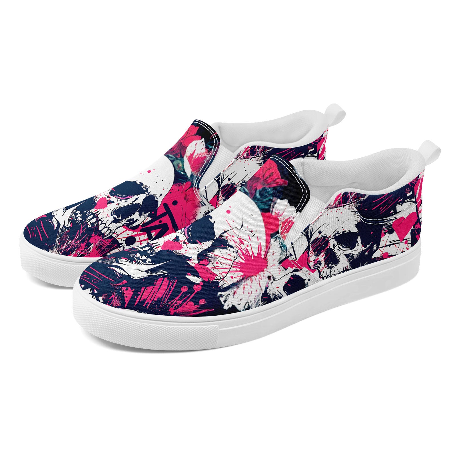 Floral Skull Slip-On Shoes | Pink & White Grunge Skull Art Canvas Sneakers
